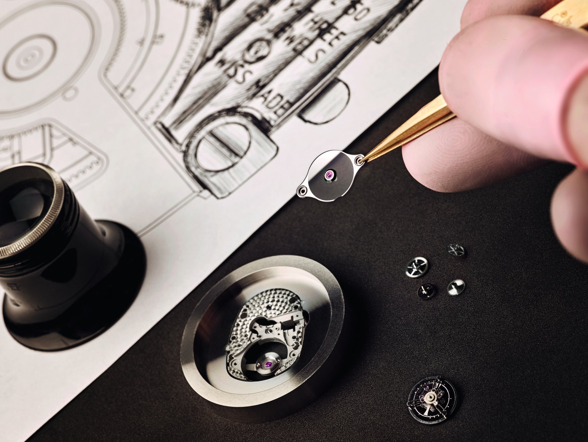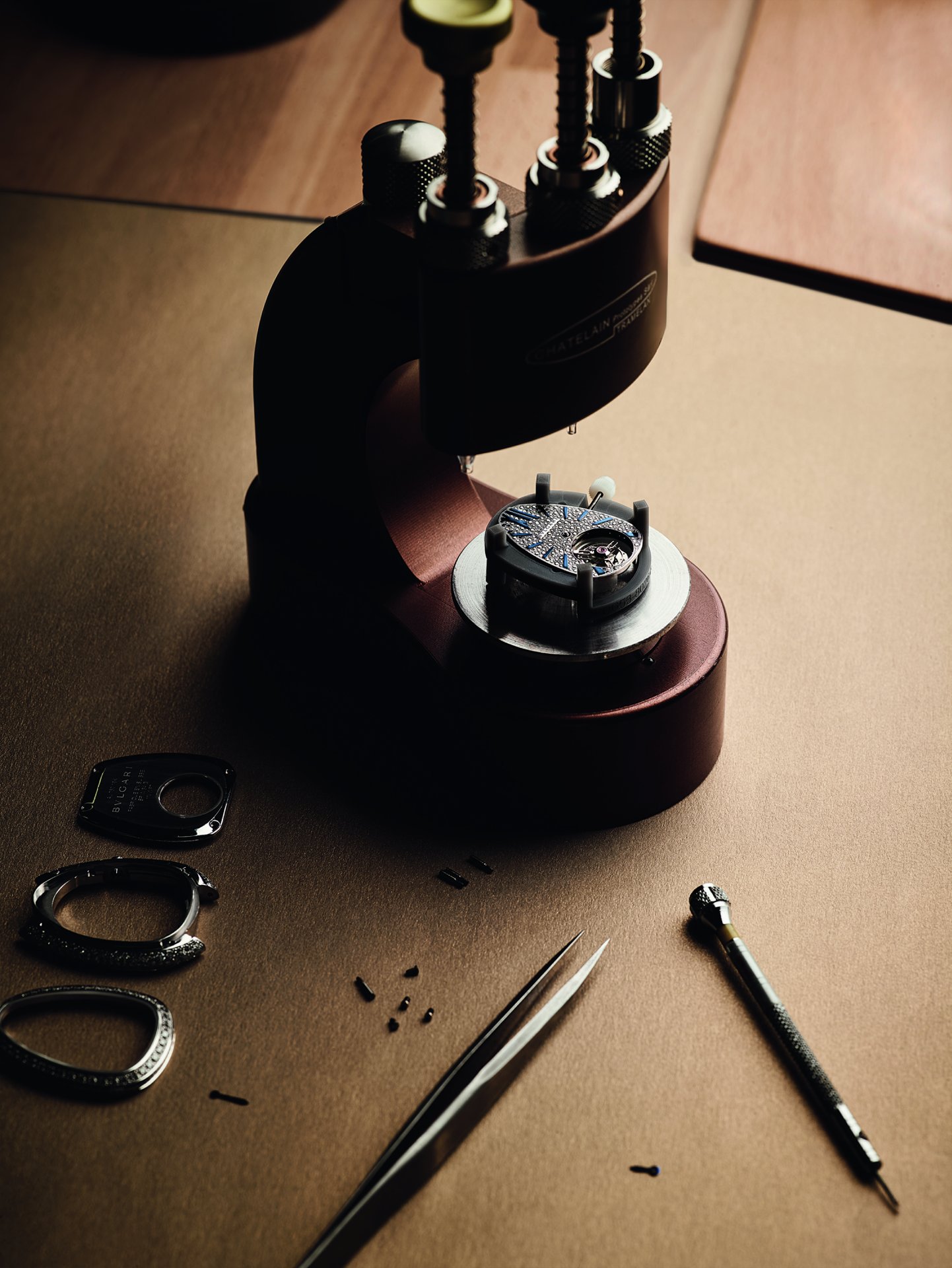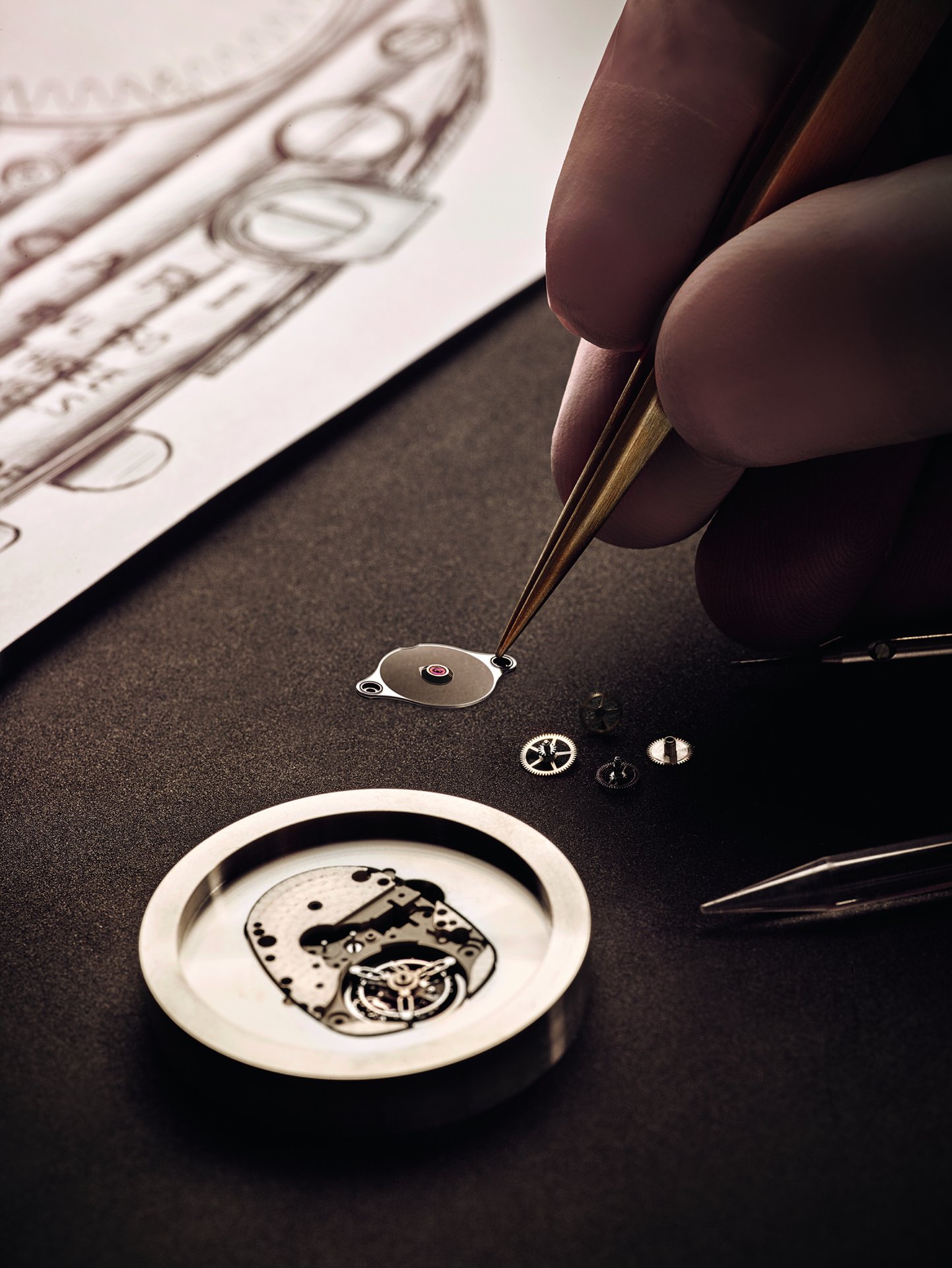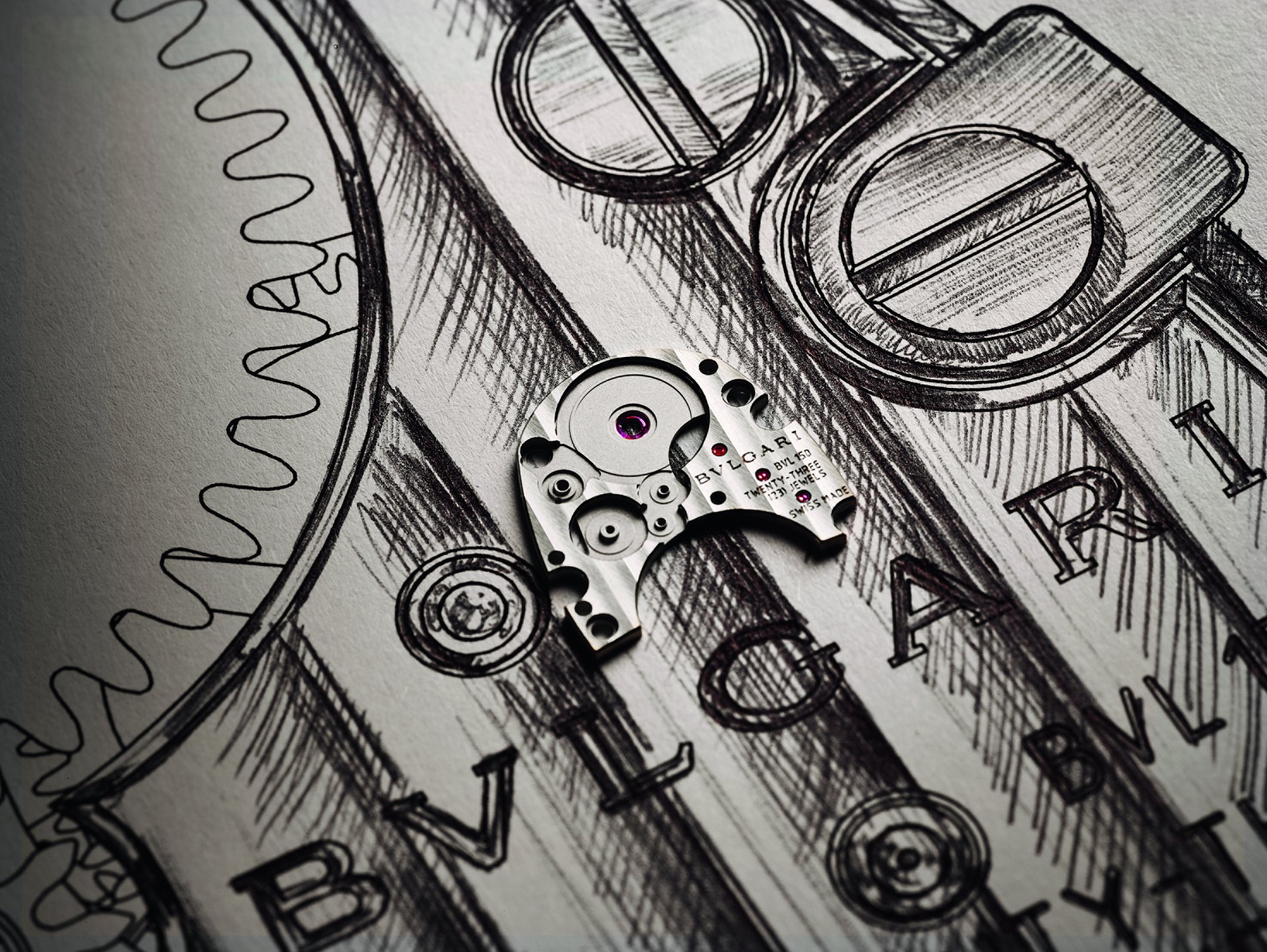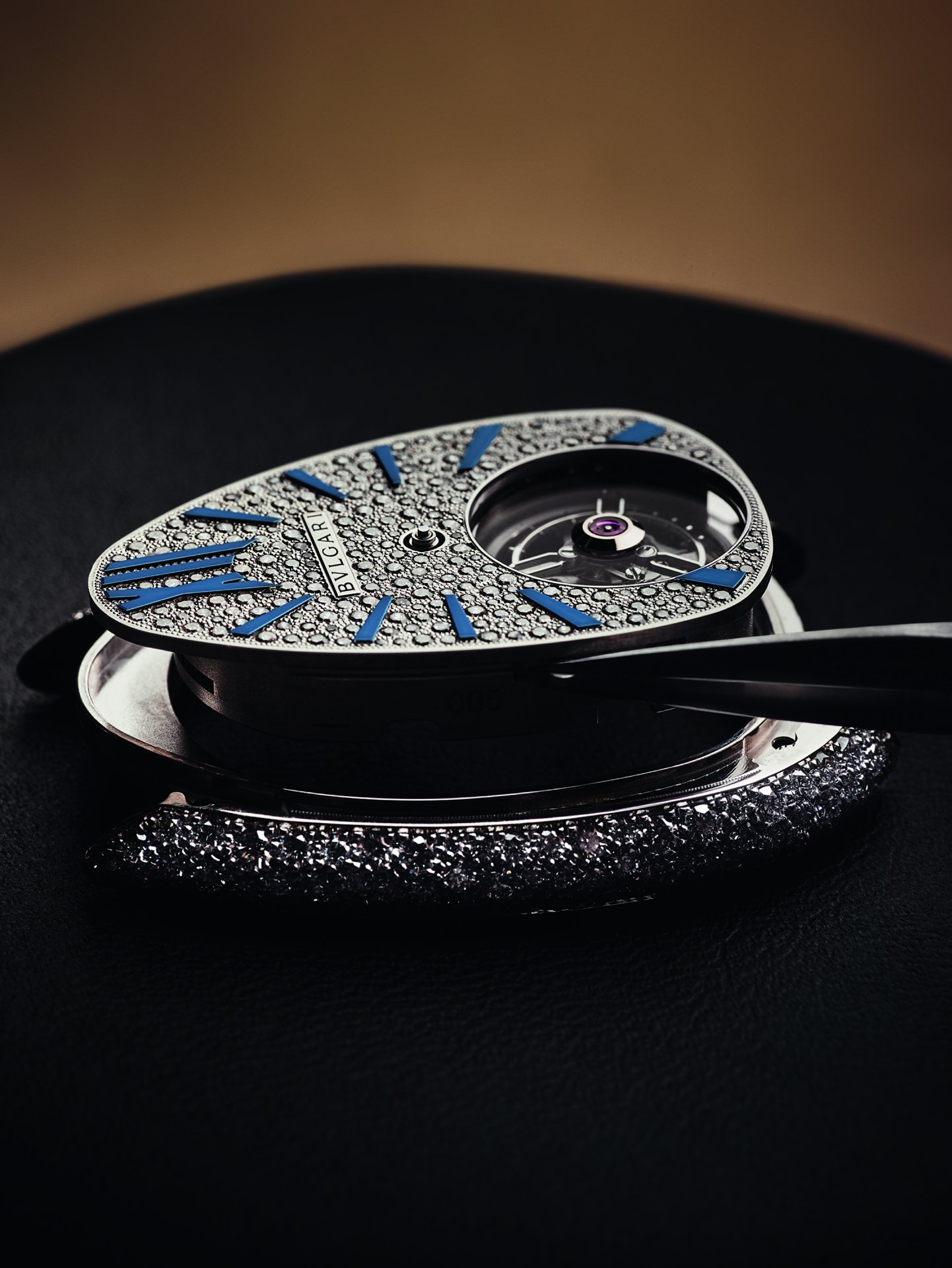 Designed to fit the Serpenti-shaped case, this small-sized shaped Haute Horlogerie movement is rhodium-plated, hand-decorated with Côtes de Genève, perlage and beveling, and features one sapphire bridge. Unlike other watchmakers, Bvlgari adapts the technical considerations to suit the aesthetics, and thus chose a transparent sapphire backcase at the level of the tourbillon to highlight the movement and decoration work, a winding stem inclined of 6 degrees, located between 2h and 3h, and special pavé setting to achieve as thin a case as possible.