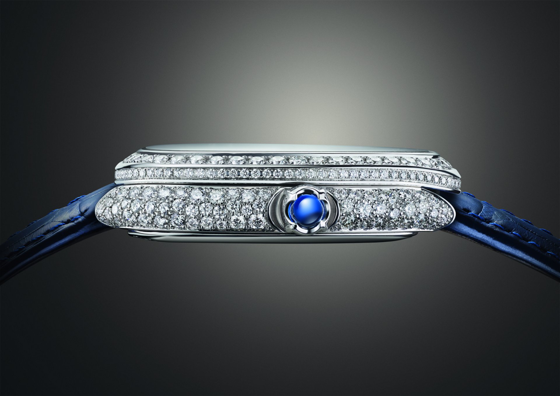 34mm 18kt white gold case, full snow set with round brilliant-cut diamonds. 18kt white gold crown set with a cabochon-cut sapphire (~0.27 ct). Case thickness: 8.90mm. Water-resistant up to 30m. Dial full snow set with round brilliant-cut diamonds.