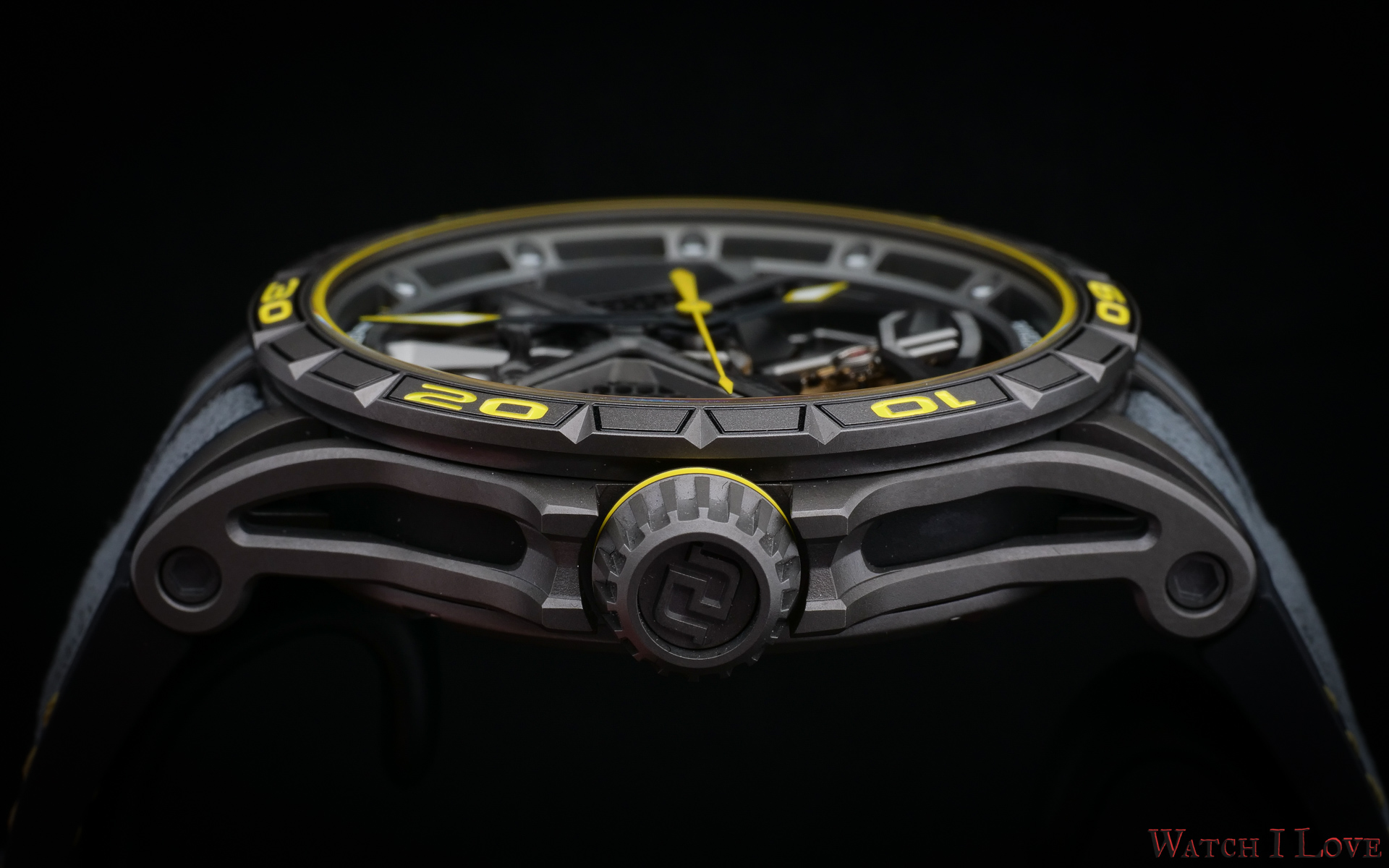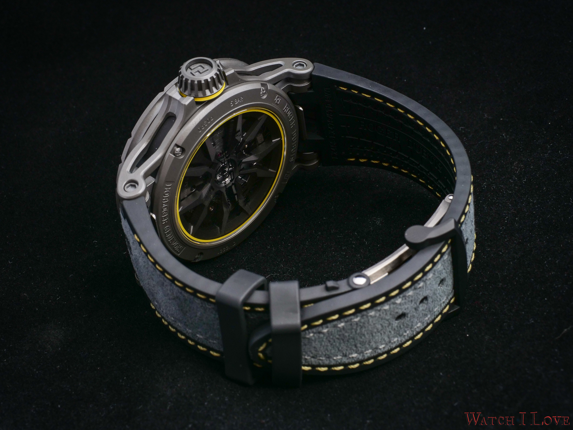The crown follows the high-performance design. For those familiar with the automobile’s mechanics, the shape of the crown resembles a wheel hub or a planetary gear. The titanium crown features a yellow rubber insert.