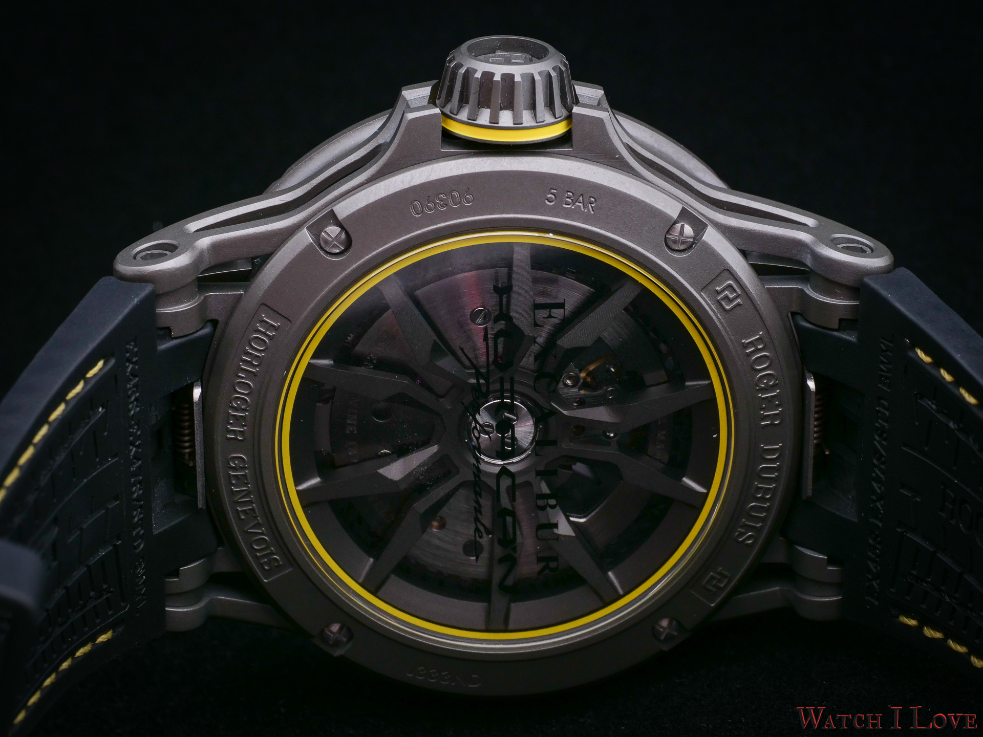 Under the sapphire crystal with anti-reflective treatment can be seen the skeletonised dial of the Excalibur Huracán Performante (the sapphire’s treatment creates the tint visible in the pictures). The dial doubles as an engine compartment. The skeletonisation reveals important components of the RD630 calibre.
