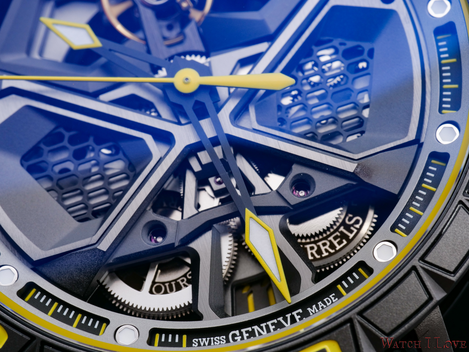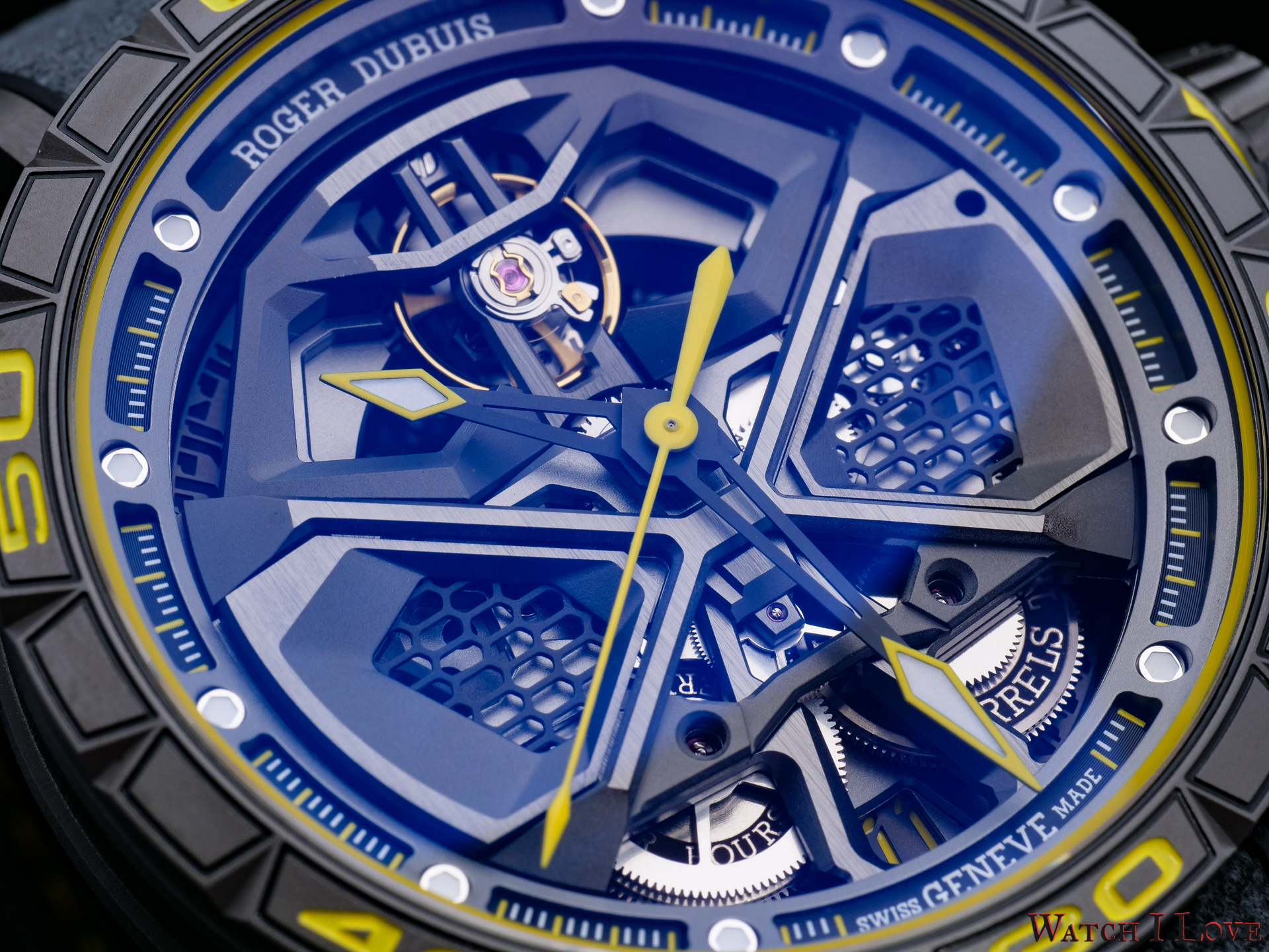 For the time display, Roger Dubuis uses 18k gold hours and minutes hands with a black PVD coating. The hands’ tips were decorated with a yellow transfer printed arrow and white luminous SLN. The central seconds’ hand is manufactured in aluminium and it received a yellow varnish coating. For hour indexes, the independent brand uses rhodium-plated indexes with hexagonal recess filled with white luminous SLN insert. For the minutes and seconds, the dial has an interesting register with white and yellow printed indices. The chapter ring bears the name of the brand on top and “Swiss Geneve Made” print – as a proud mention of the origin.