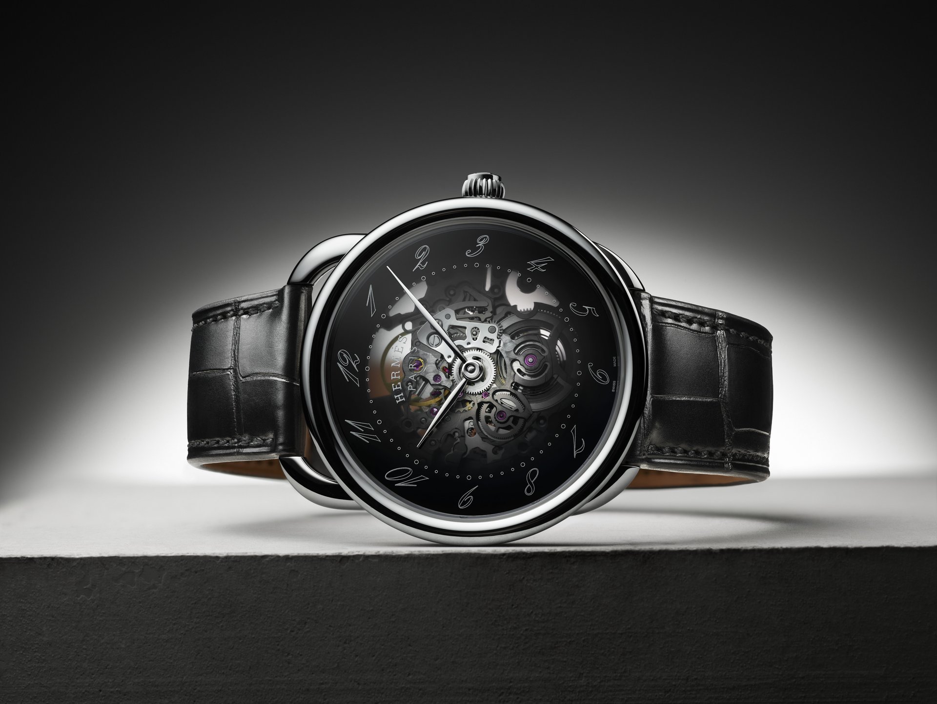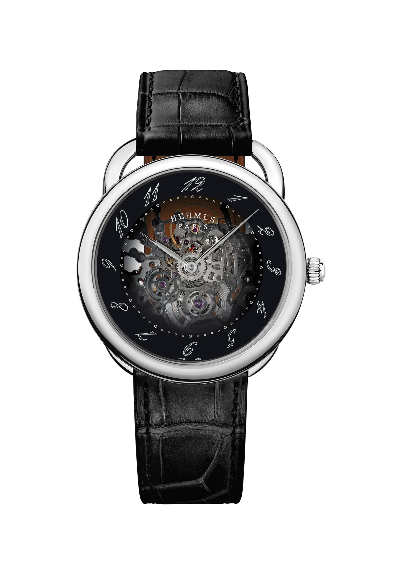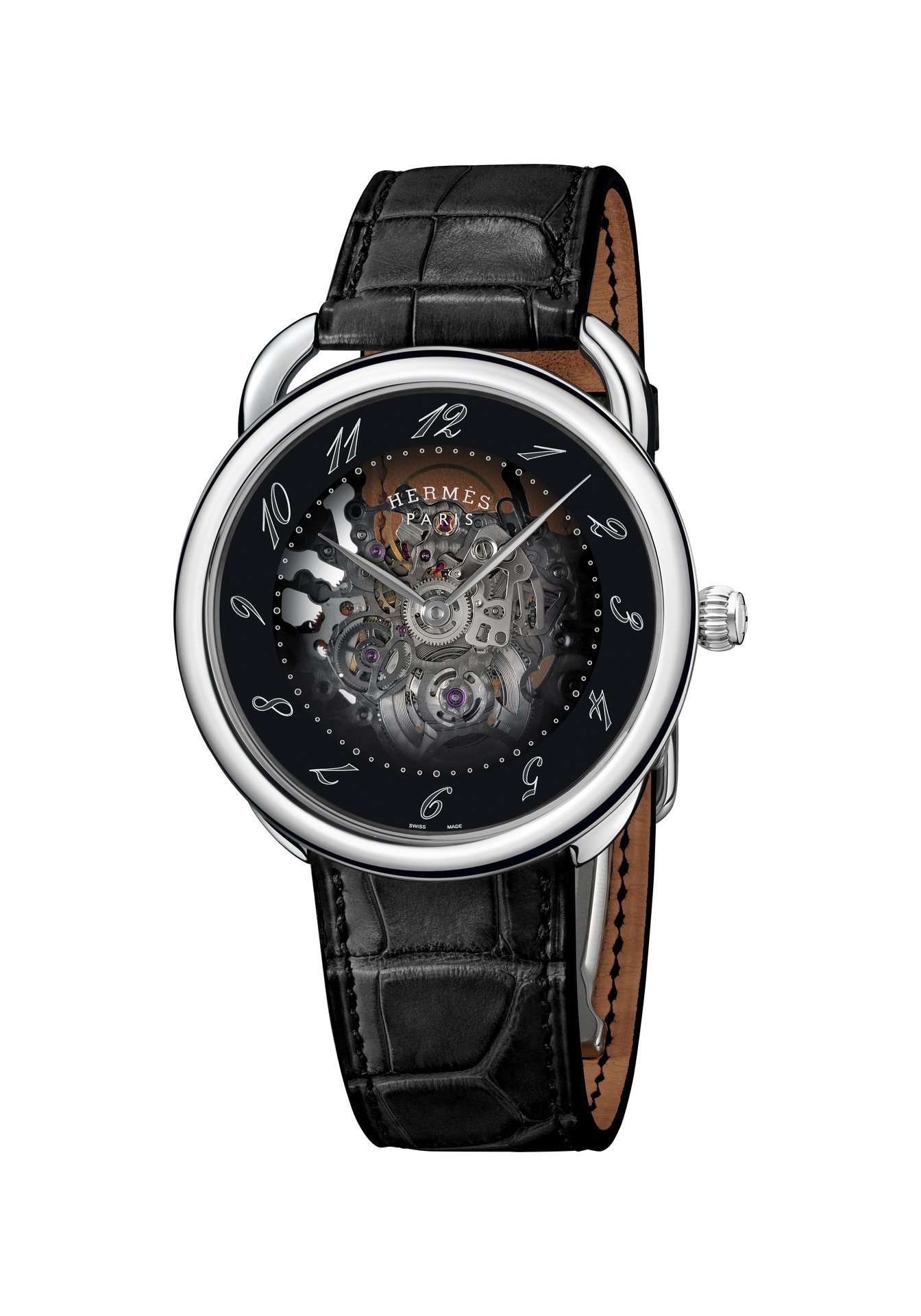 Hermes Arceau Squelette – The mysterious and enigmatic Arceau watch confines itself to essential: the mysteries of an elegance imbued with understated lightness. Its skeleton heart appears beneath a smoked crystal, punctuated by openwork numerals.
