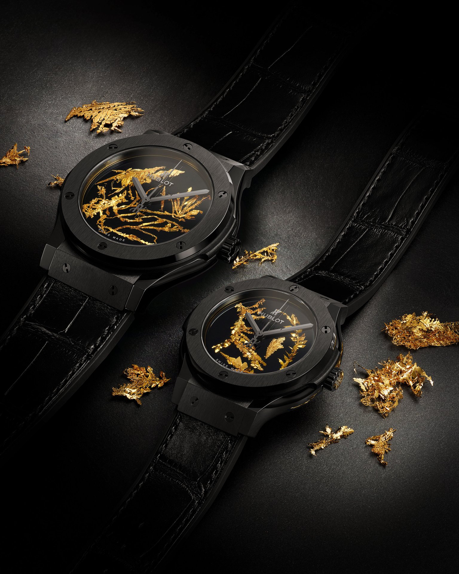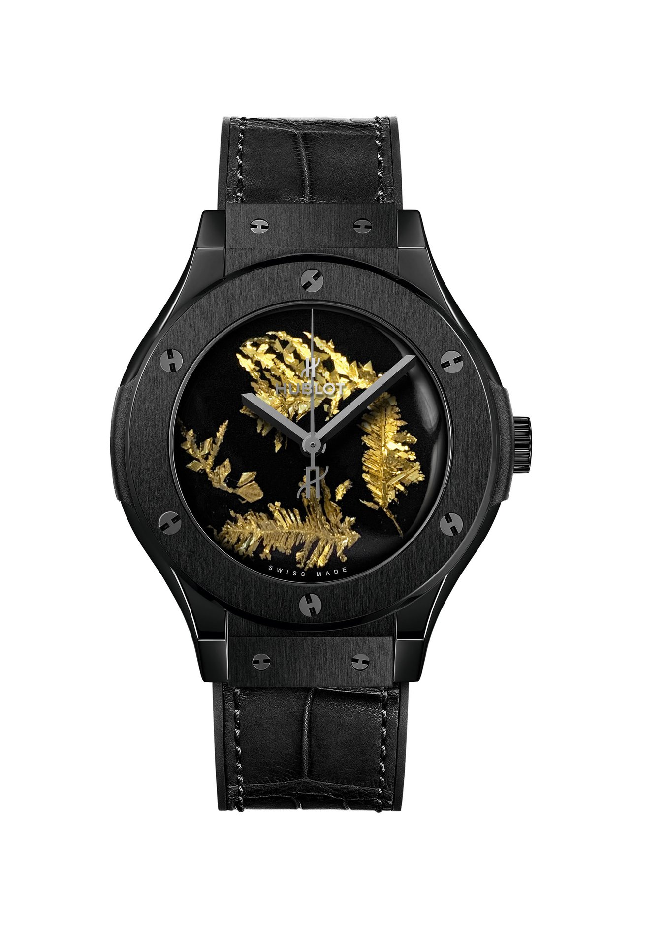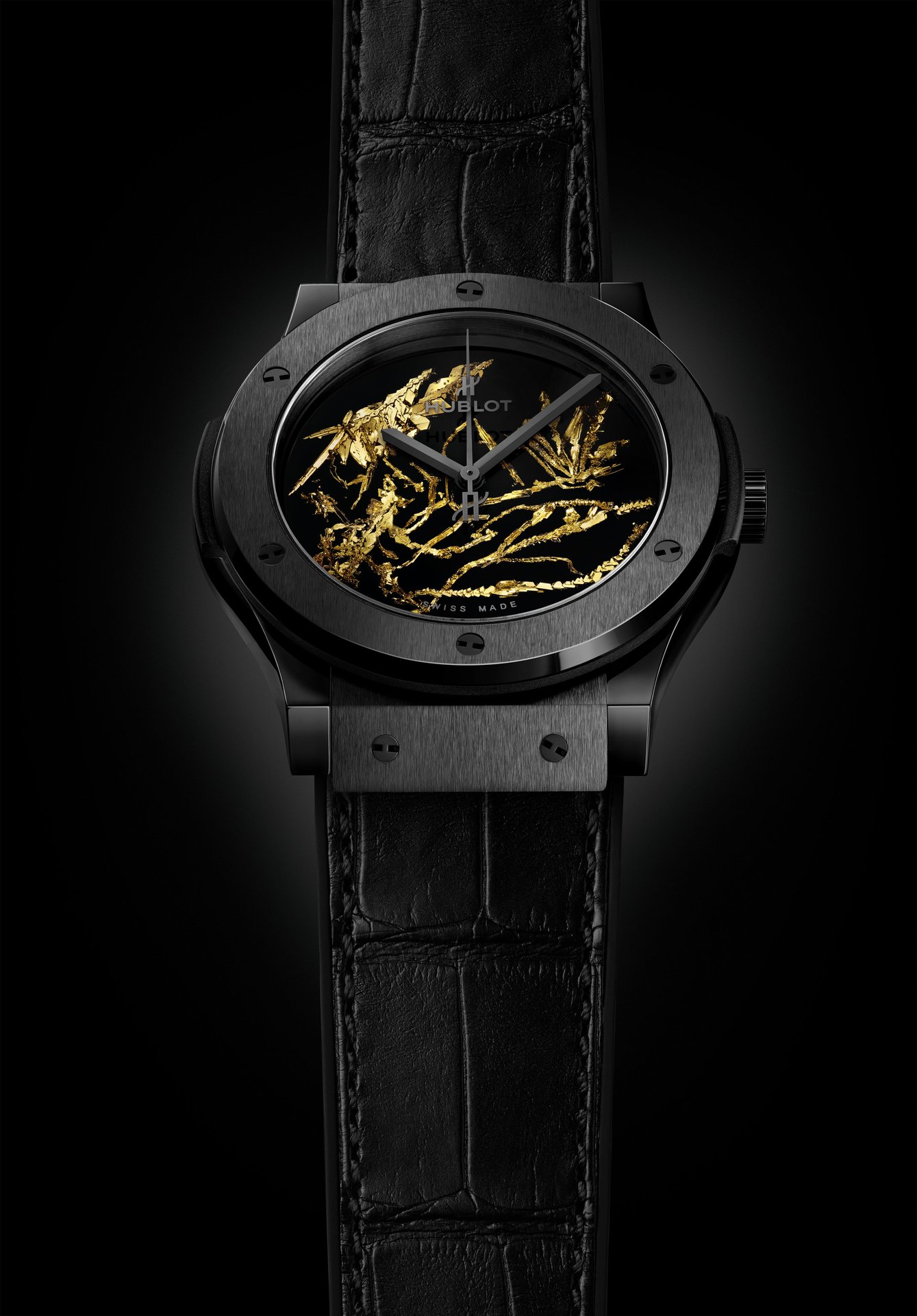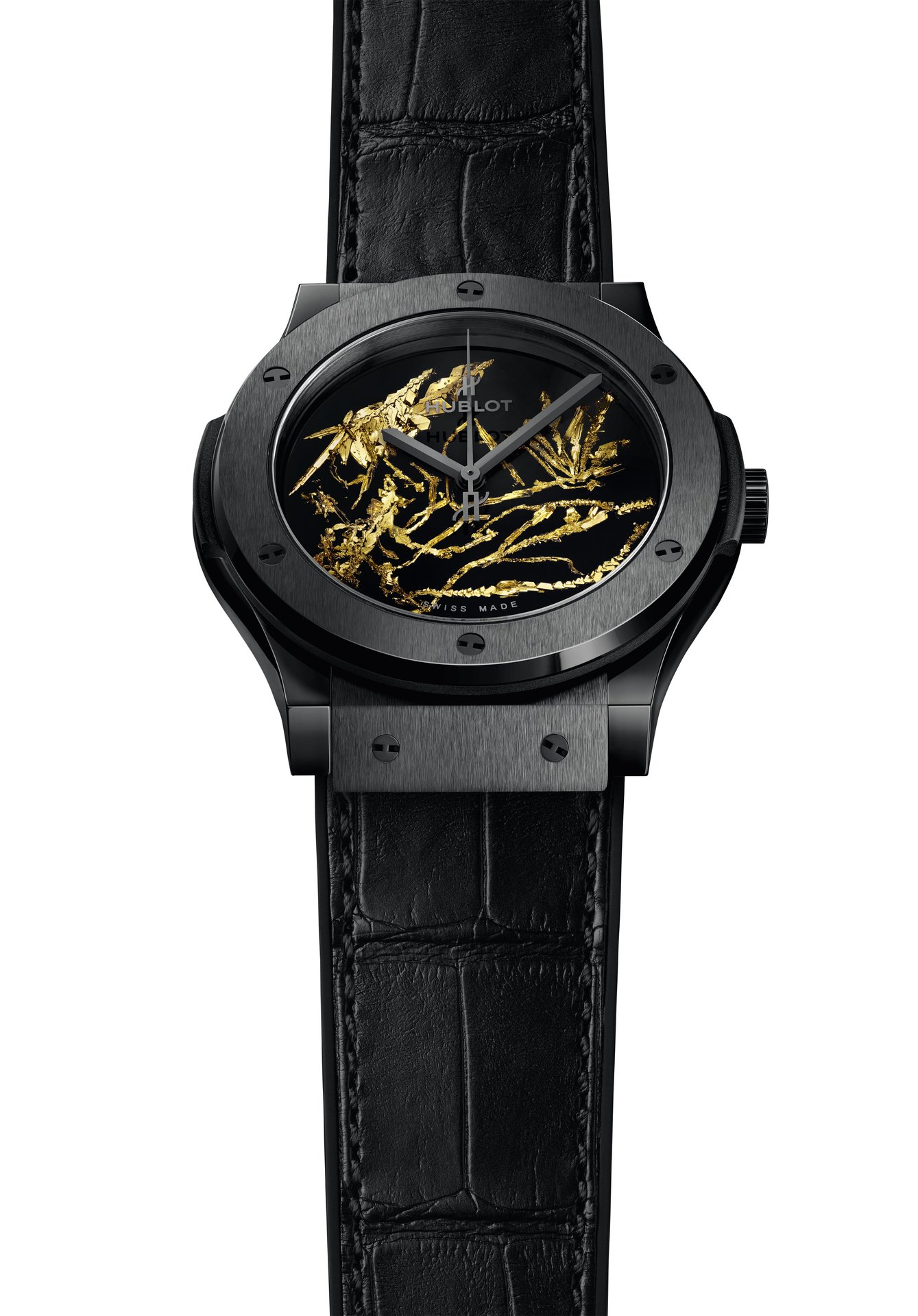 Unique, delicate and flamboyant, the dial of the Classic Fusion Gold Crystal is decorated with gold crystal made from flakes of gold. Like a precious work of art, which needs to be framed, the dial is fitted into the black ceramic case of a Classic Fusion Gold Crystal watch, available in 38 mm or 45 mm diameters. It houses the HUB1112 calibre, a mechanical movement with automatic winding and a 42-hour power reserve. A black alligator strap stitched onto rubber allows you to wear this rare object on your wrist.