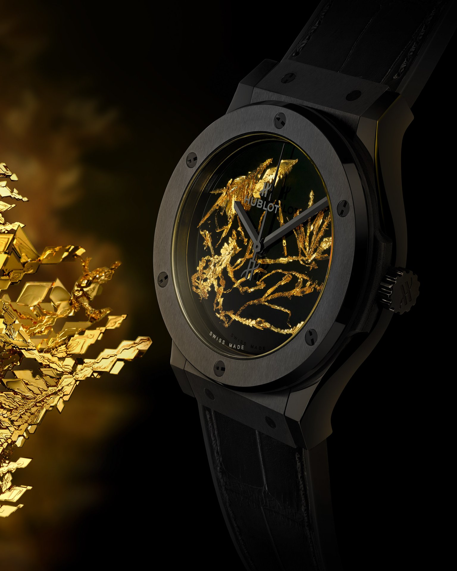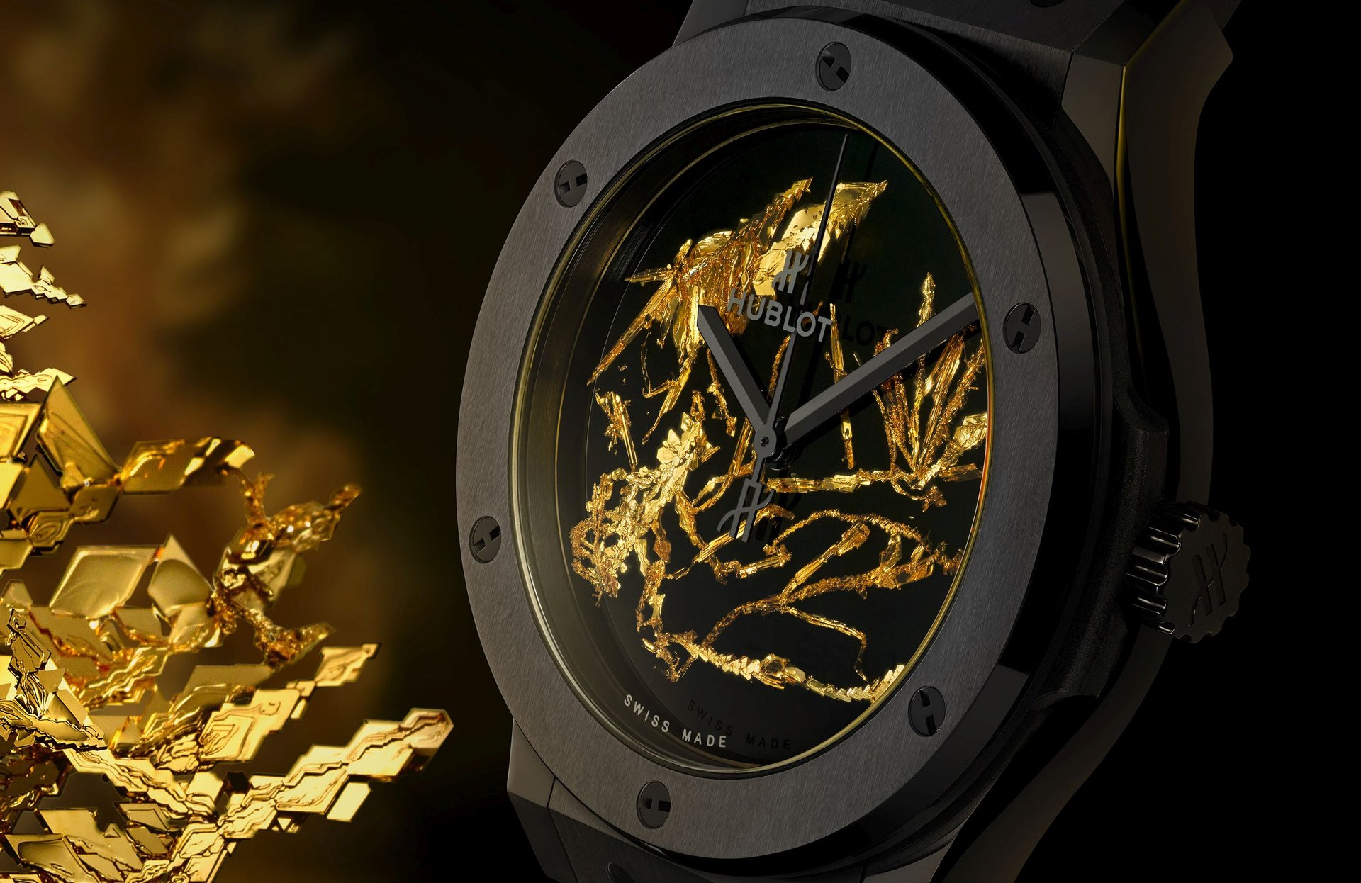 The Research and Development Department at the Hublot manufacture heats gold in the purest form possible—24 carats—to melting point, which creates emanations of gold that we could compare to steam carrying atoms of gold. These particles rise through this emanation, then set in a crystalline form when they reach the cold surface. They agglomerate there as crystals with completely random shapes that are never the same twice.