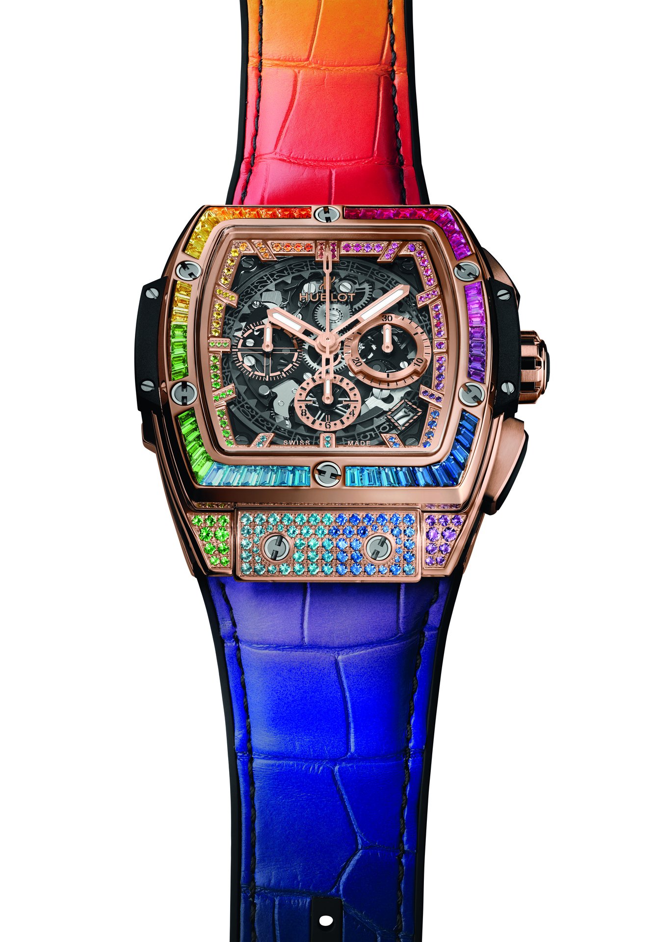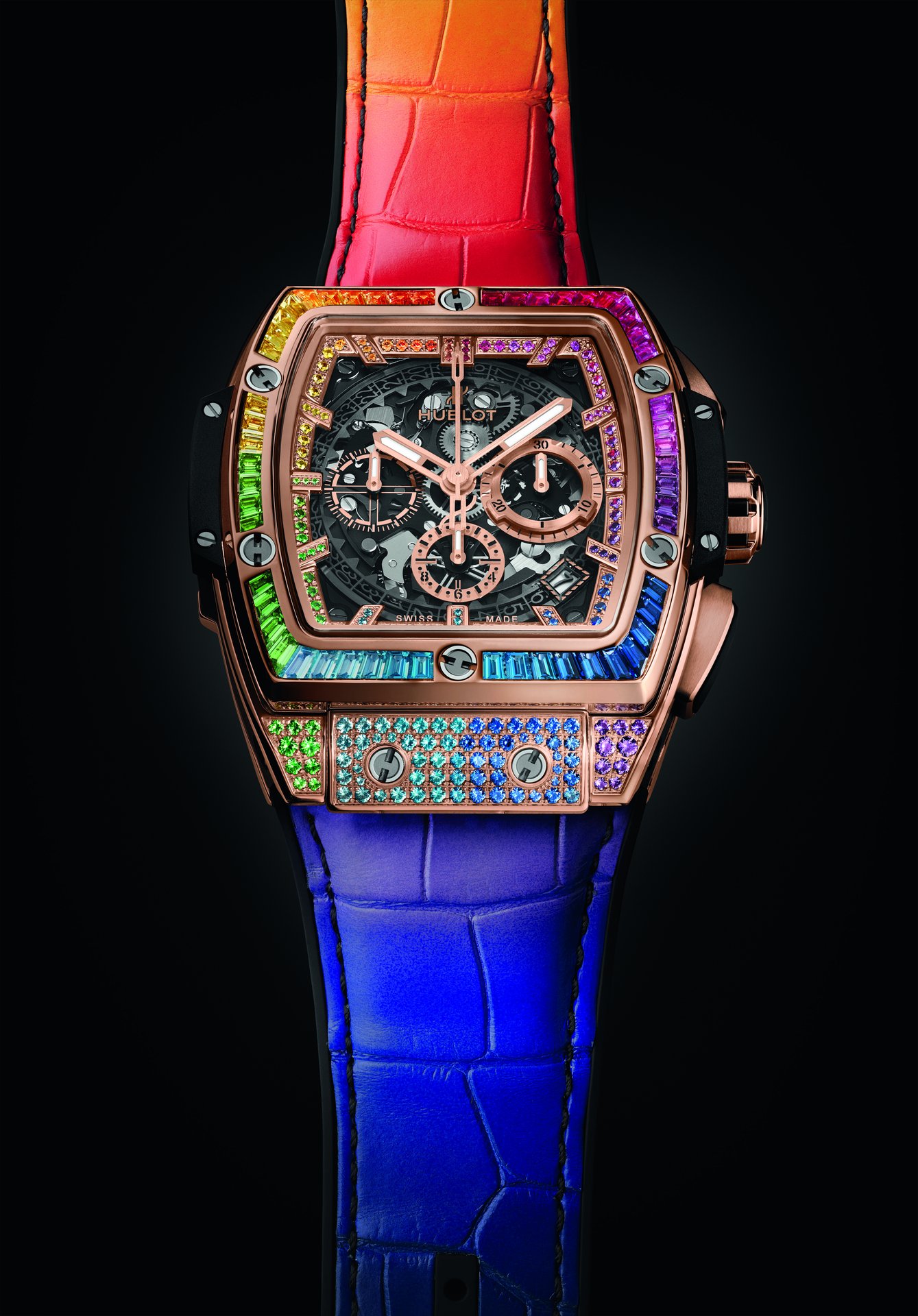 After the Big Bang, it’s now the Spirit of Big Bang’s turn to take on the colours of the Rainbow! The soft shade of the cases in King Gold takes on the colours of the rainbow with a shimmering paving of round and baguette-cut gemstones. On the 42-mm Spirit of Big Bang Rainbow, the hour hand clasps the chronograph skeleton movement like the claws of a precious setting, while sapphires, rubies, topazes, tsavorites and amethysts entirely cover the dial of the 39-mm model with sparkling reflections.