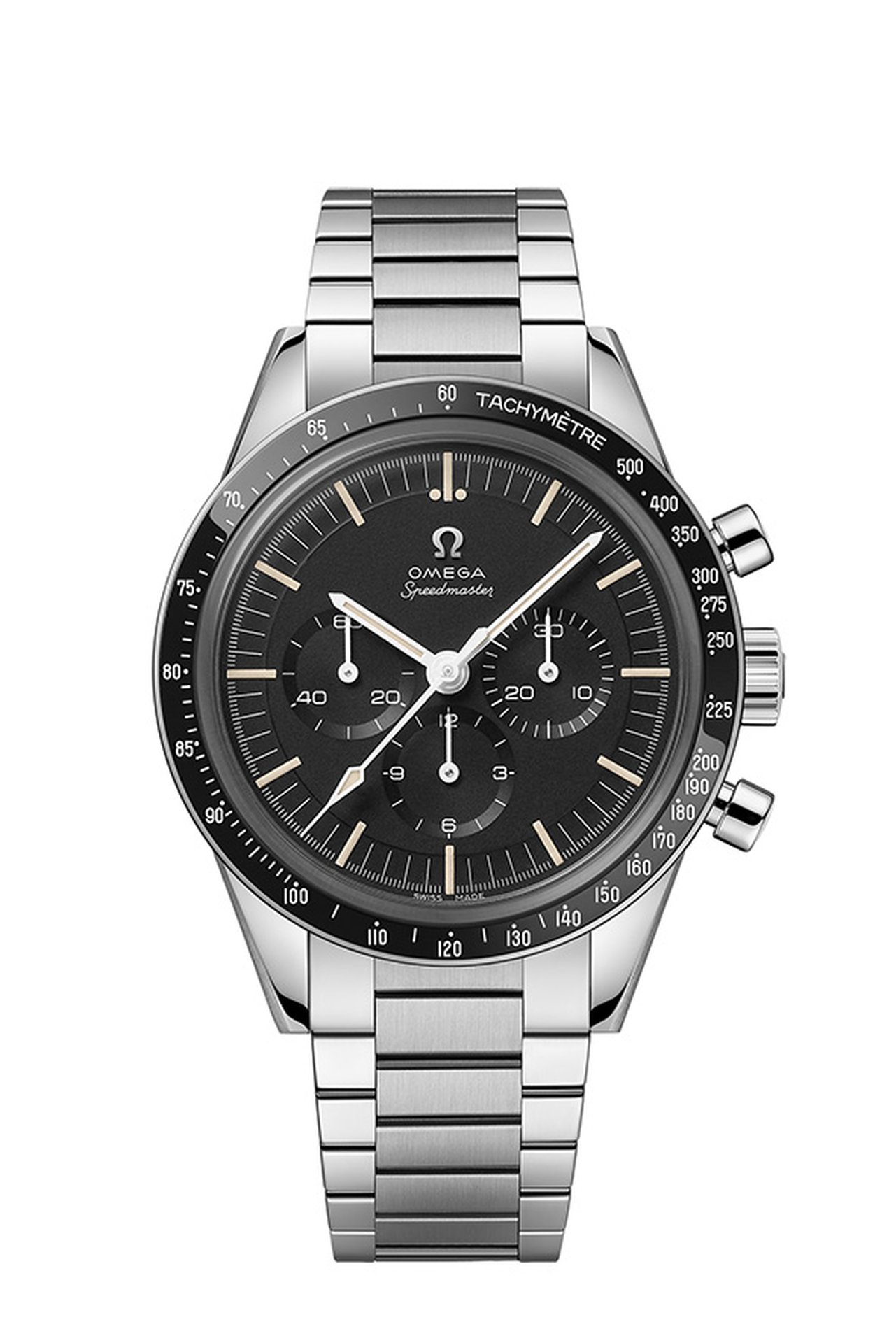 The 39.70 mm case in stainless steel, influenced by the same 3rd generation style that Ed White wore, features a bezel ring in polished black ceramic [ZrO2] with a tachymeter scale in white enamel. Gracing the black step dial are the familiar Moonwatch hands, small seconds sub-dial, 30-minute recorder and 12-hour recorder, and central chronograph hand.