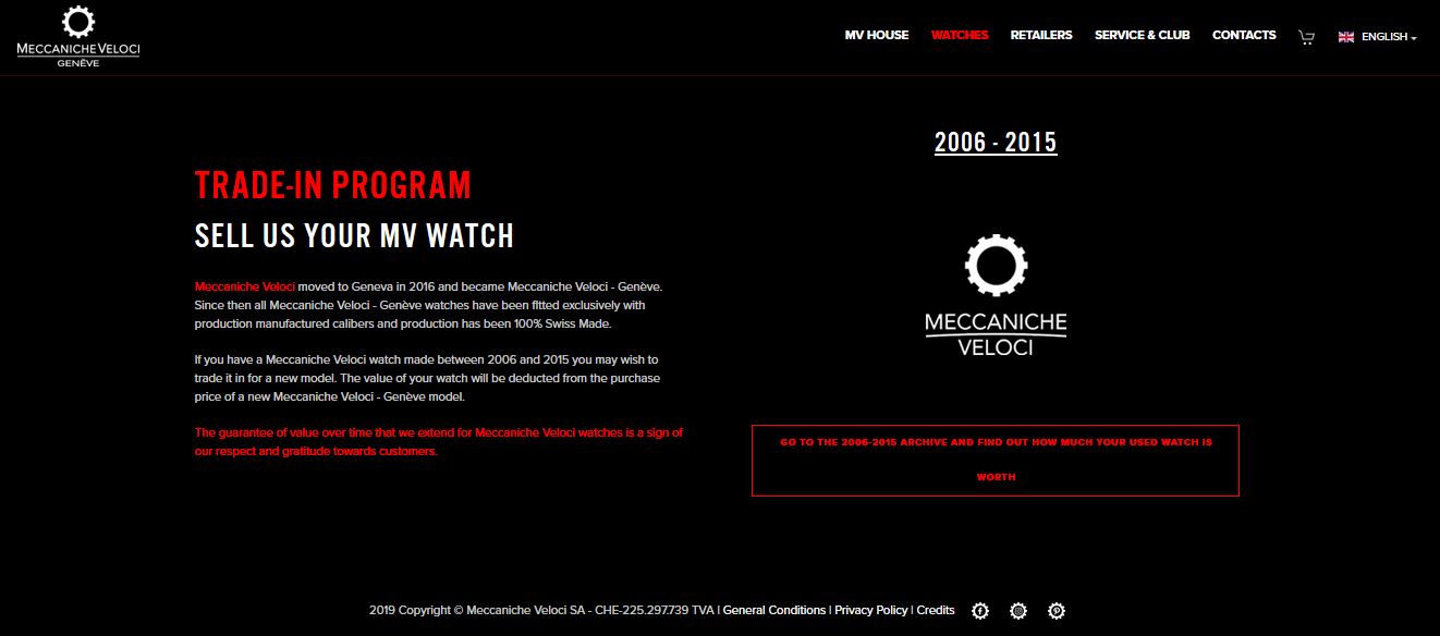 Meccaniche Veloci is launching its Trade-In Program via the updated website www.meccanicheveloci.com, which now incorporates a section dedicated to re-purchasing its watches produced between 2006 and 2015.