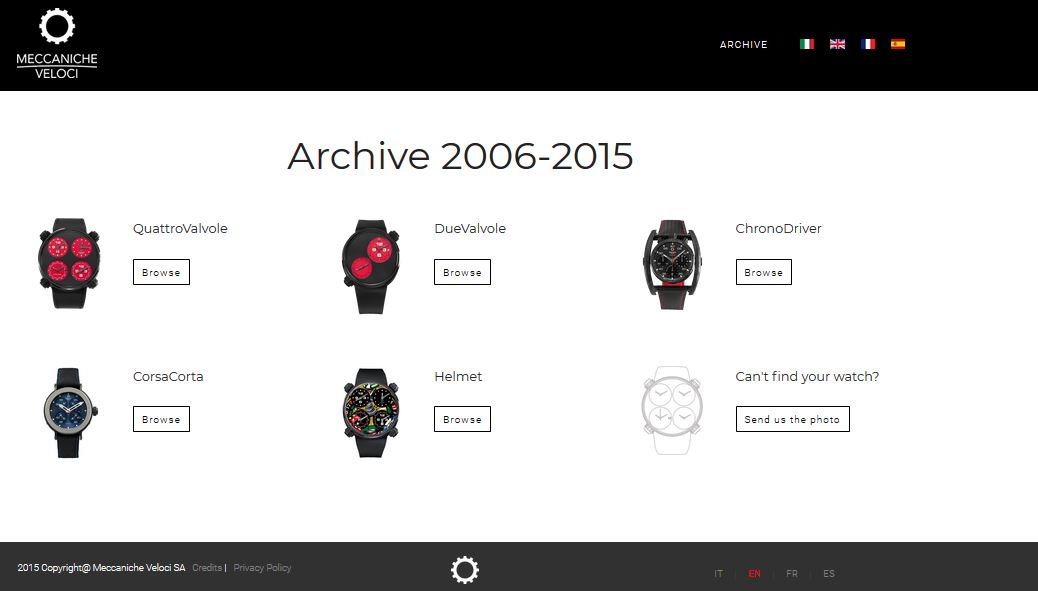 The archive is extremely comprehensive and offers a journey back in time through the history of Meccaniche Veloci. If the desired model does not feature among those illustrated, the website has a function whereby it is possible to upload a picture of your Meccaniche Veloci timepiece and receive a valuation.