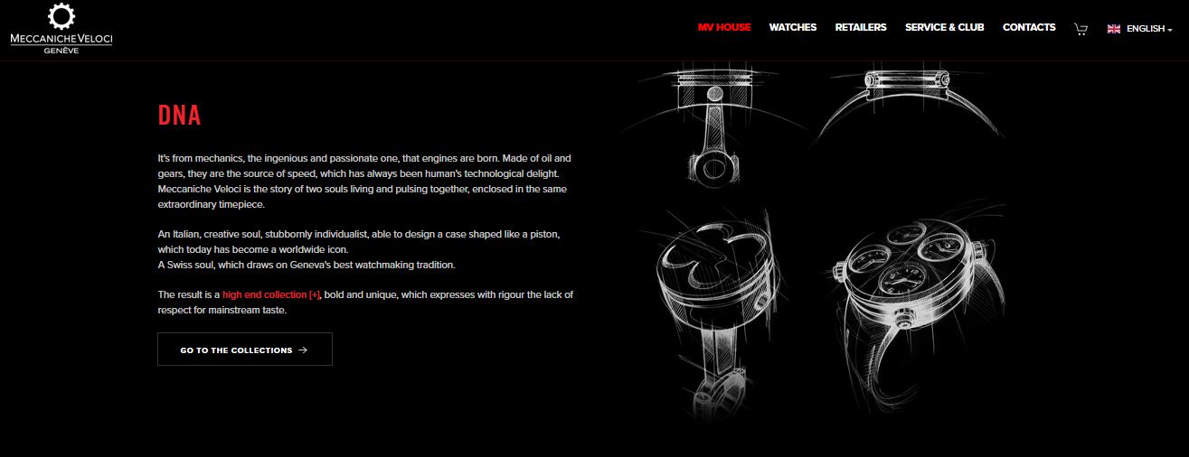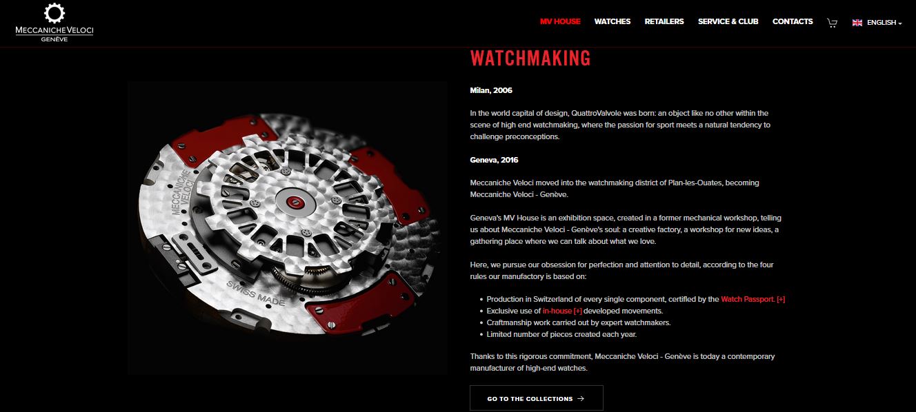 In 2016, the company moved to the watchmaking district of Plan-les-Ouates in Geneva, becoming “Meccaniche Veloci – Genève” and creating timepieces with a distinctive aesthetic and technical content developed in-house. The profile of the cases in the Icon and QuattroValvole collections is inspired by the distinctive shape of engine pistons.