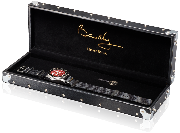 The watch is offered as a limited edition with Brian’s signature on the case back and comes with a special presentation box designed on the lines of the Red Special’s custom flight case.