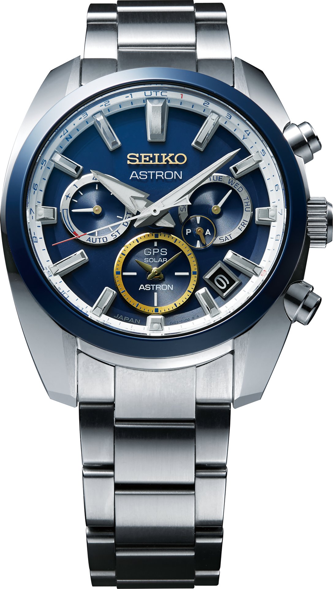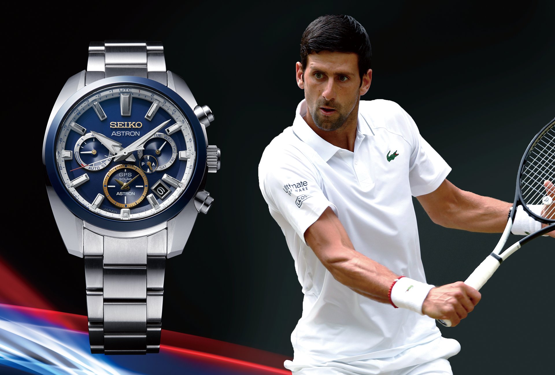 Novak is as proud to be Serbian as Seiko is to be Japanese. The design of Novak’s new Astron GPS Solar watch reflects, in a way that is quietly light-hearted, the affection in which both Novak and Seiko hold their home nations. Red and white are colors shared by both flags and they are used in every detail, along with the deep blue that is also central to the Serbian flag and denotes ‘‘victory’’ in Japanese culture. The time zones of Serbia and Japan are highlighted in red on the UTC indicator ring at the +1 and +9 positions respectively, the dial ring is in white and the ceramic bezel is in blue with a thin red line within it. The use of color as symbol continues in the gold of the hands and minute track on the dual-time sub-dial, reflecting the heights of Novak’s achievements on the tennis courts of the world.