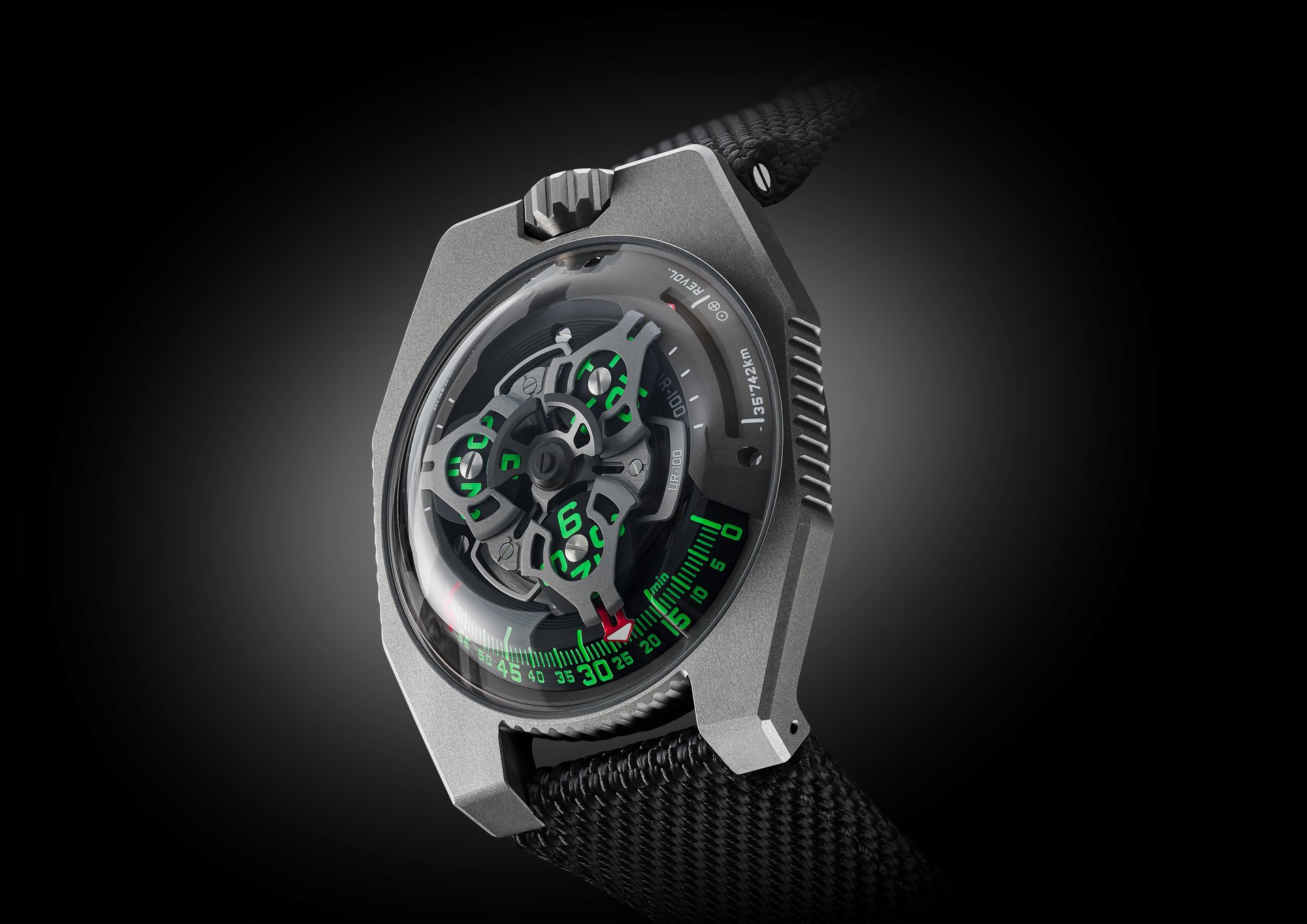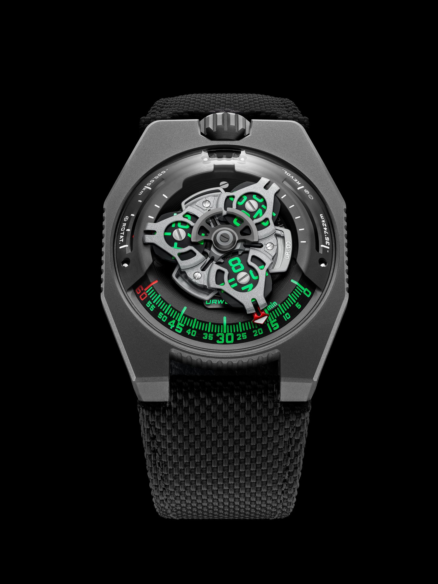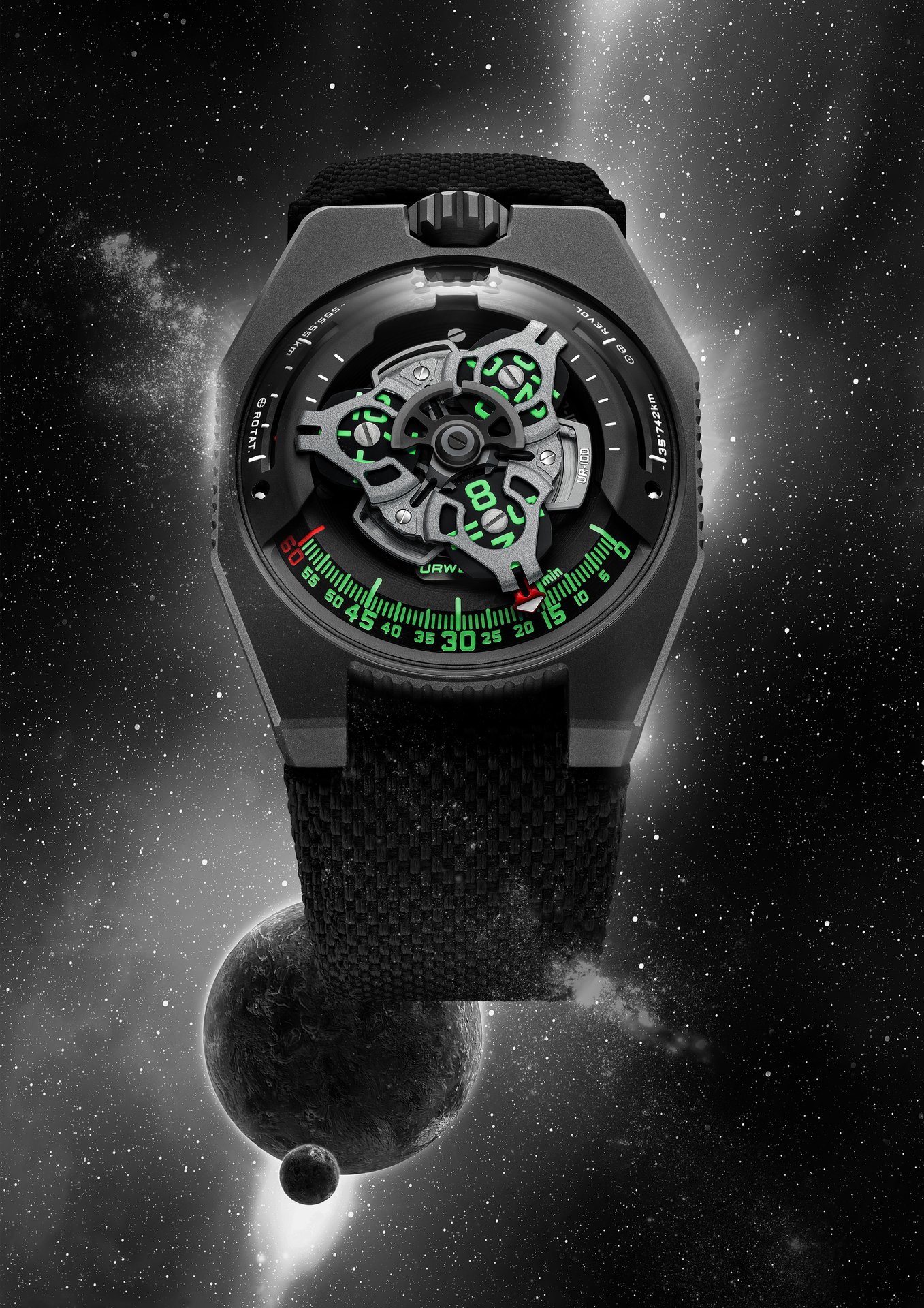 In addition to URWERK’s trademark satellite configuration of the wandering hours and minutes, the UR-100 GunMetal brings your spin through space into sharp focus. When the minutes hand has completed its 60-minute journey, it reappears on a 20-minute scale of 555 kilometres. This is the distance you travel in 20 minutes if you are standing on the equator of our rotating planet. The opposite scale tracks your journey through space around the sun: 35,740km every 20 minutes.