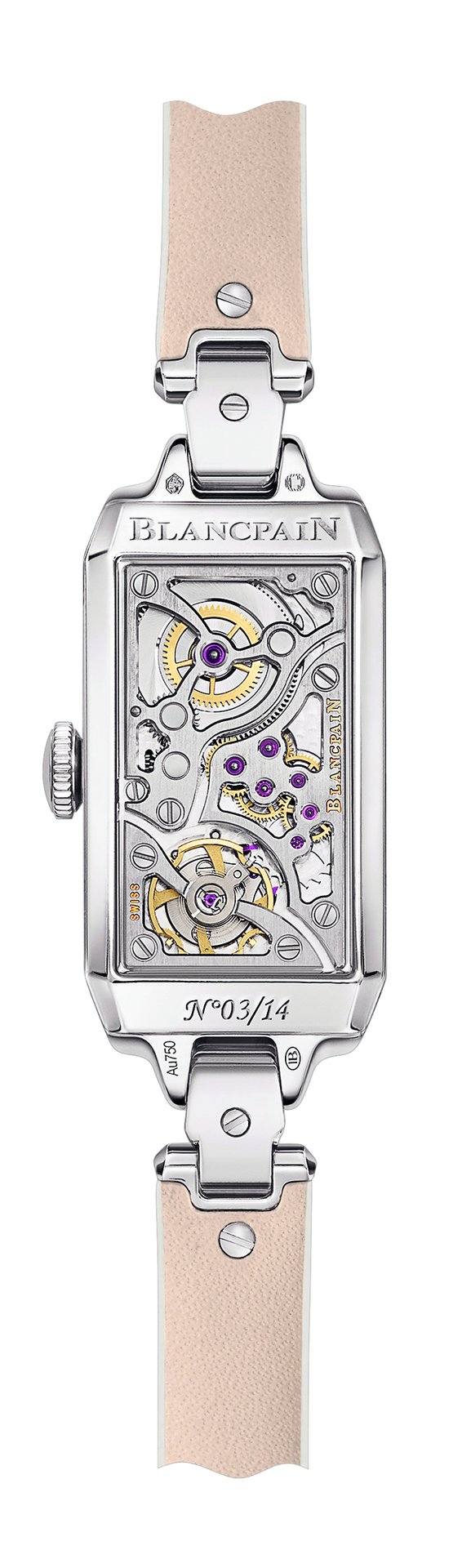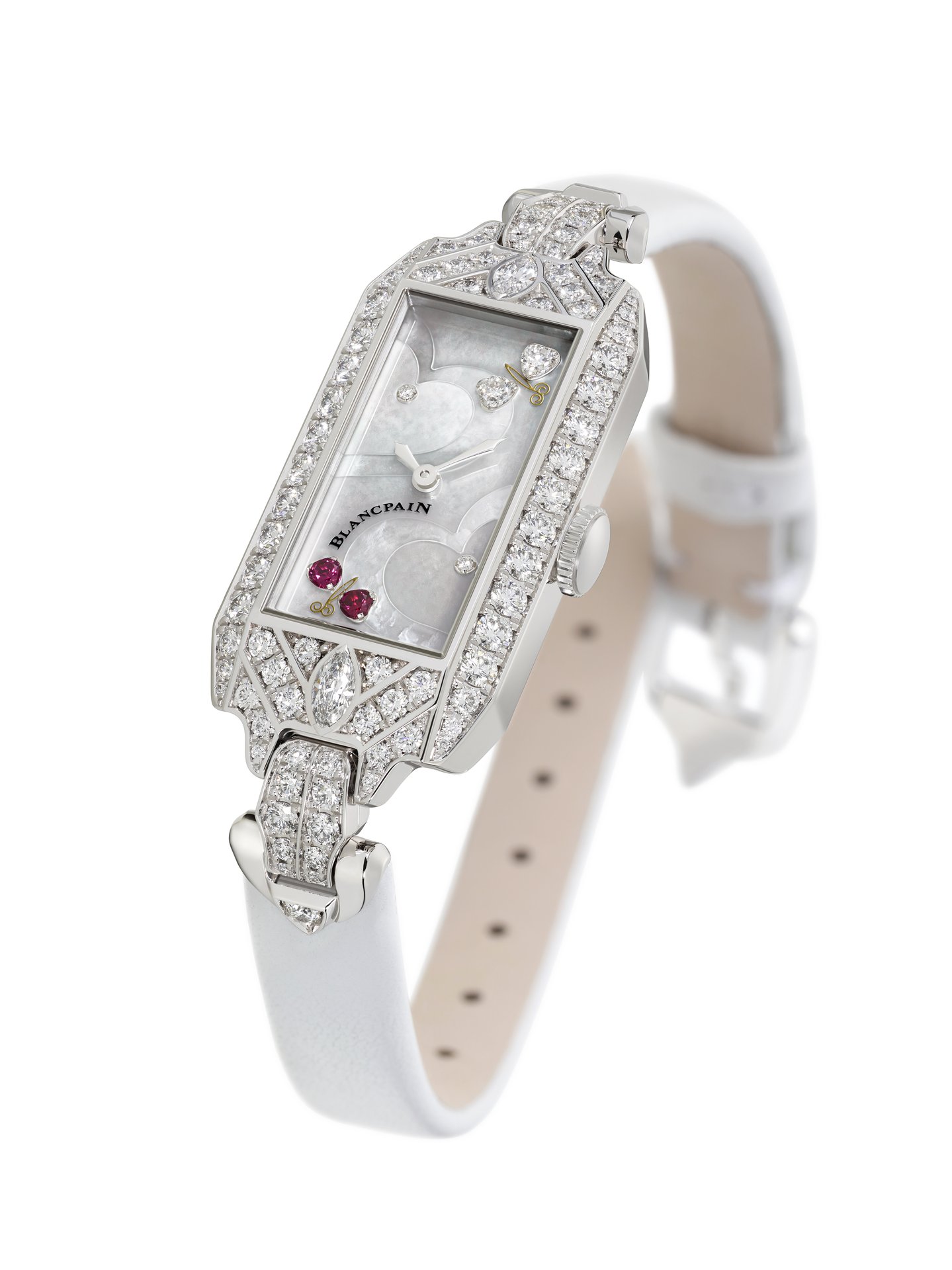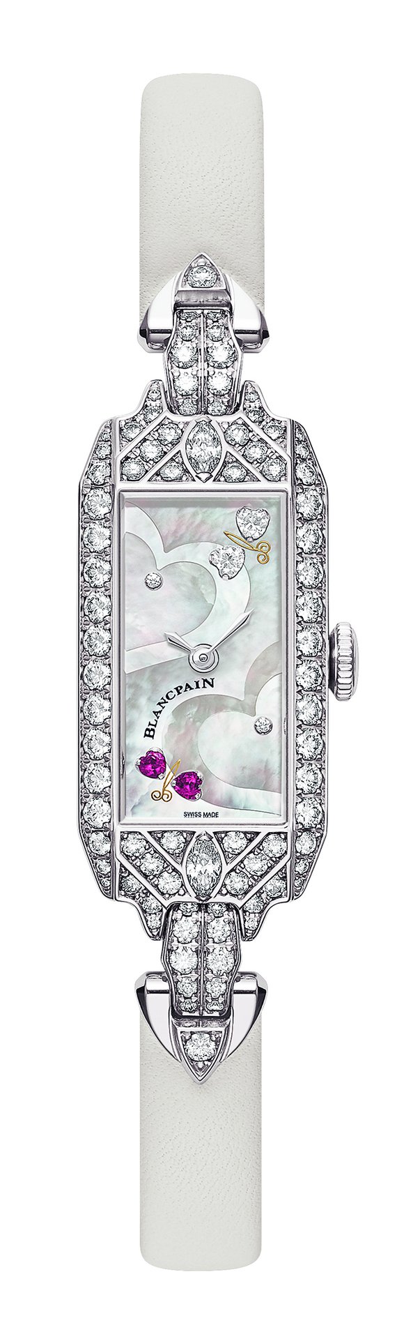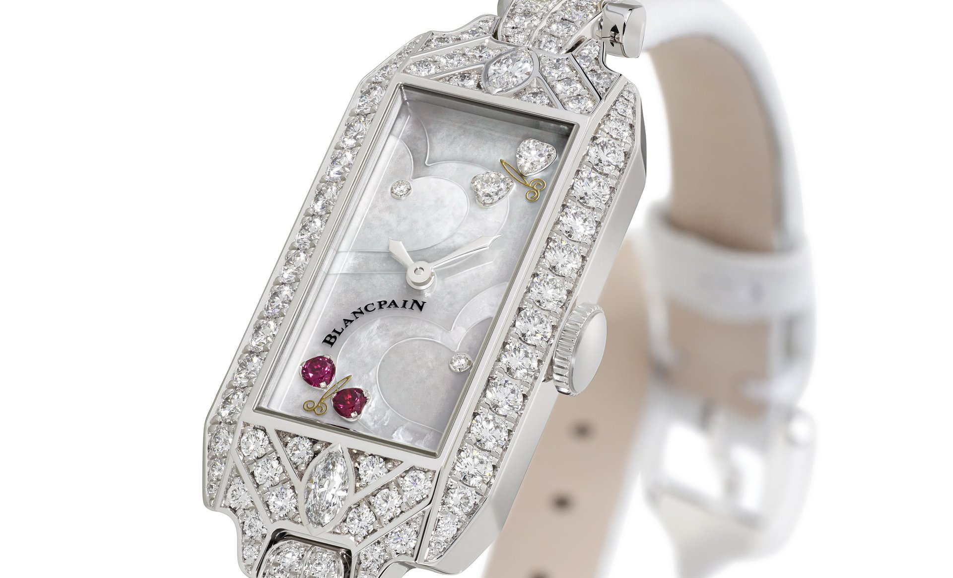 For Blancpain, Valentine’s Day is a celebration, which every year witnesses the creation of a limited series of feminine timepieces dedicated to love. Blancpain Reference 0091-19R54-63A, a veritable jewel, the 2020 edition is inspired by a stunning Blancpain evening watch once owned by the inimitable Marilyn Monroe. Its rectangular white gold Art Deco style case is set with 84 diamonds, sometimes in superposed rows, including two generous marquise-cut gems; while its mother-of-pearl dial, inlaid with two hearts, is adorned with two brilliant-cut diamonds and two precious butterflies made of diamond and ruby hearts. The beauty of this timepiece also lies in its rectangular calibre 510, a major new addition to the Blancpain collection. The curves of the latter, along with the symmetry between its balance-wheel and its barrel lend both delicacy and visual equilibrium to this two-tone mechanical movement, while the chamfered finish of its bridges adds a soft and light touch.