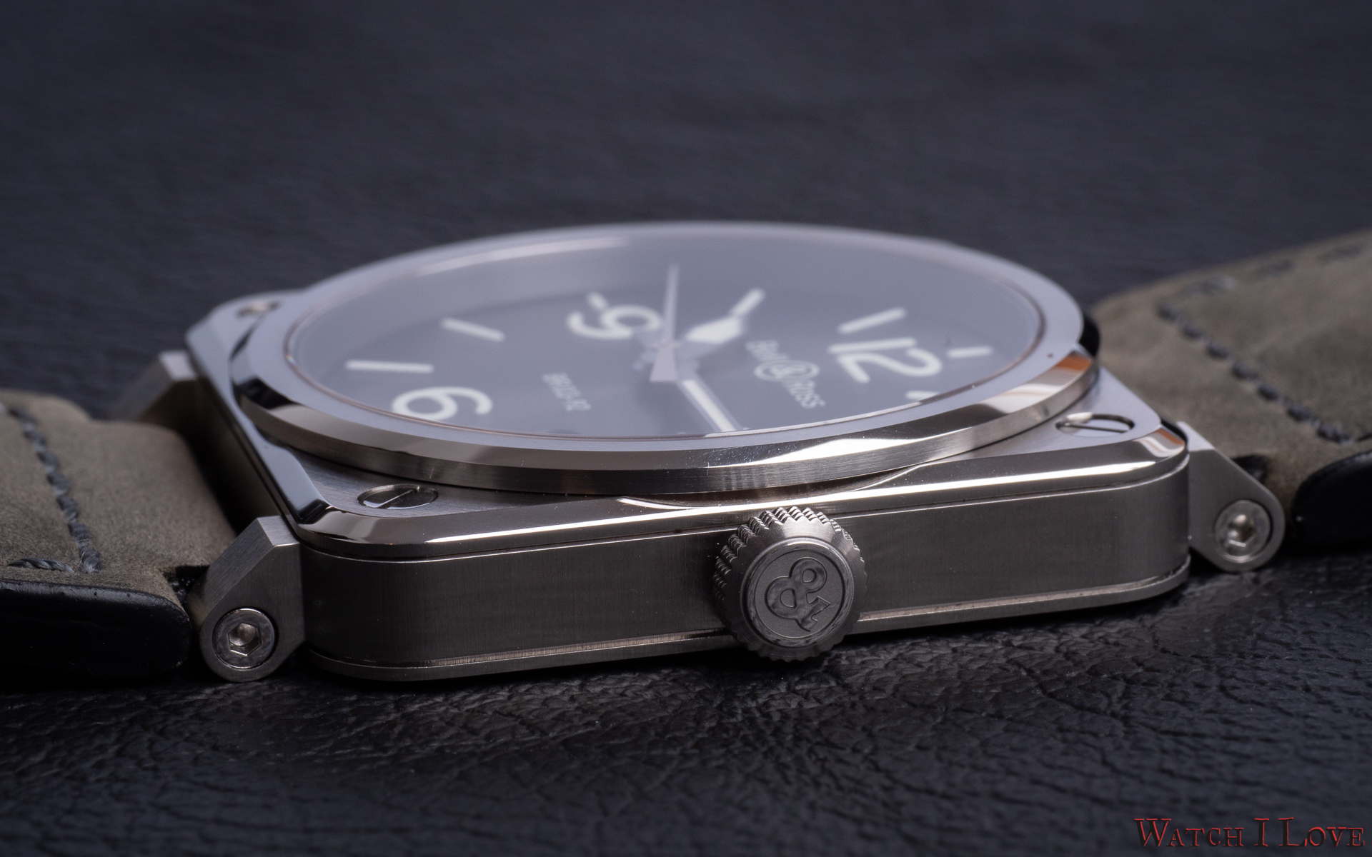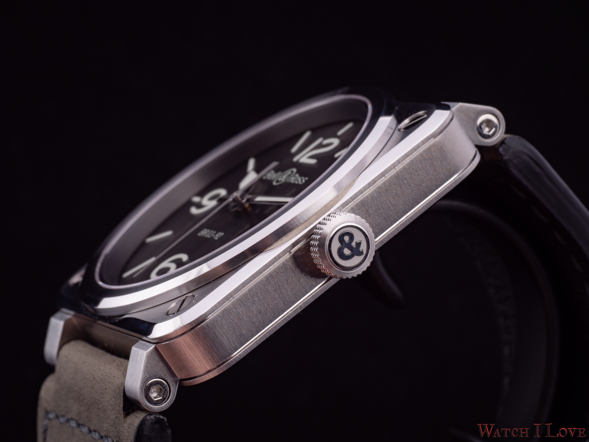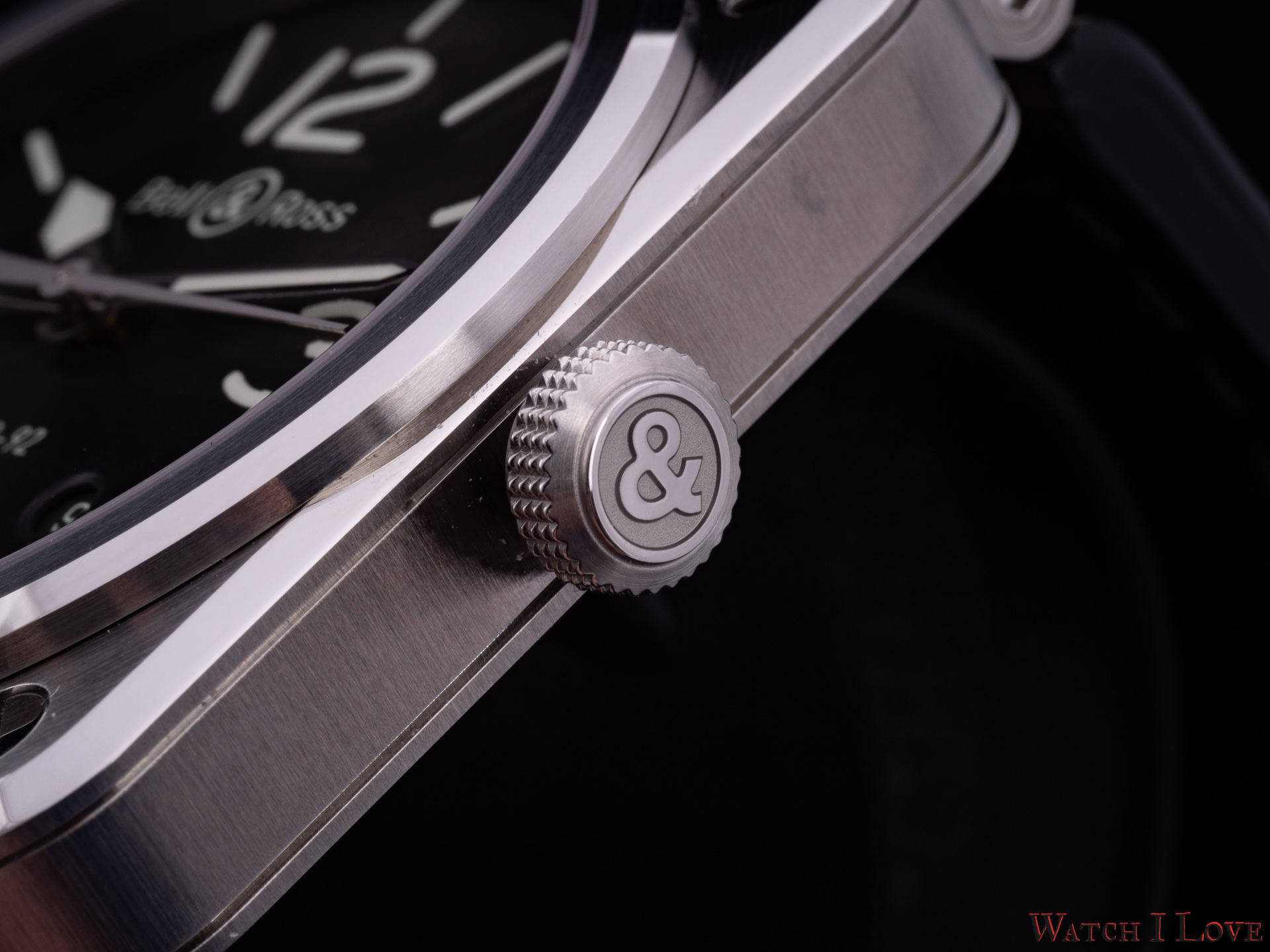 The crown follows strictly the brand’s DNA: good grip, even with gloves, Bell & Ross logo decoration.
