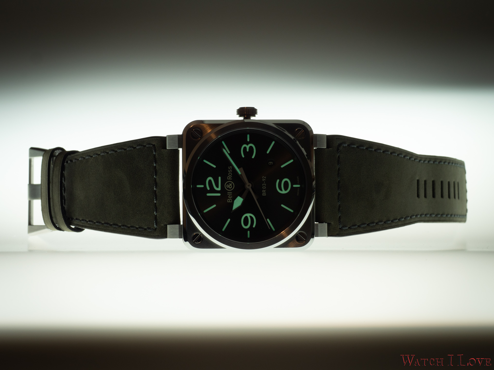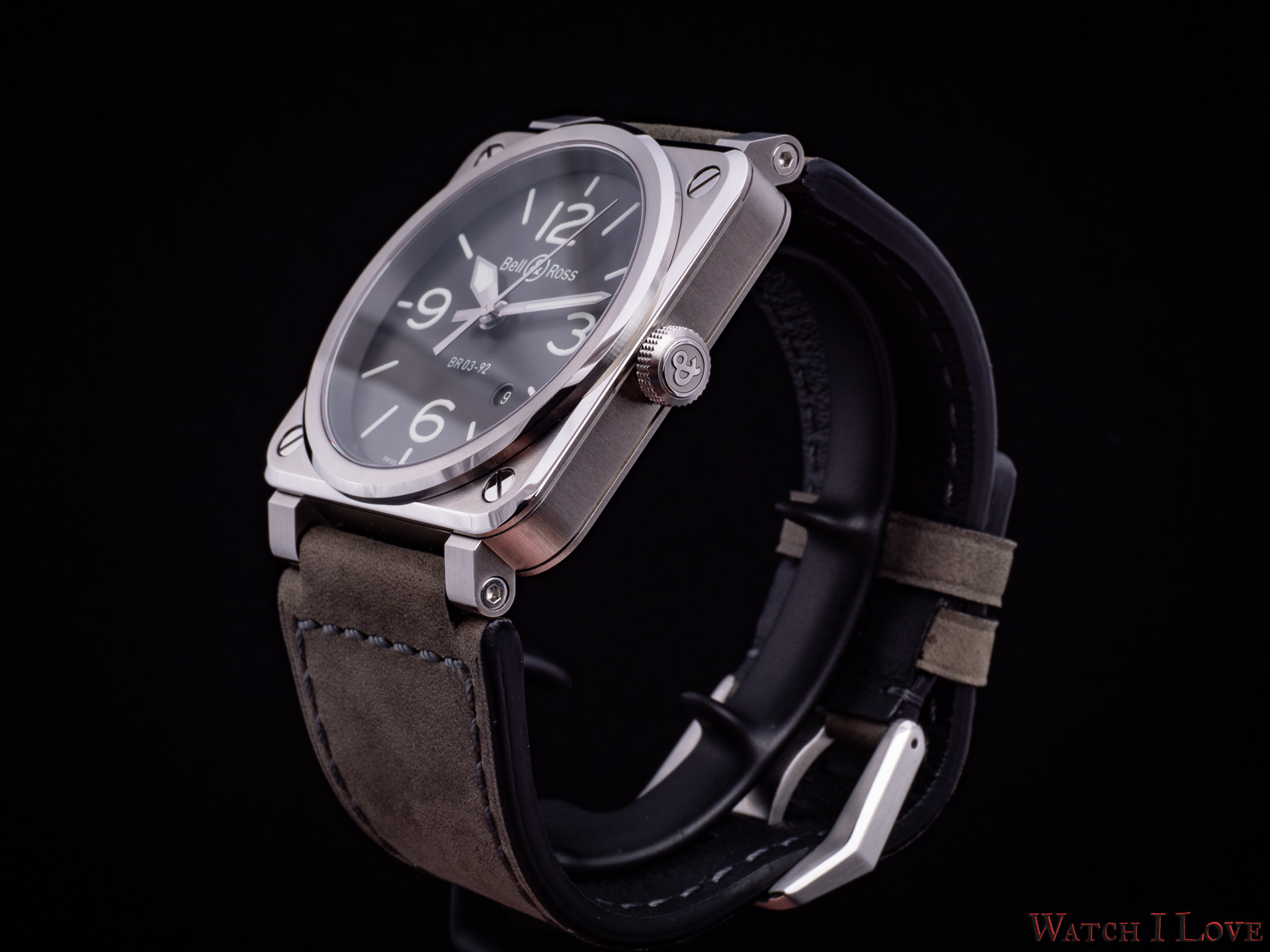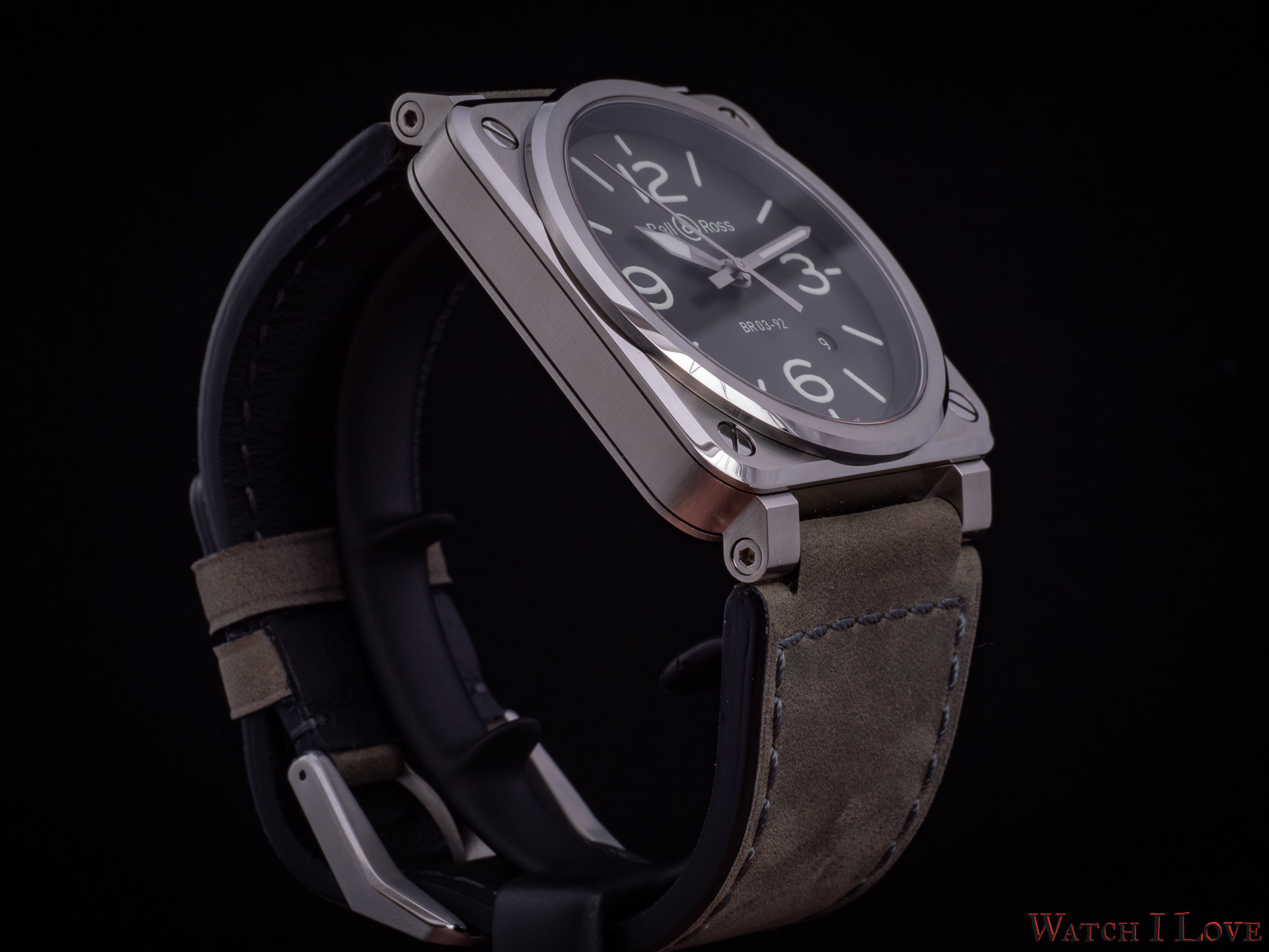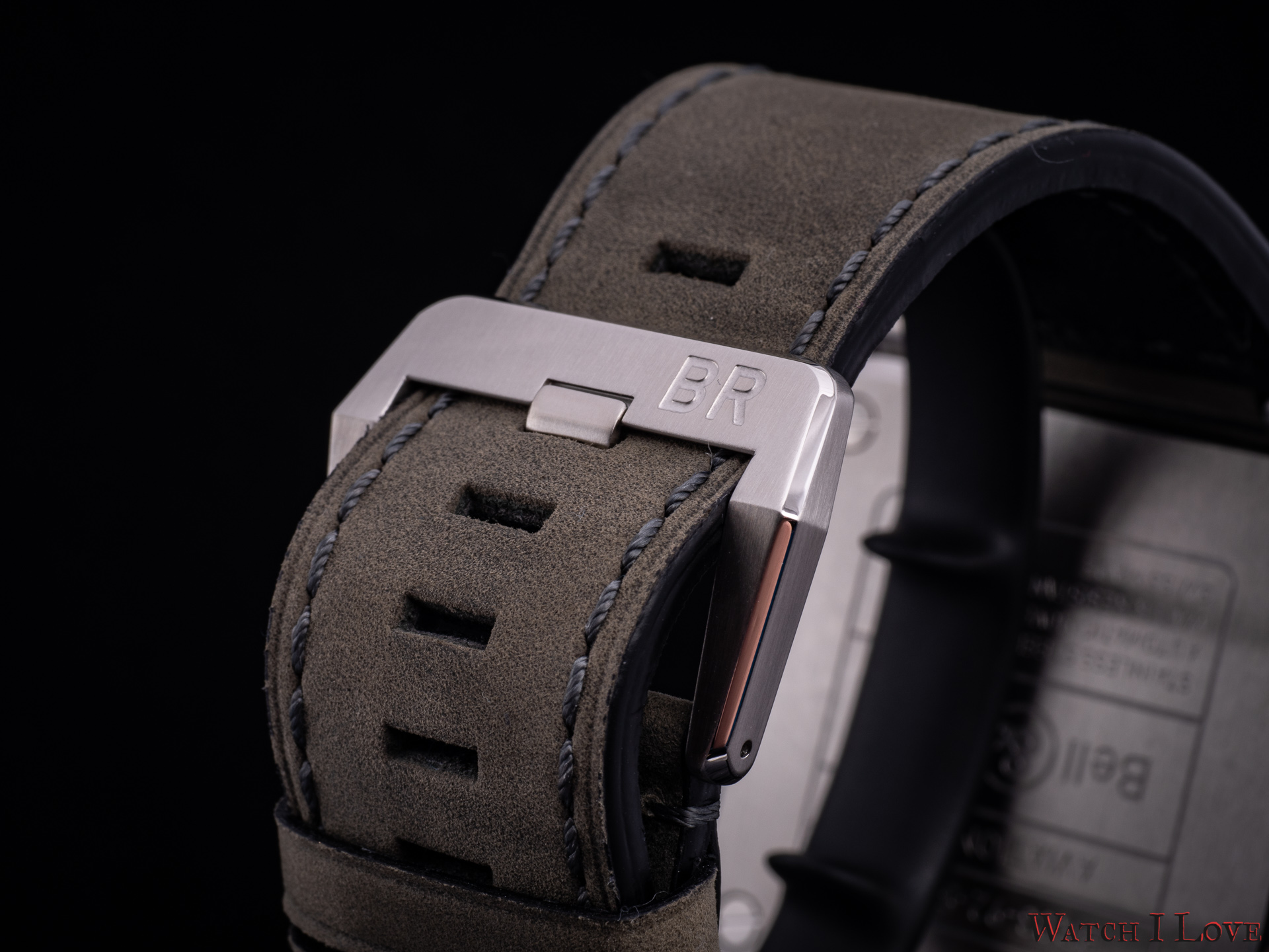 The watch has straight, inward bent lugs, familiar from the BR 03 family. The brand decided for a grey-green calfskin strap. Soft and comfortable but durable due to its ultra-resilient black synthetic fabric insert.