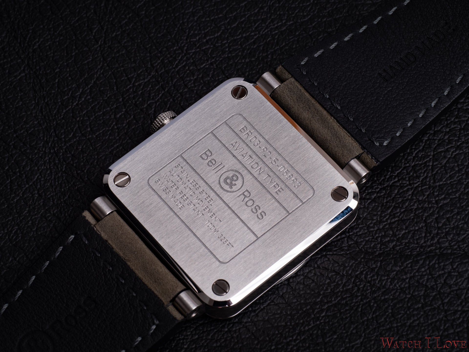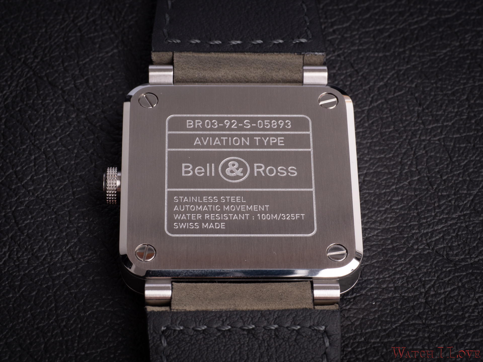The BR 03-92 Grey Lum is fitted with a closed stainless steel case back. This one bears all the information: reference number, water-resistance and so on.