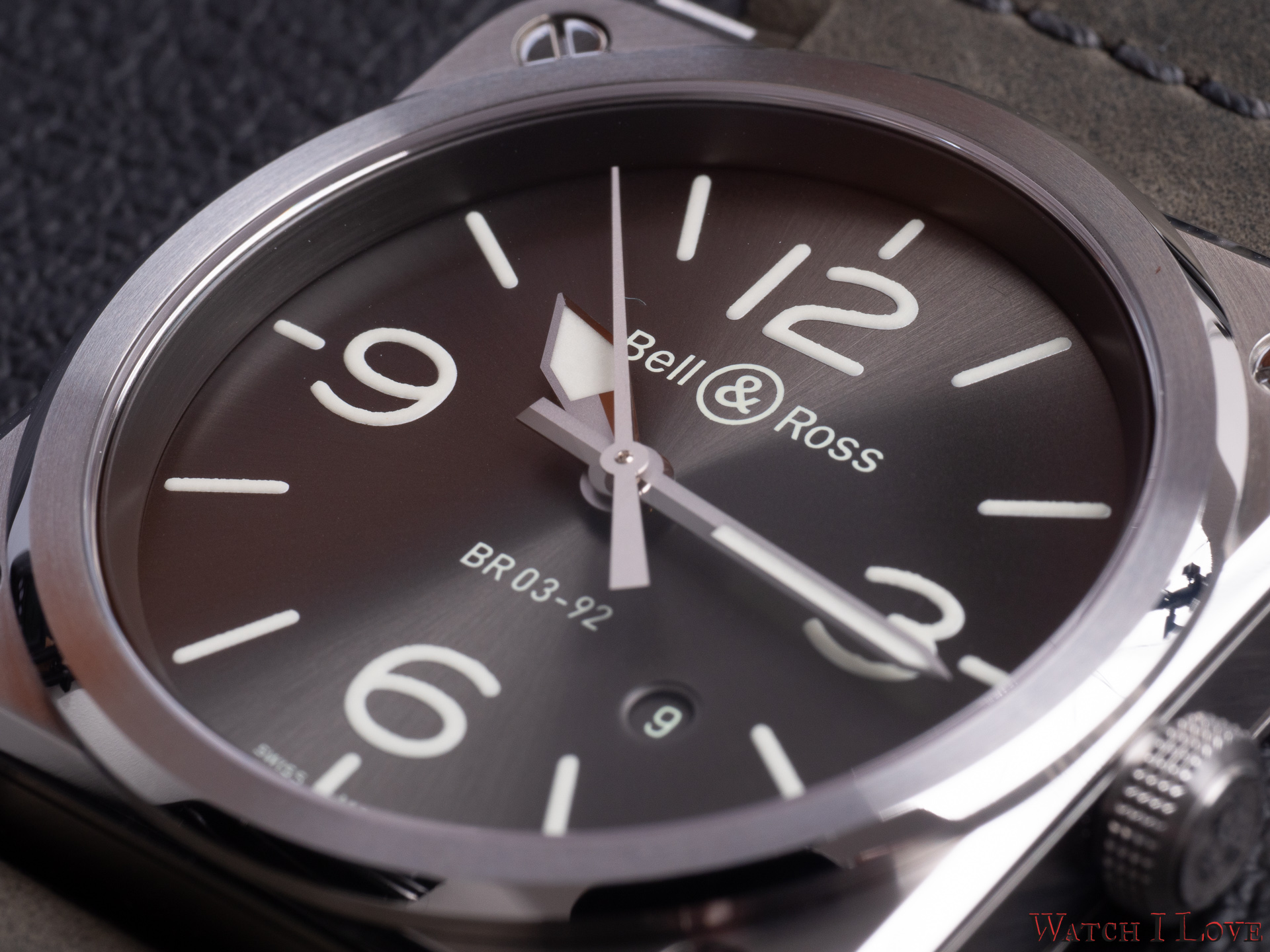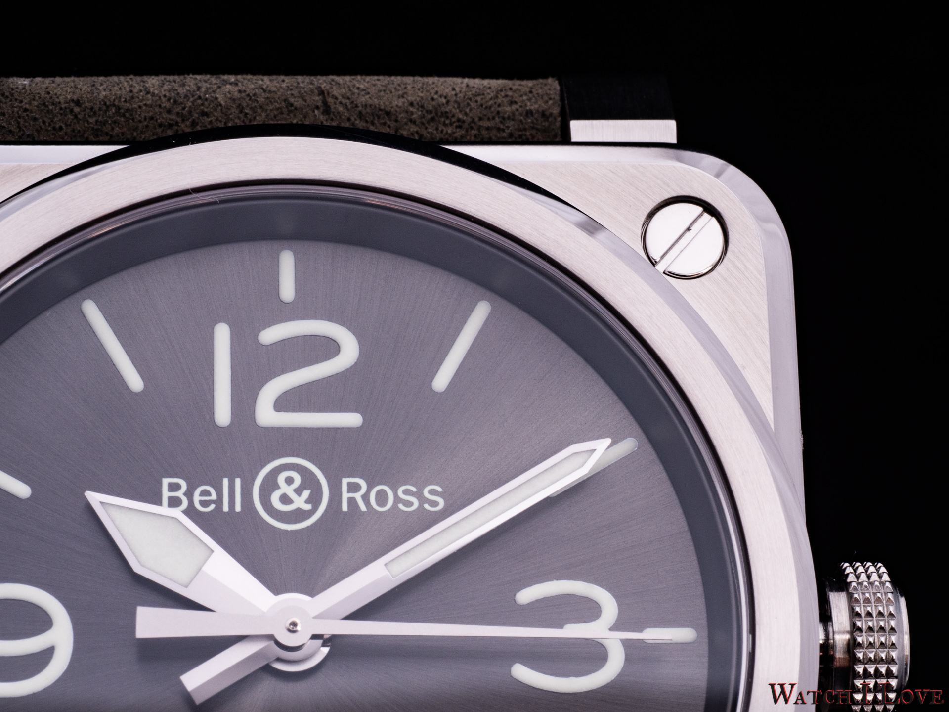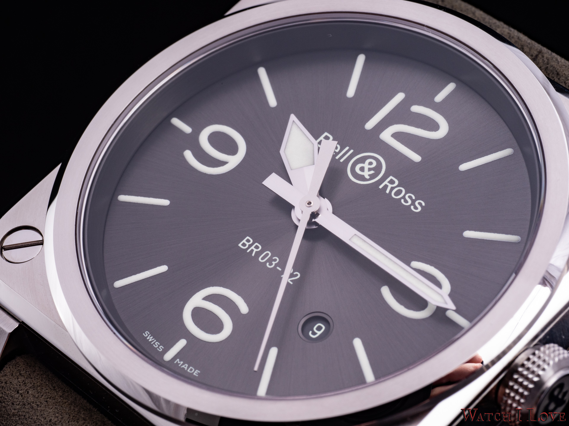 BR 03-92 Grey Lum evokes the look of the aeronautical and aviation instrument panels. The signature round bezel, “circle in a square”, is inspired by the cockpit clocks and instruments.