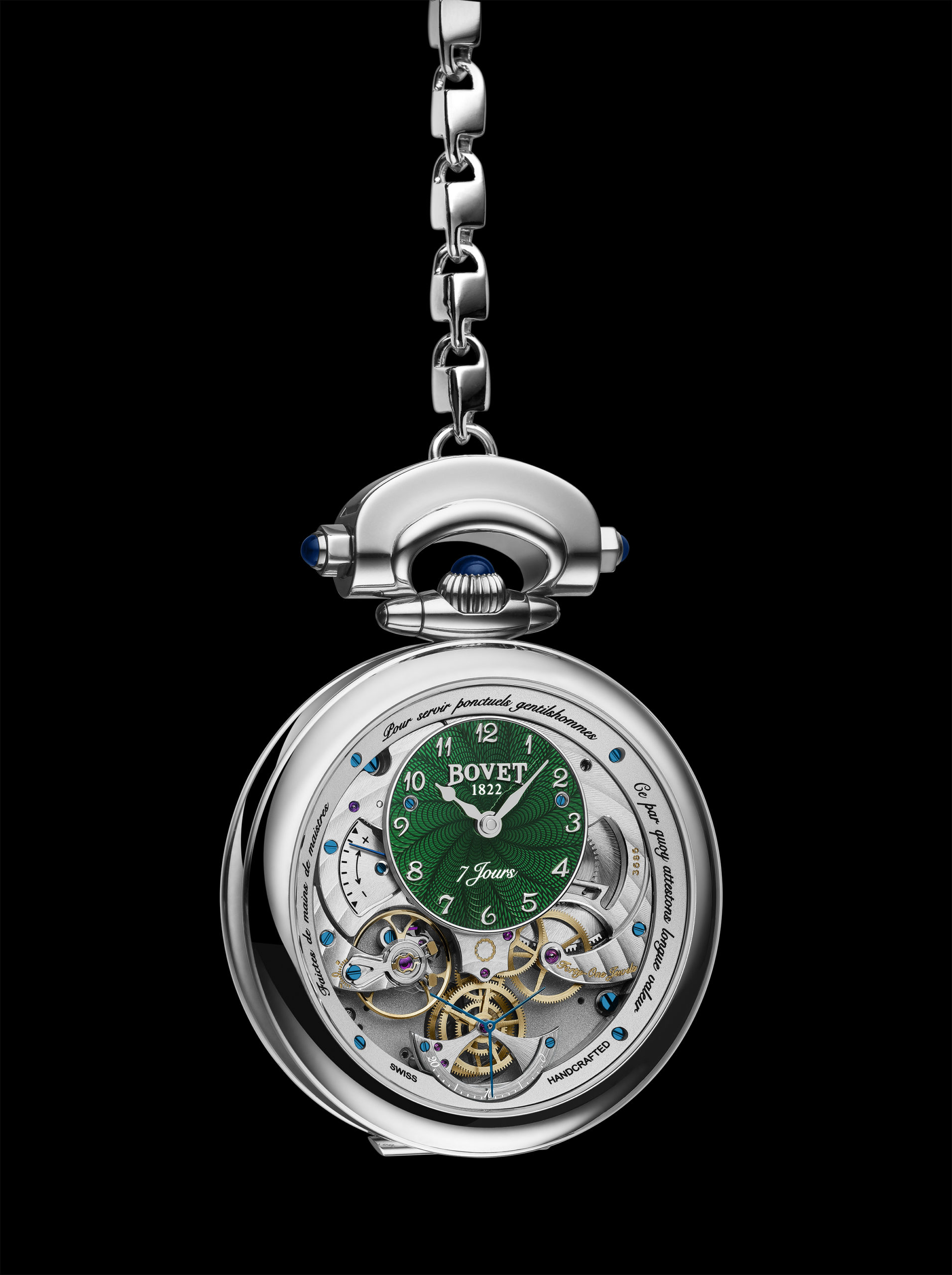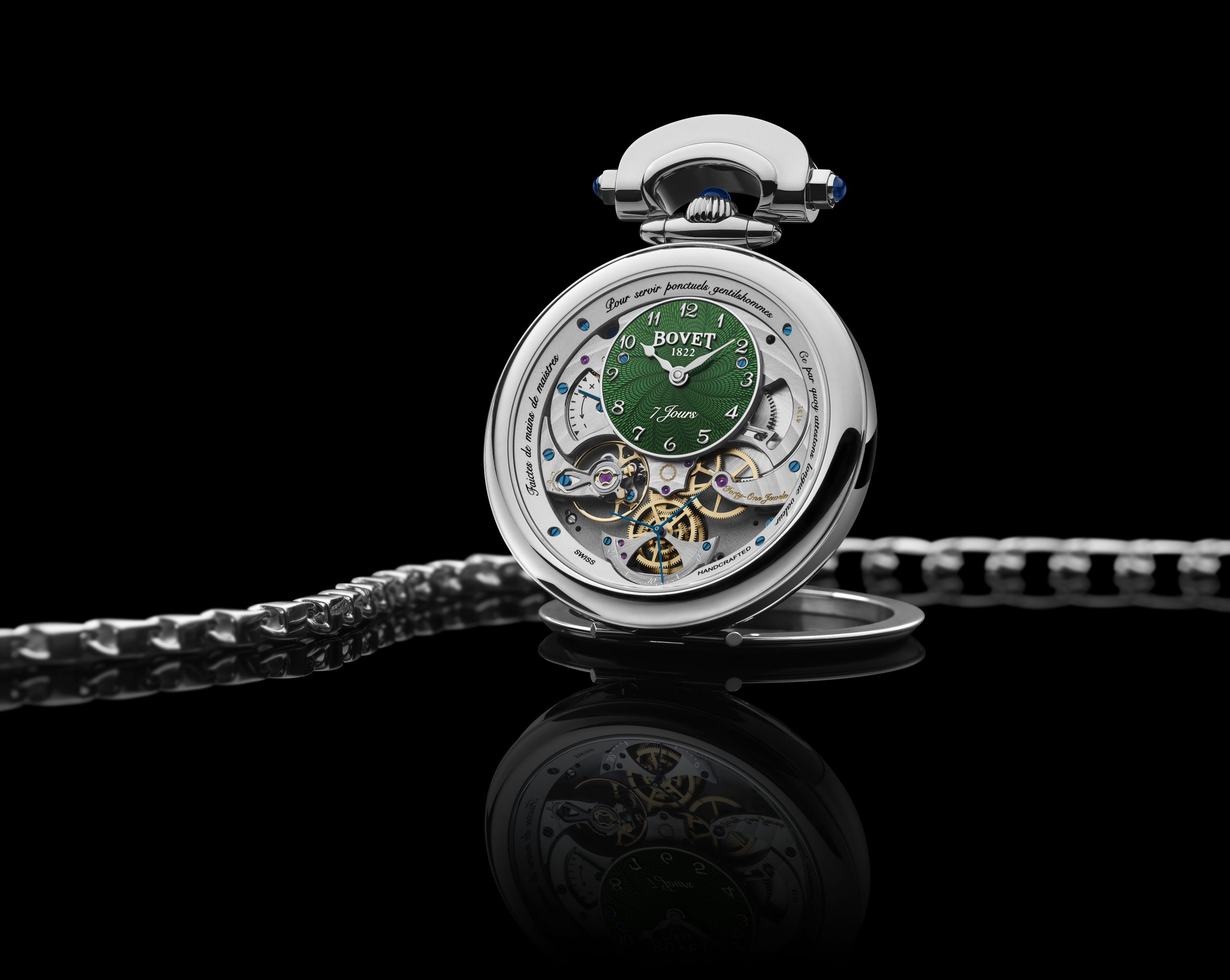 The case’s convertible feature allows the timepiece to be worn on the wrist, transformed into a table clock or turned into a majestic pendant without needing to use any tools. To match the dial in perfect harmony, Mr. Raffy, BOVET 1822’s owner, has designed an original long jade bead necklace that highlights the refinement of the timepiece. Powered by an automatic movement displaying the date at 6 o’clock, Miss Audrey is a timepiece that offers the comfort of use that is rare for such a gem.