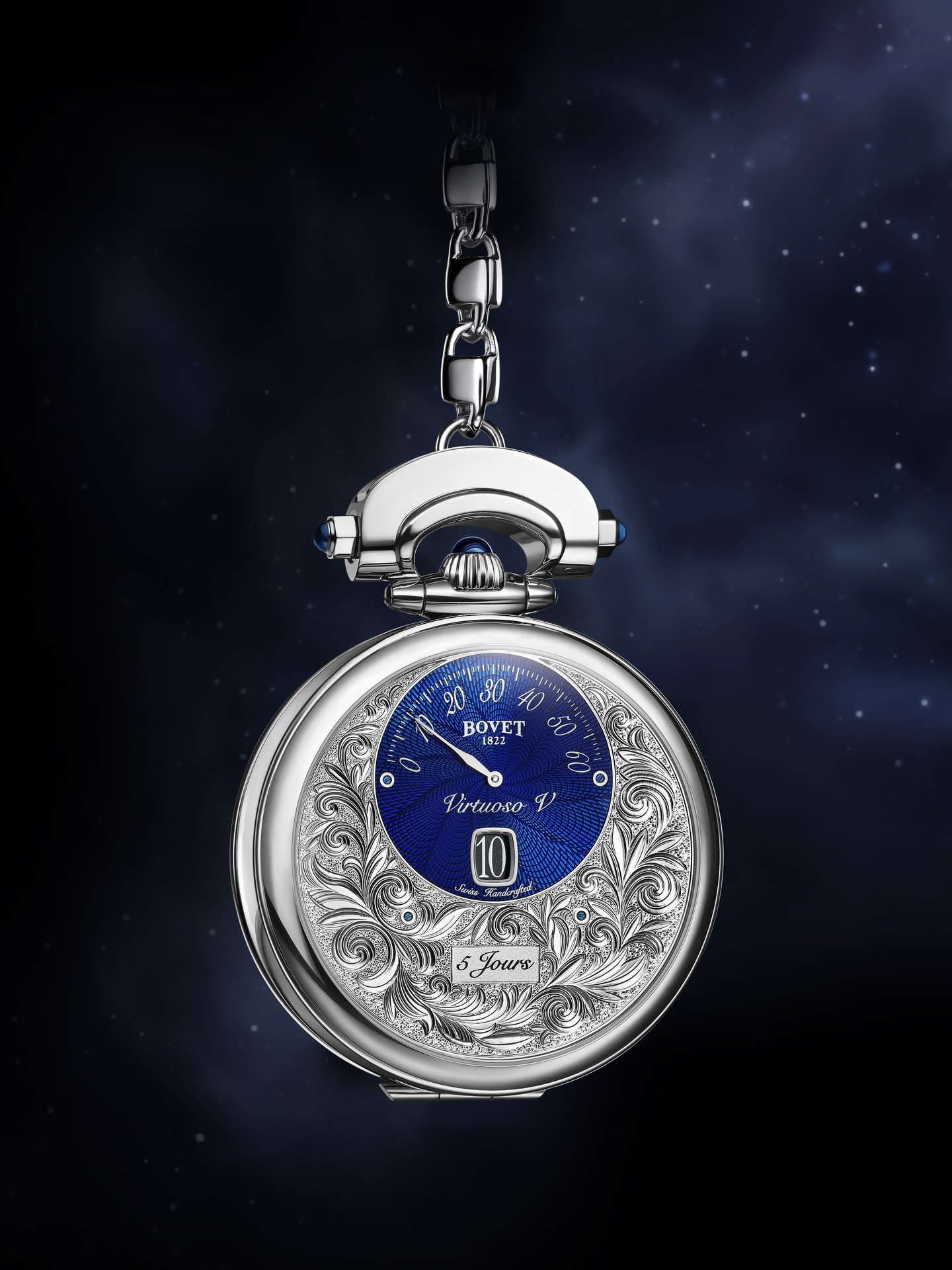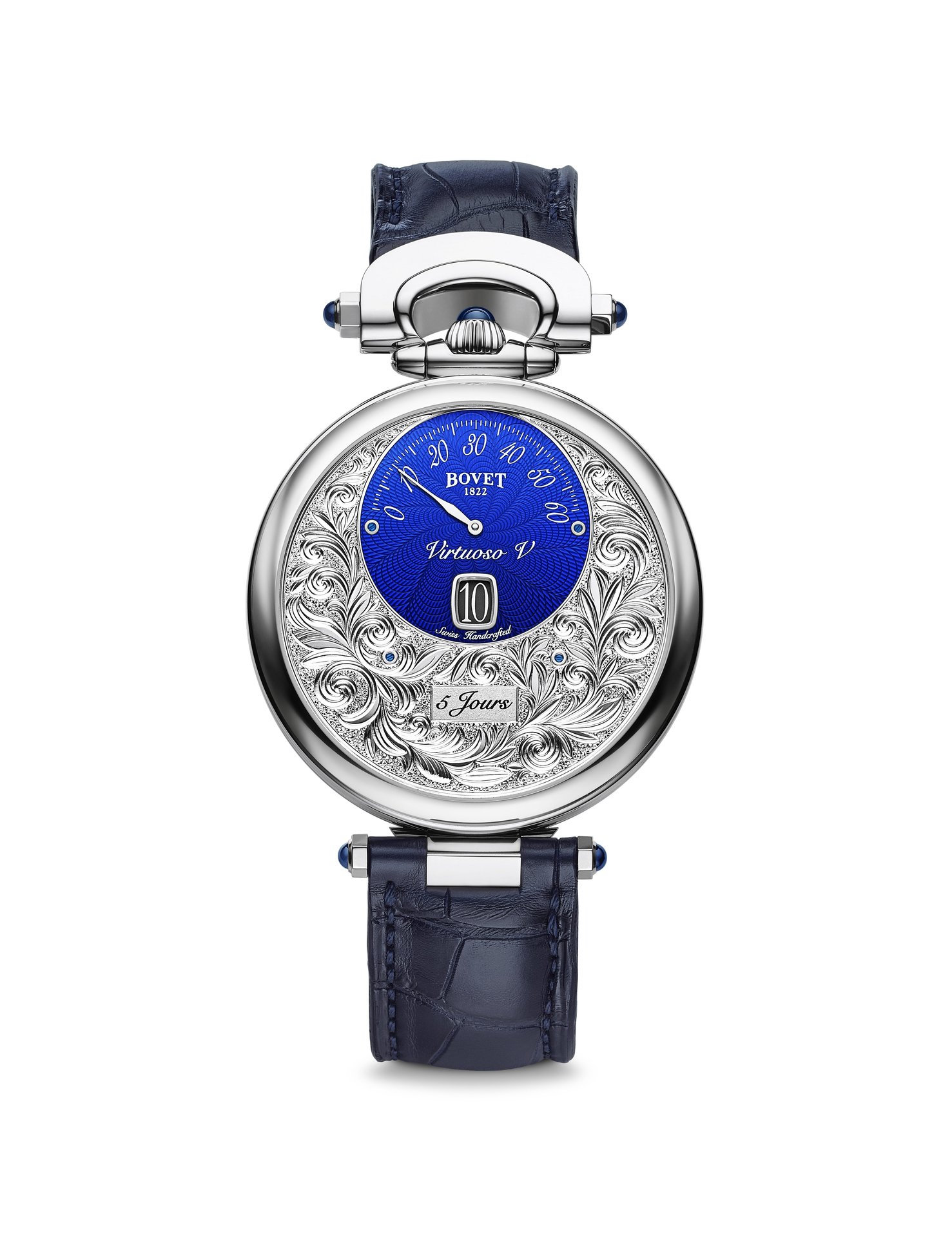 While the watchmakers worked on displaying all the information on the same level, the original stepped arrangement has given way to greater classicism, which enhances the artistic crafts and exemplary finishes of all the components. The dial-makers drew on their considerable talent to create this new face. The readability of the hour and minute displays is increased thanks to its elegant blue lacquered guilloché. It contrasts subtly with the rest of the surface, which is entirely hand-engraved with the emblematic “Fleurisanne” motif that has symbolised the true supremacy of BOVET‘s craftsmen in terms of decorative arts for almost two centuries.