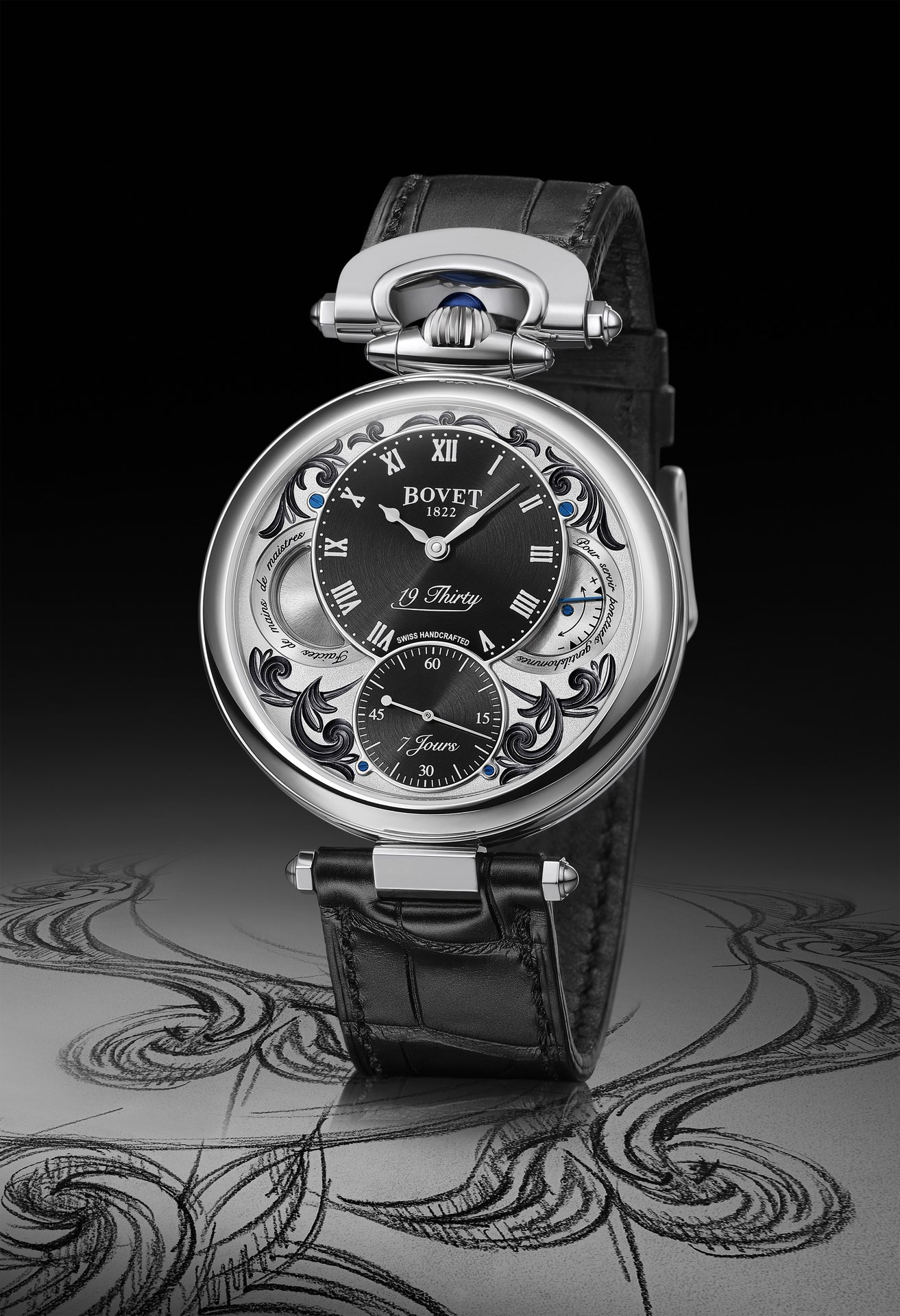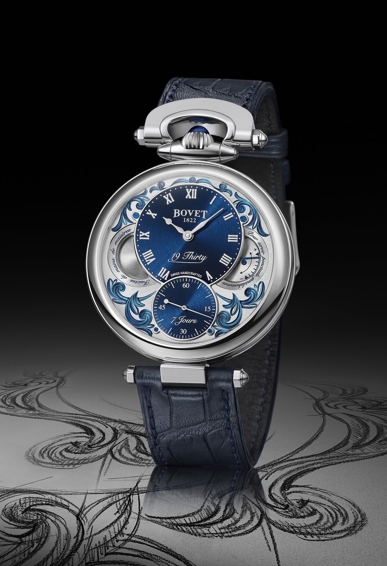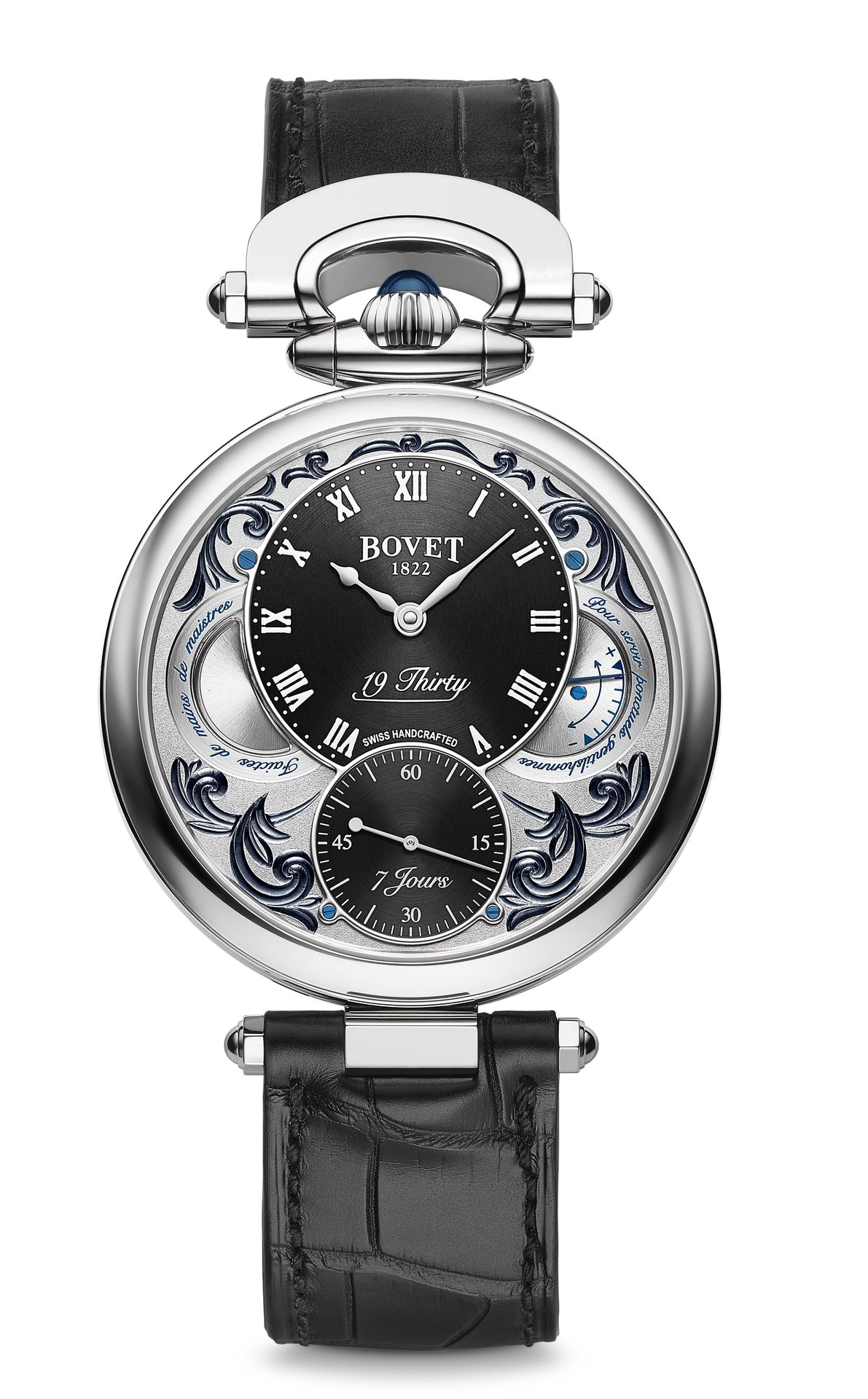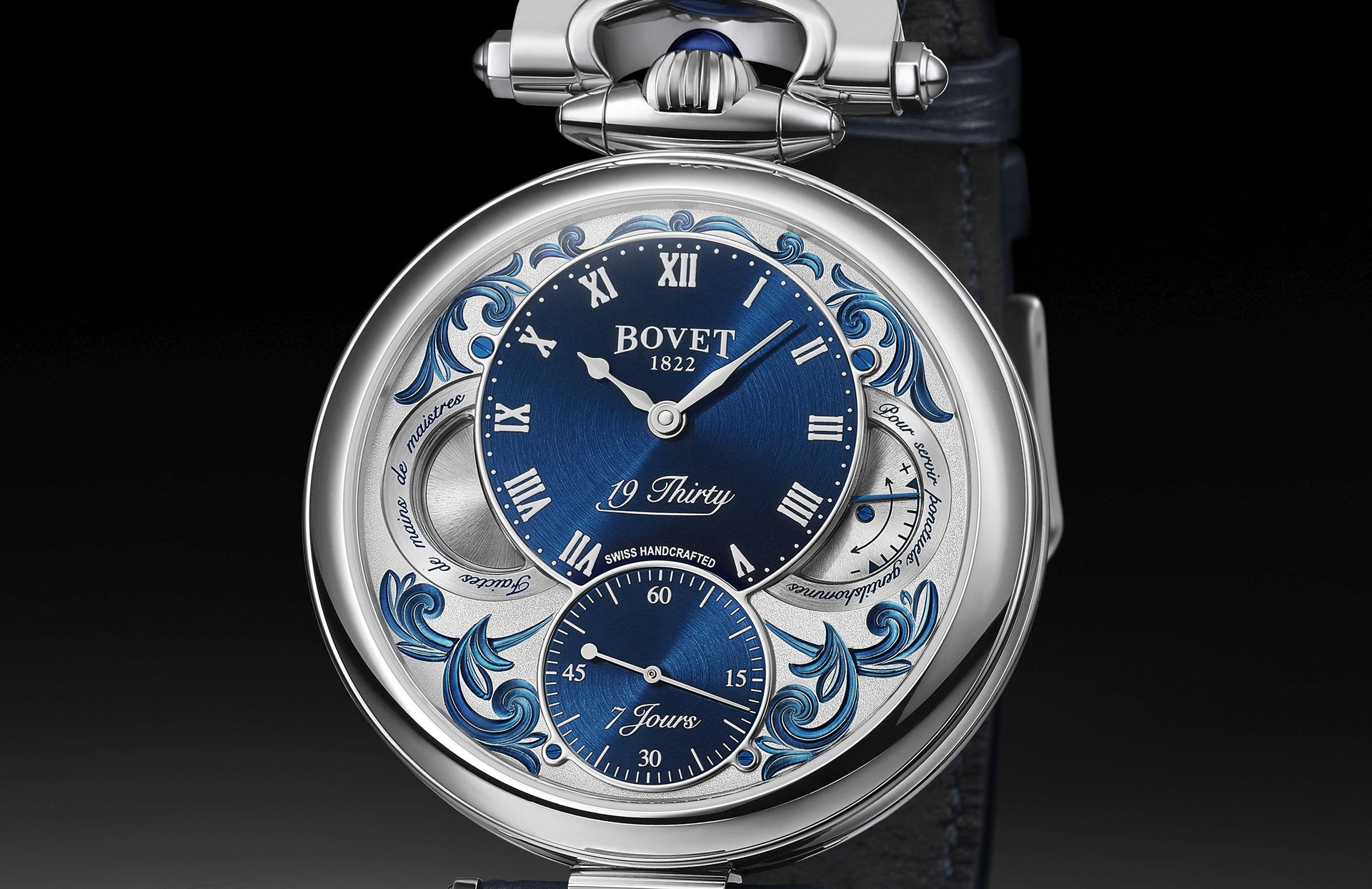 The 19Thirty collection was presented in 2015 exclusively in steel. The movement was specially developed for this collection, and the quality of its execution and finishes meets the same criteria of the Grandes Complications. It offers seven days of power reserve with only a single barrel. Mr. Raffy, the owner of BOVET 1822, wanted this collection to offer two different cases including the iconic Fleurier case with its bow and crown that stand out with their 12:00 position.