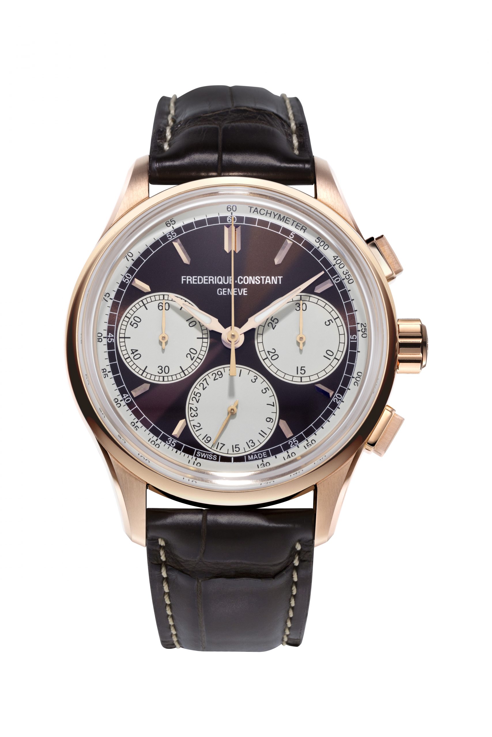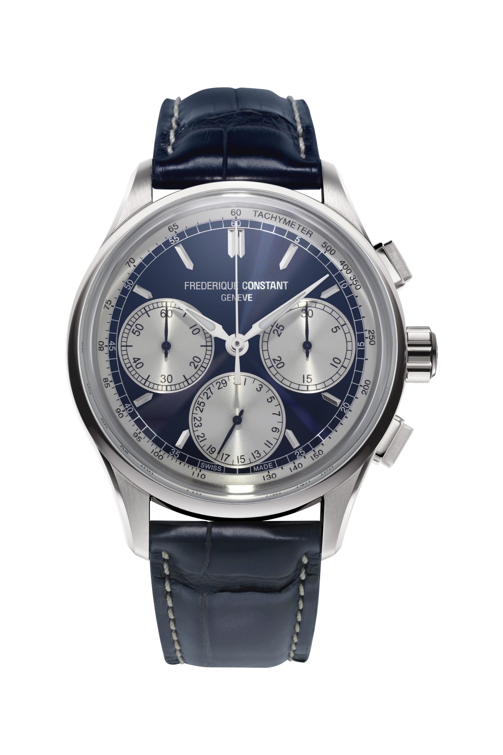In the first version, the three counters are set against a chocolate-coloured dial with a 42-mm rose-gold case. The second features a blue dial with a stainless-steel case. Contemporary and dynamic, these new Flyback Chronograph Manufactures have baton indices and luminous hands, as well as an alligator strap with deployment clasp stamped with the Frederique Constant logo.
