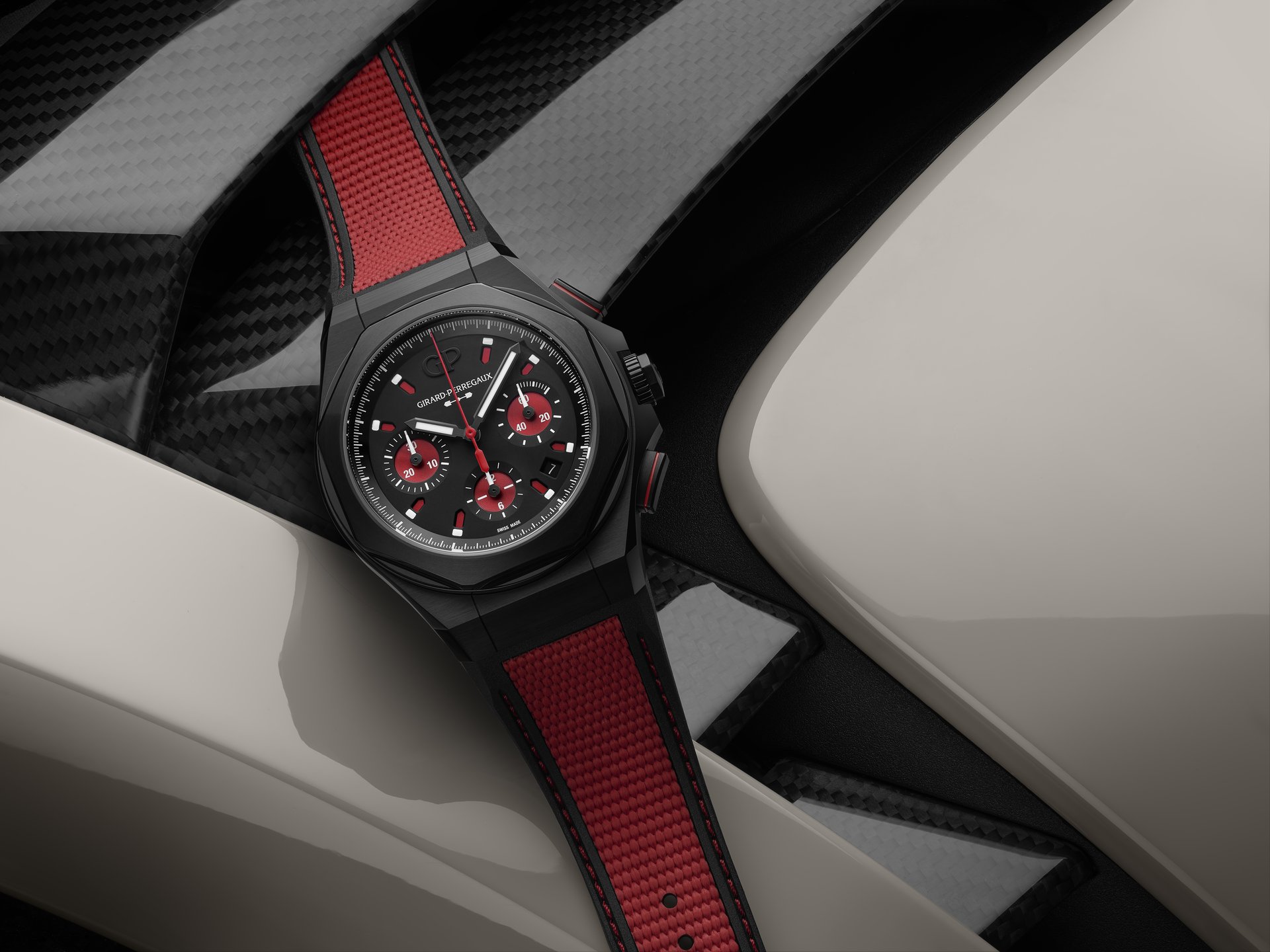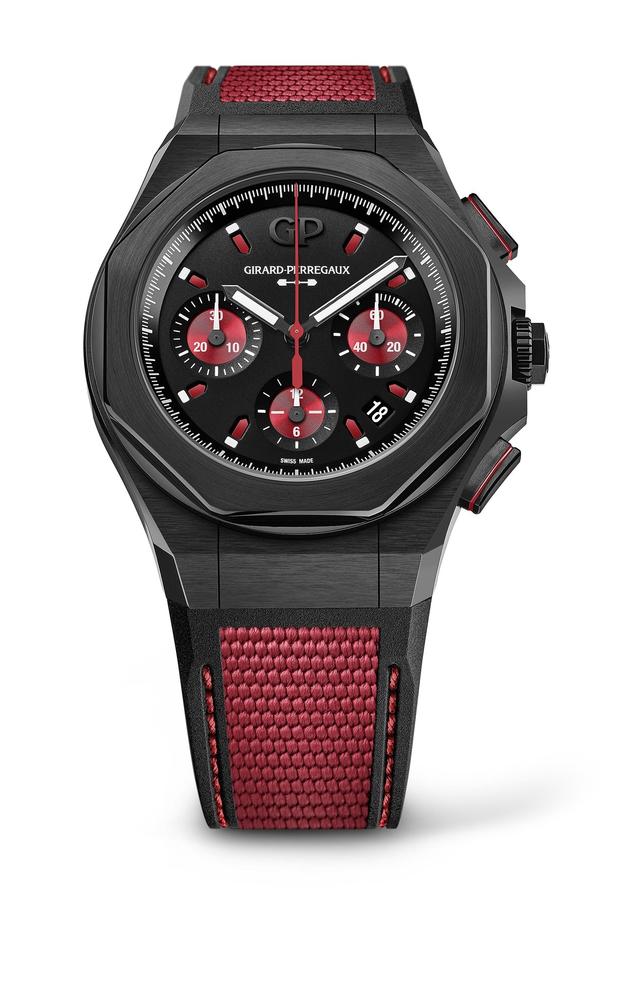 An exclusive limited edition of just 50 pieces, the Laureato Absolute Passion makes no compromises. Its faceted case of 44mm features a black PVD treatment with touches of red adorning the entire watch, in homage to the use of red in Girard-Perregaux’s history-making chronographs.
