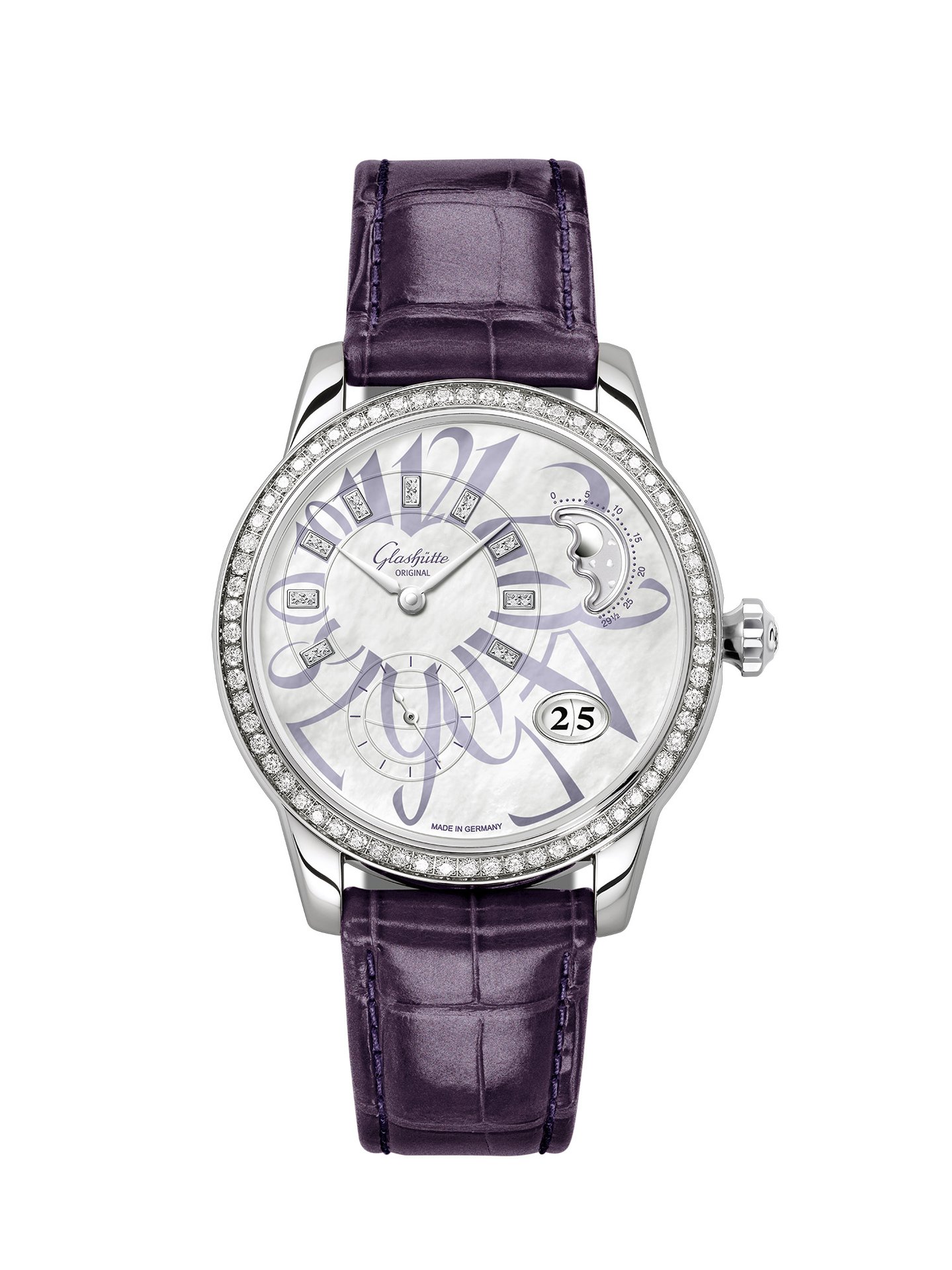 The bezel forms a glamorous frame for the stainless steel case and captures everyone’s attention with 64 brilliant-cut diamonds. A matching purple strap in alligator leather takes up the coloured accents from the dial. With its delicate and playful elements, this limited-edition PanoMatic Luna represents an elegant and romantic addition to the successful product line. Whether sparkling and set with rubies or radiant in delicate blue mother-of-pearl – all models in the line prove convincing thanks to stylistic elements at once classic and feminine.