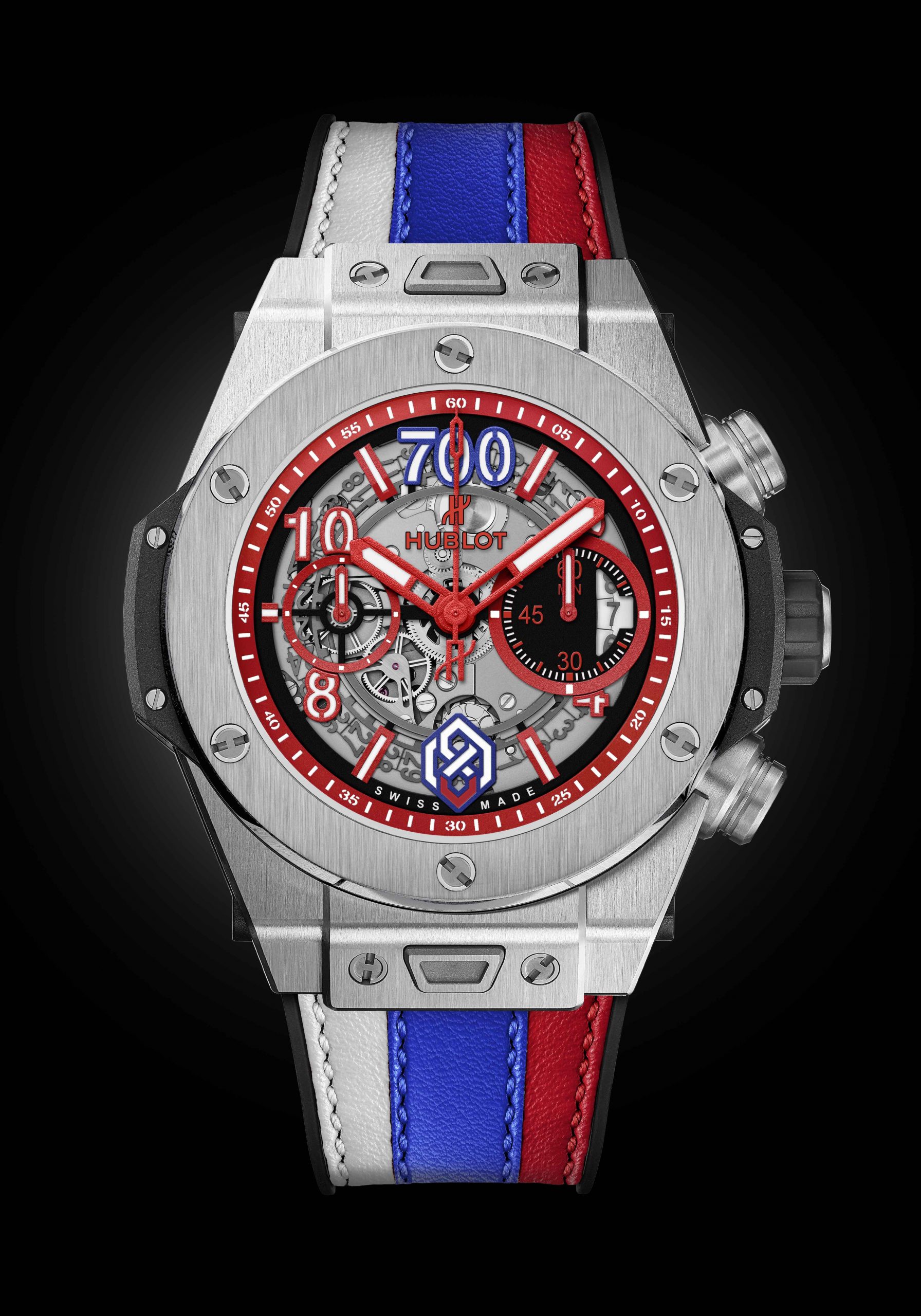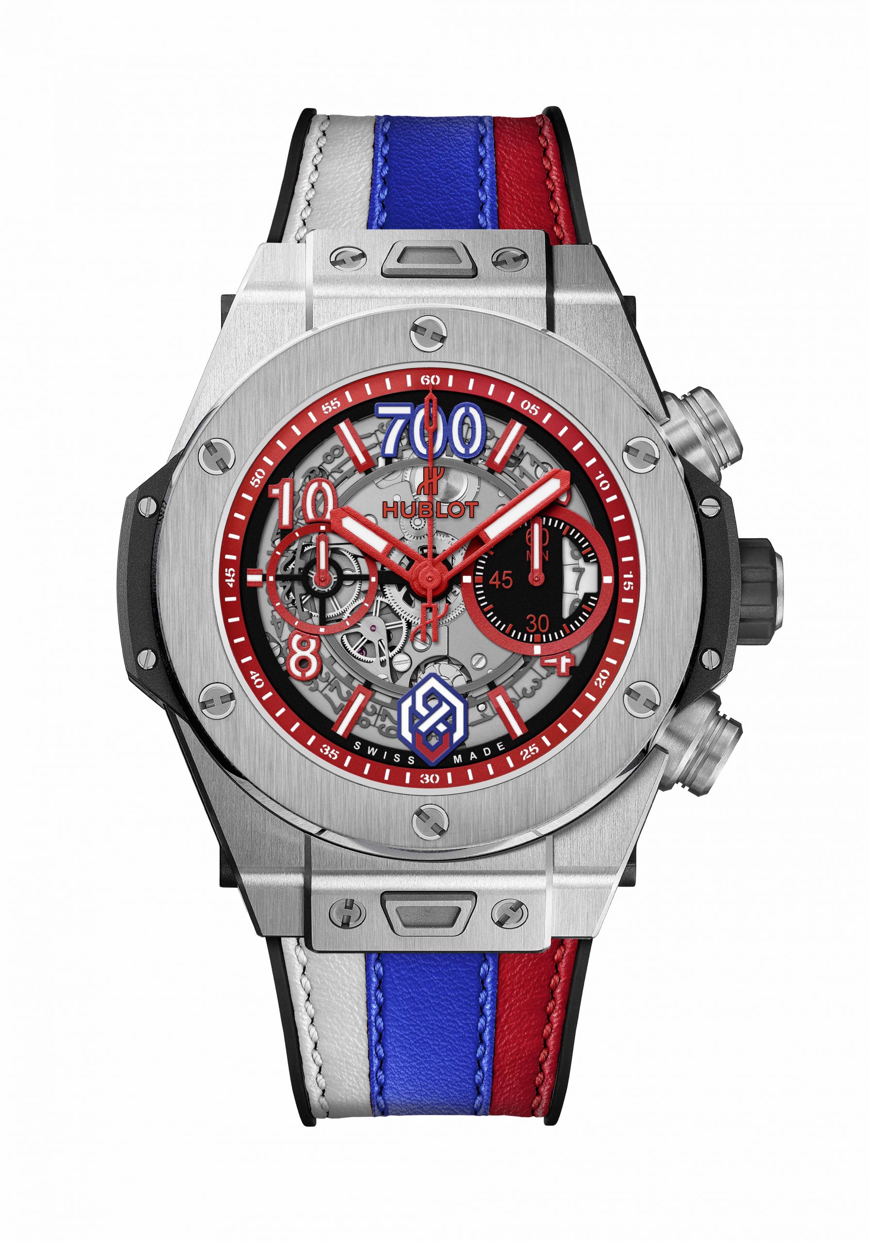 The one-of-a-kind Hublot Big Bang UNICO Titanium design was presented to Alexander last night by Ted Leonsis, Chairman and CEO of Monumental Sports and Entertainment and Dick Patrick, President of the Washington Capitals during a special ceremony at the Capital One Arena prior to their home game against the Winnipeg Jets. The 45mm watch is decorated in the red, white and blue of the Capitals and of Alexander’s home country Russia. The dial features personalized elements important to Alexander in place of the usual numerals at 12 o’clock and 6 o’clock .