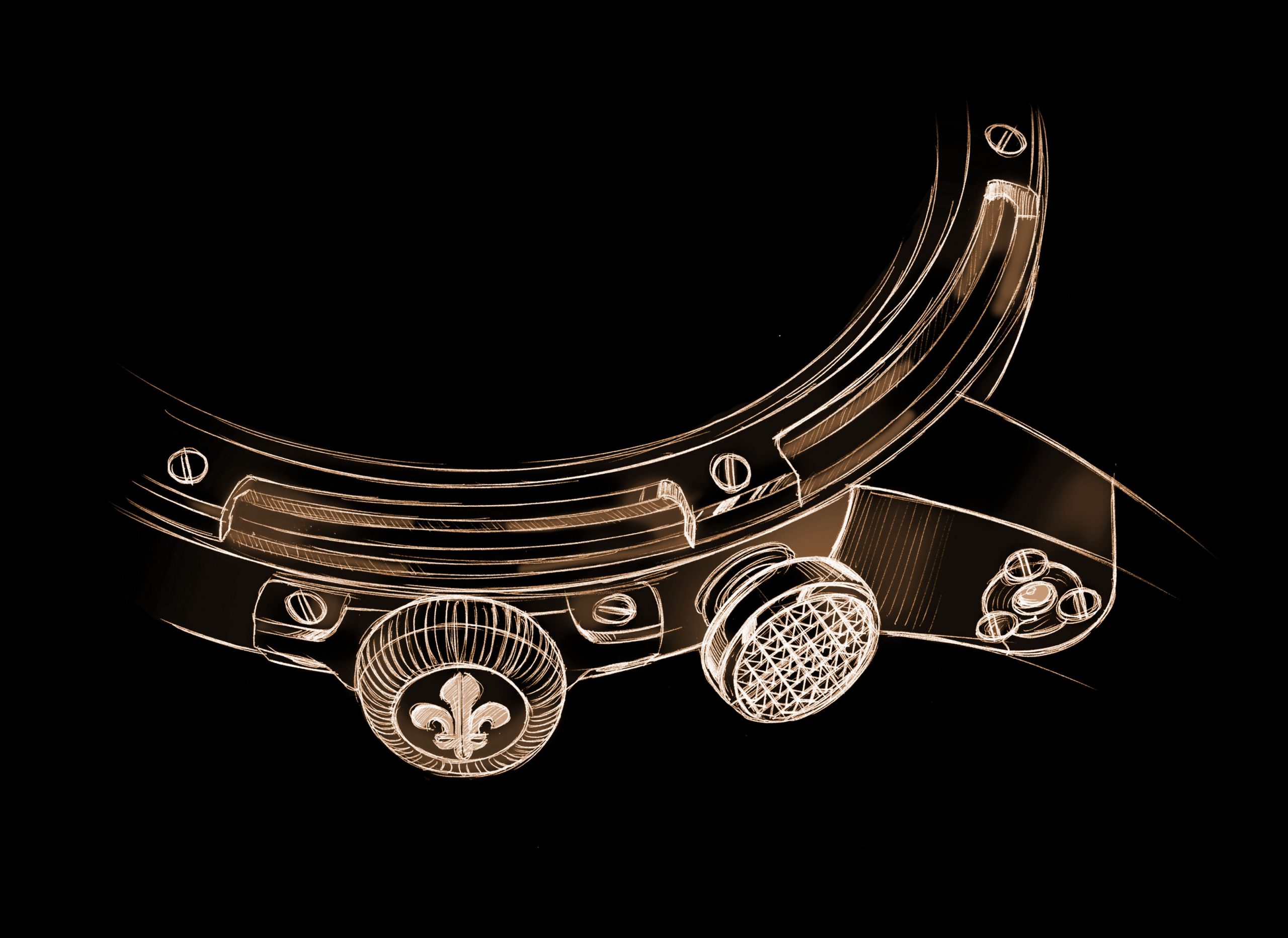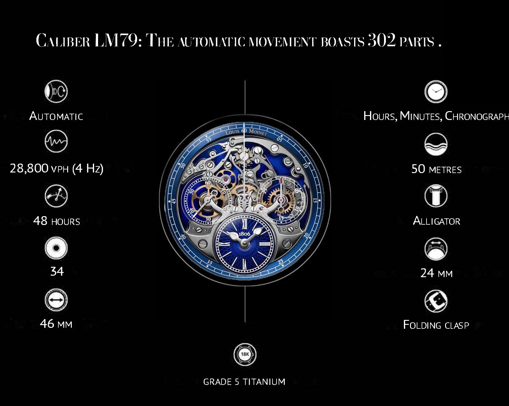 Memoris offers a whole new look. Its curved 46-millimetre case features a unique waterproofing system. Emblazoned with the Louis Moinet signature, its lugs boast four black zircons and screwed settings. Another elegant and subtle detail: the two chevé concave sapphire crystals.