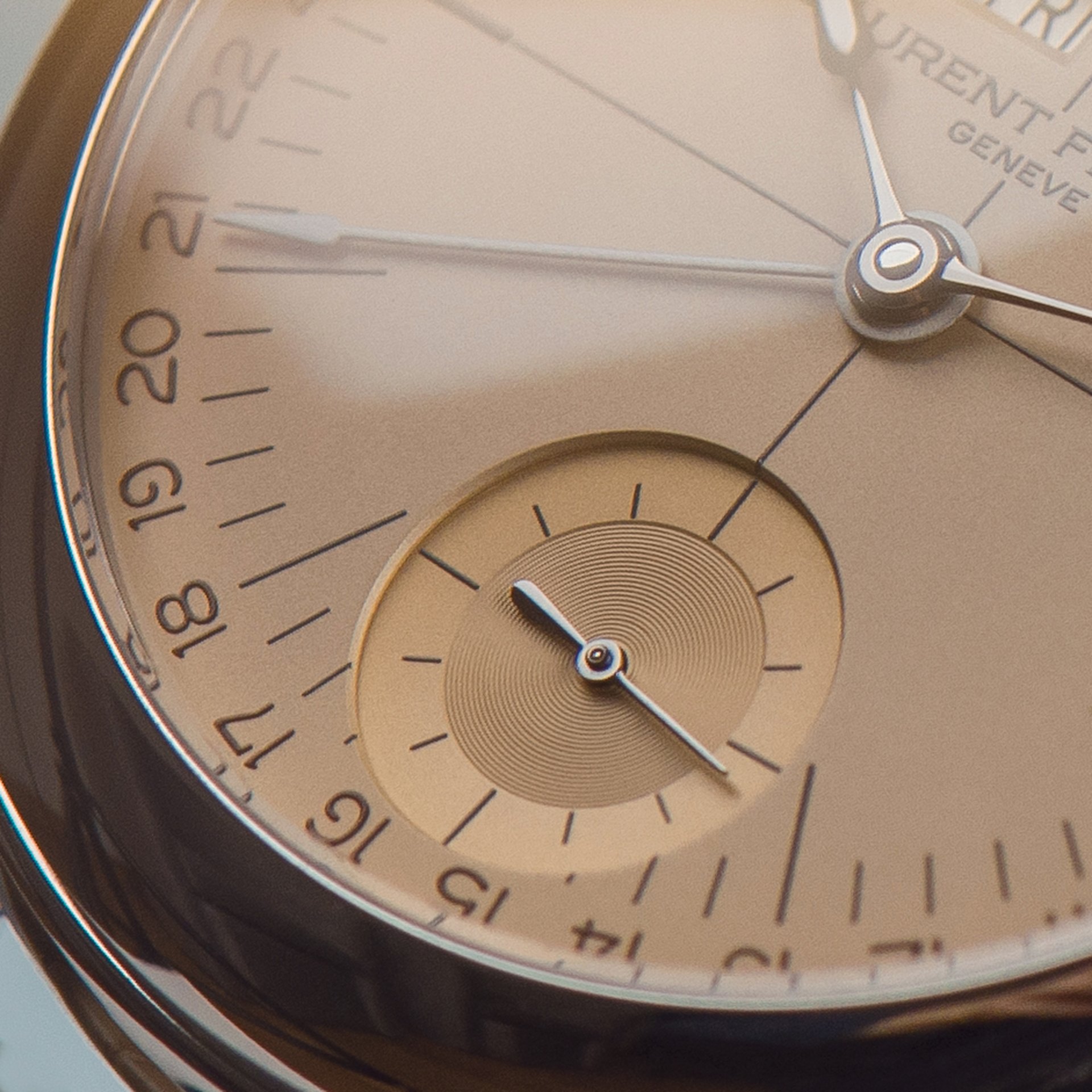 The classically-styled Laurent Ferrier Galet Annual Calendar School Piece “Vintage” was designed in-house and embodies an array of qualities which distinguish it as special. The prevailing time is conveyed with curvaceous ruthenium Assegai hands. A snailed small seconds display resides above 6 o’clock, tastefully imparting meaning. Two bevelled apertures, positioned in the upper portion of the dial, proclaim the day and month, while the date is indicated by a white hand circumnavigating the periphery of the dial. The dial displays much information yet remains uncluttered and free of distractions.