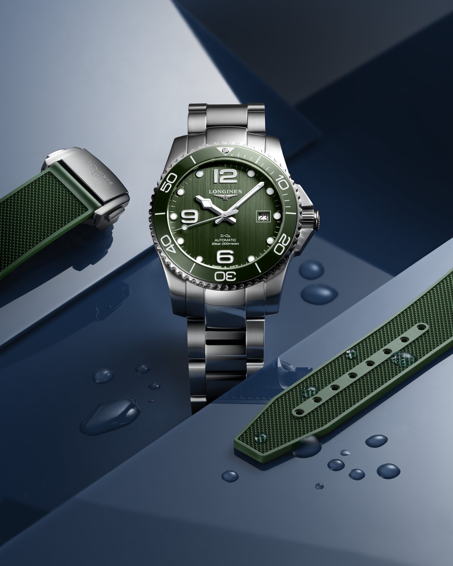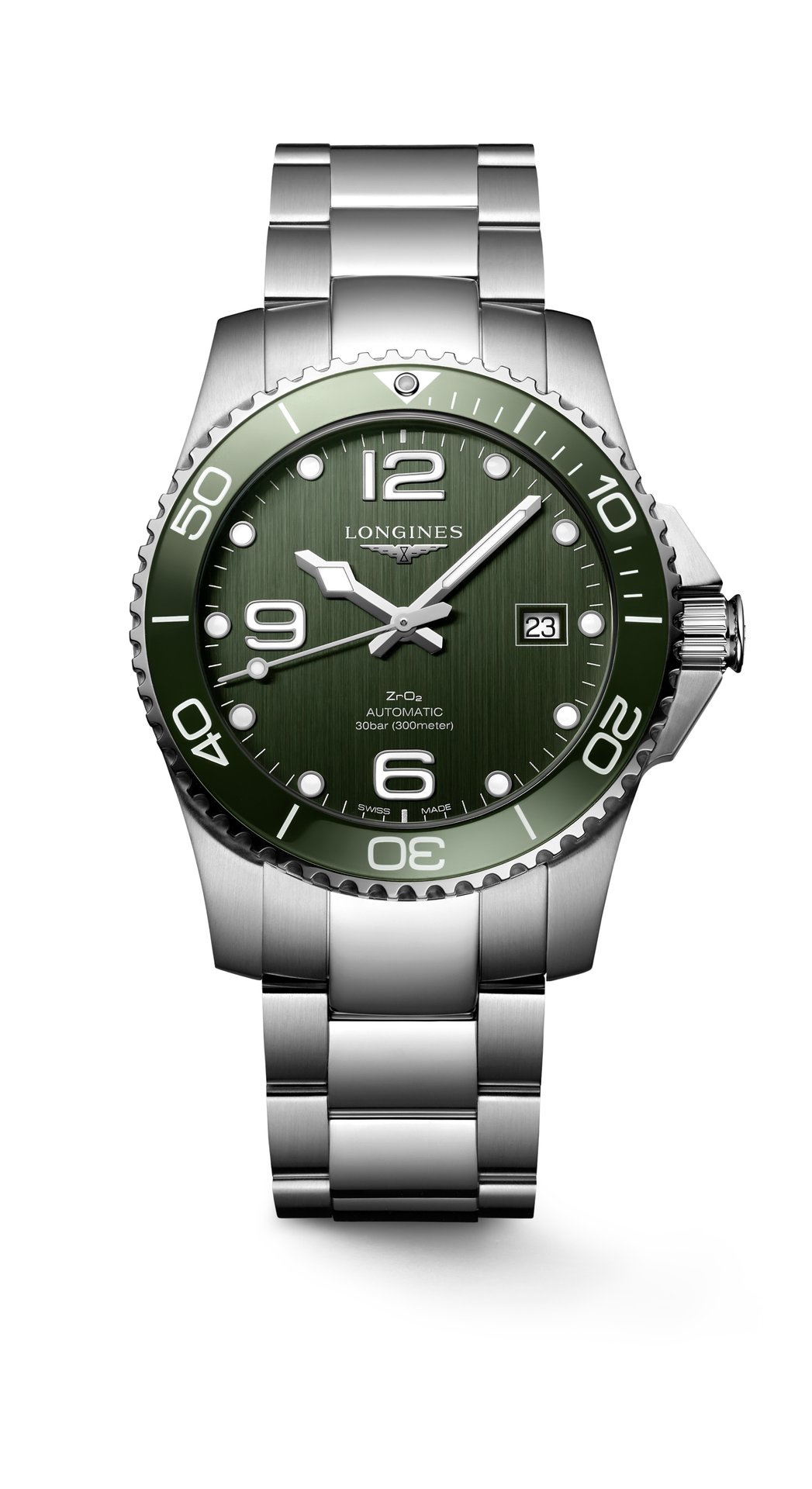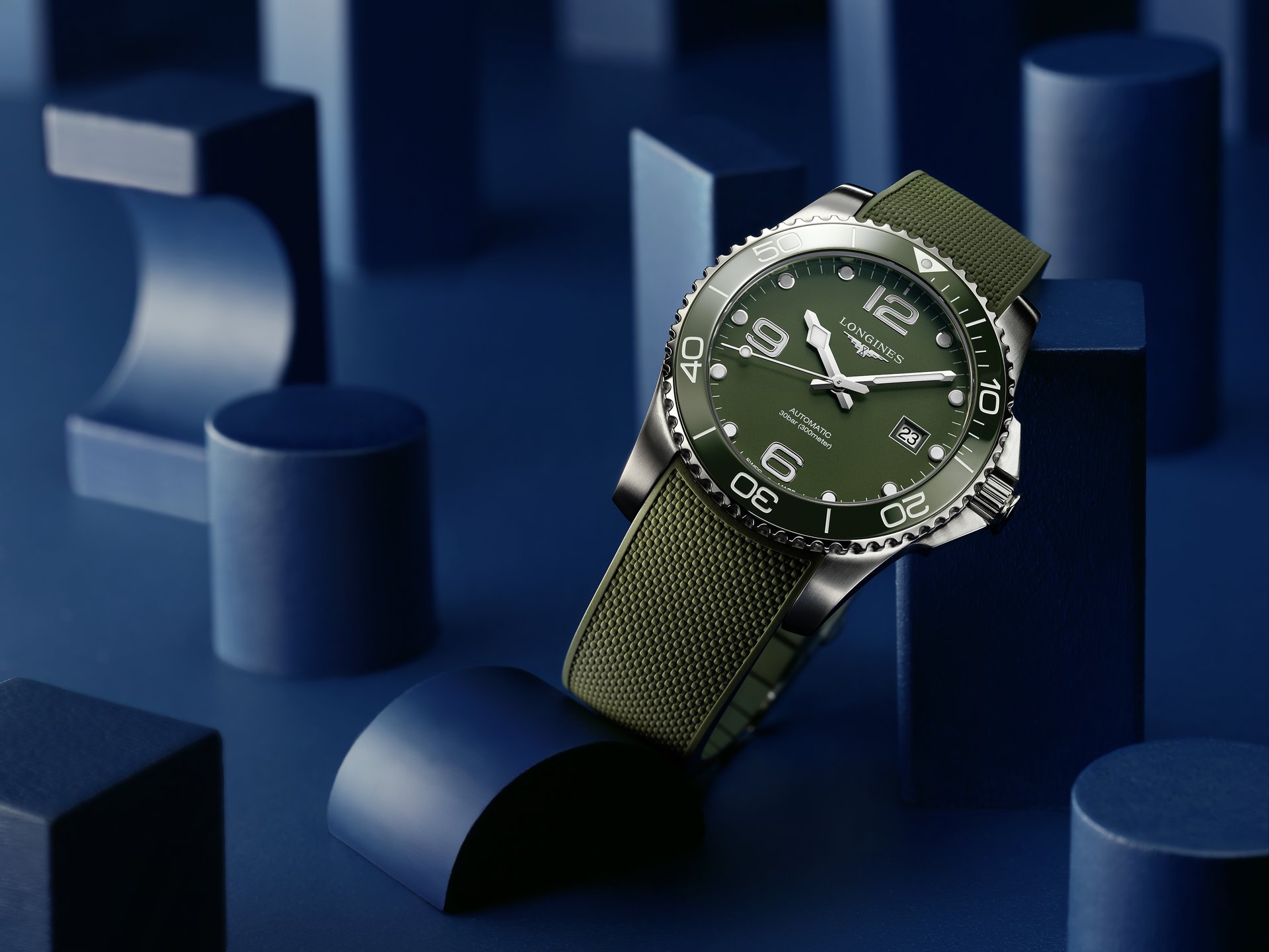 Whether in khaki or bright green, the new HydroConquest, which is the result of Longines’ expertise in the sports field, is sure to stand out with its sleek, bold look.