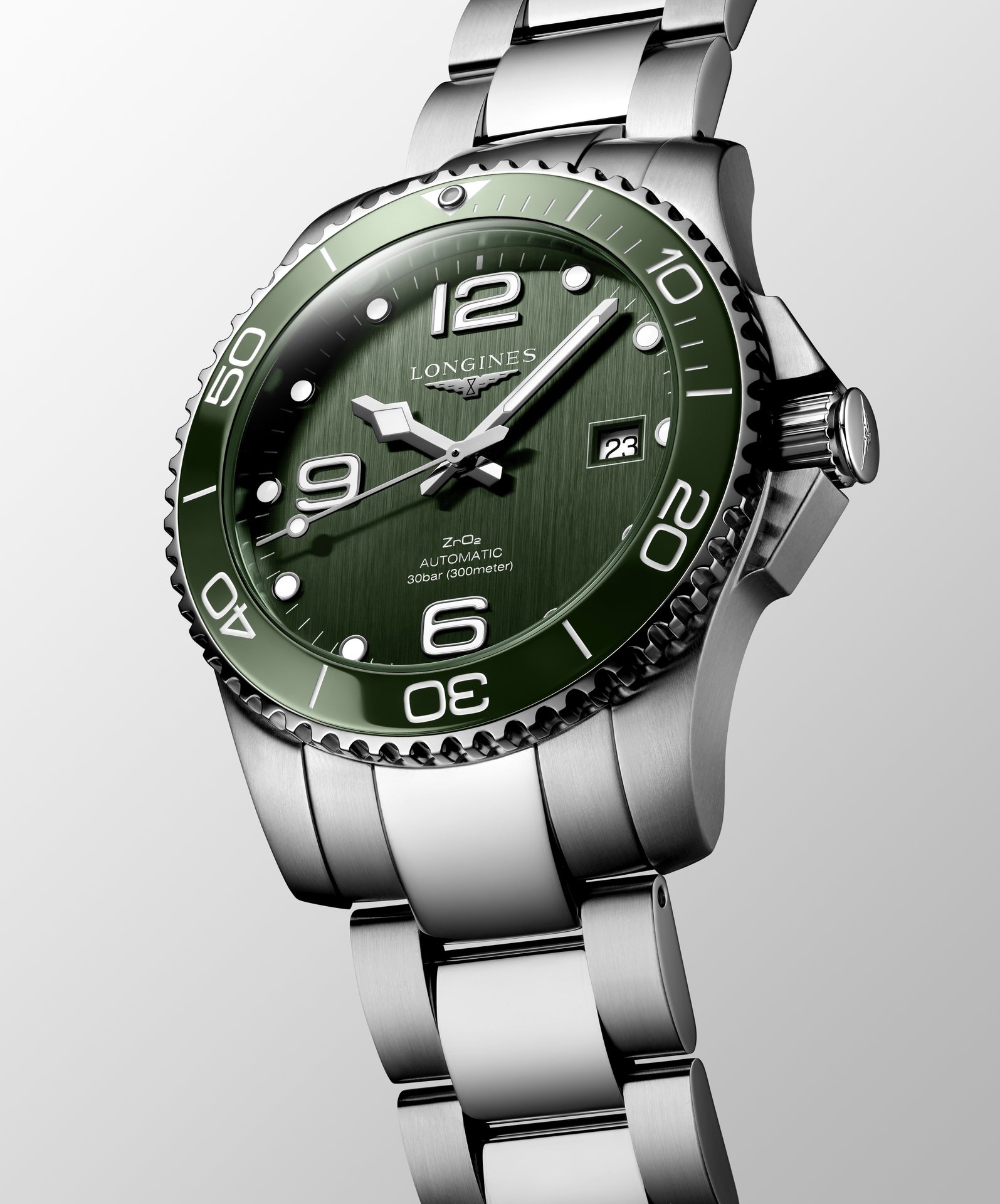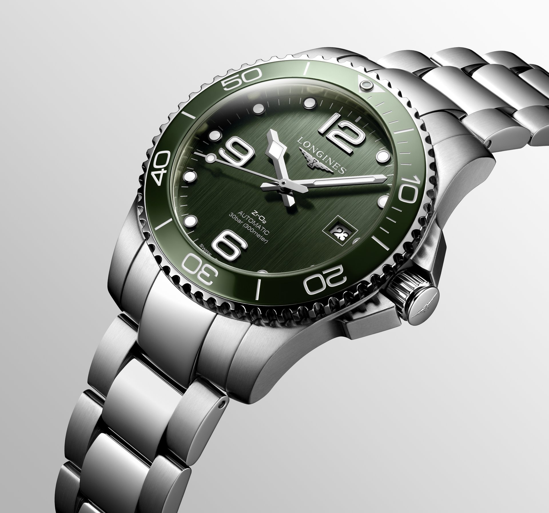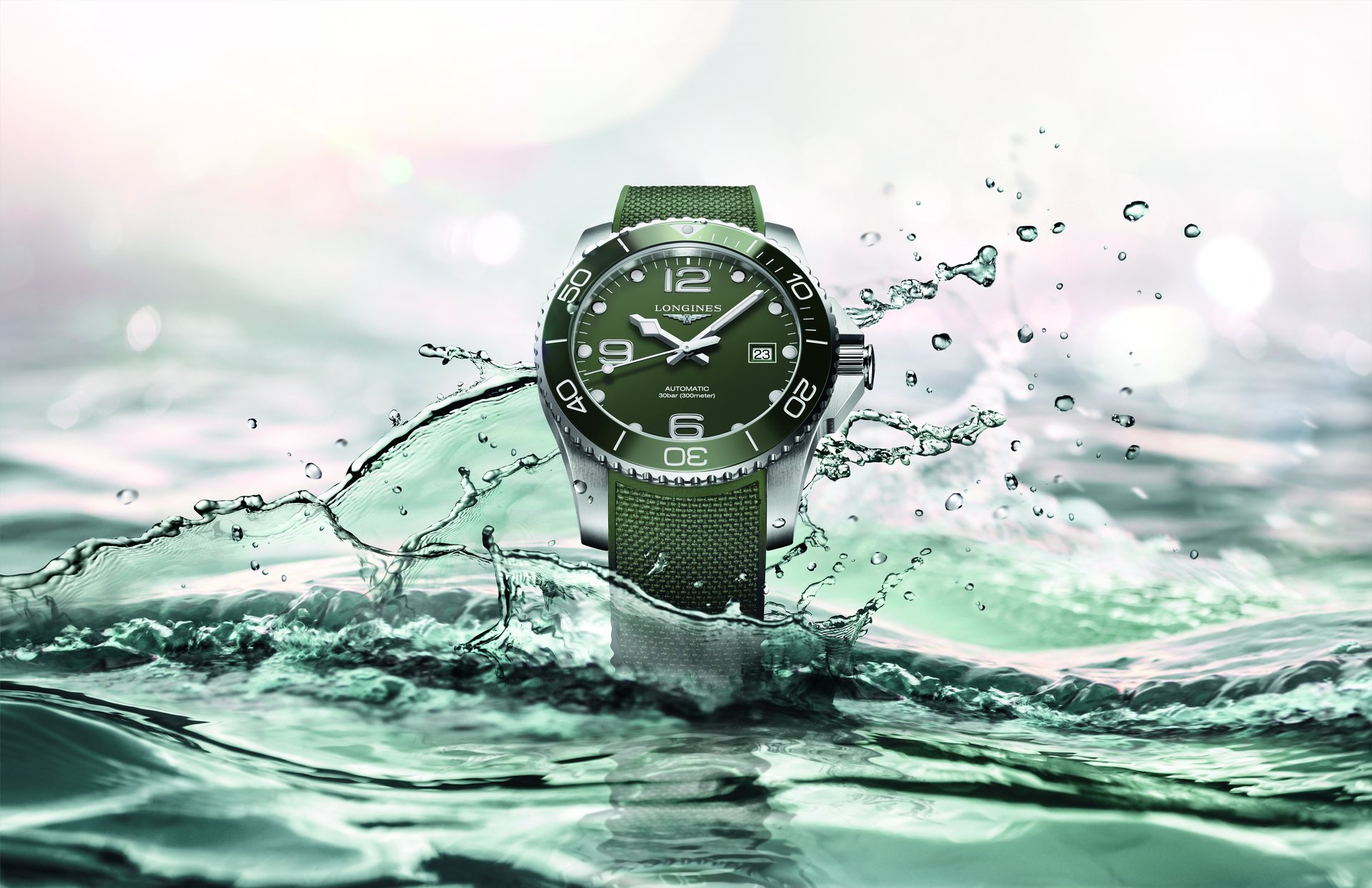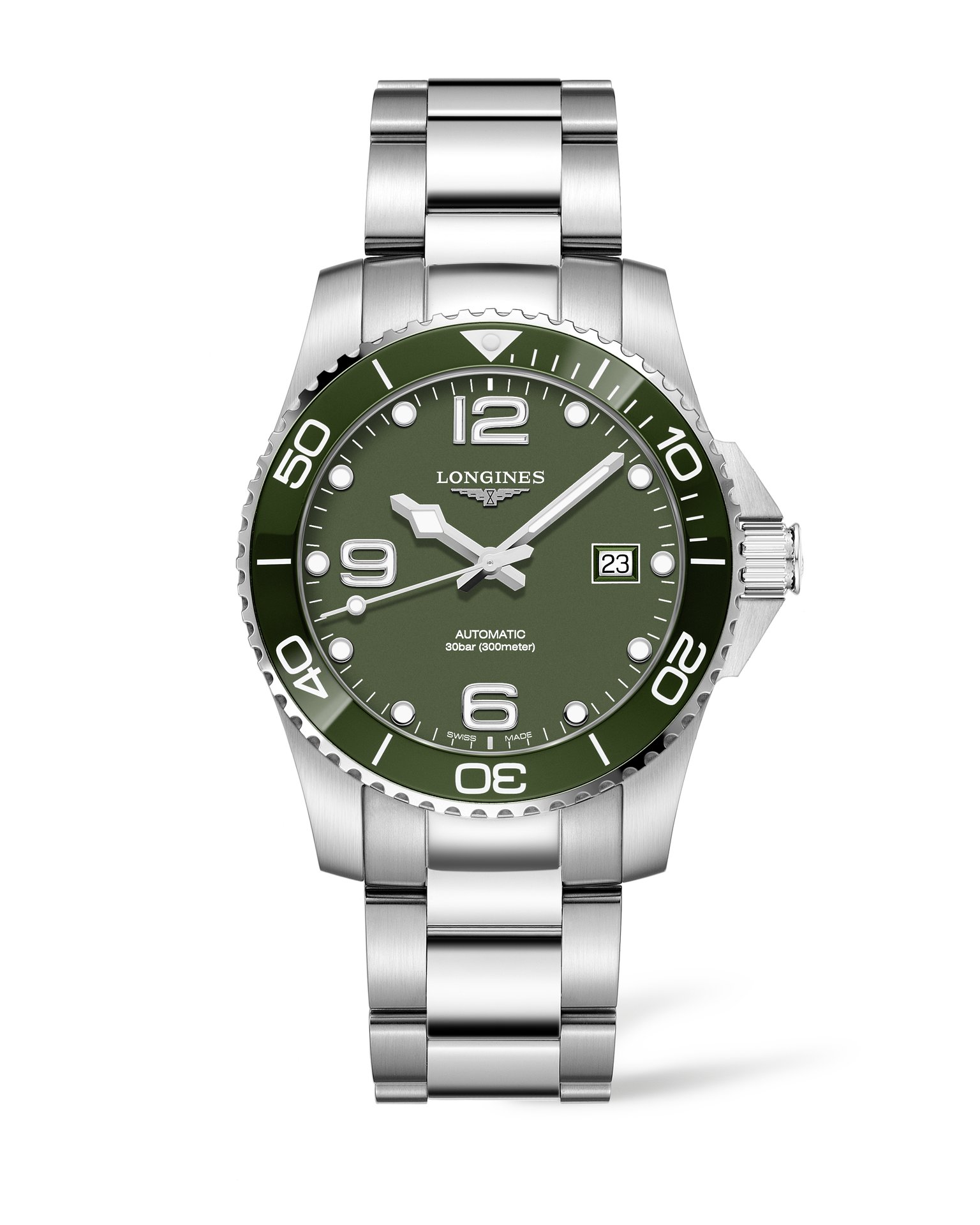 Whether in khaki or bright green, the new HydroConquest, which is the result of Longines’ expertise in the sports field, is sure to stand out with its sleek, bold look.