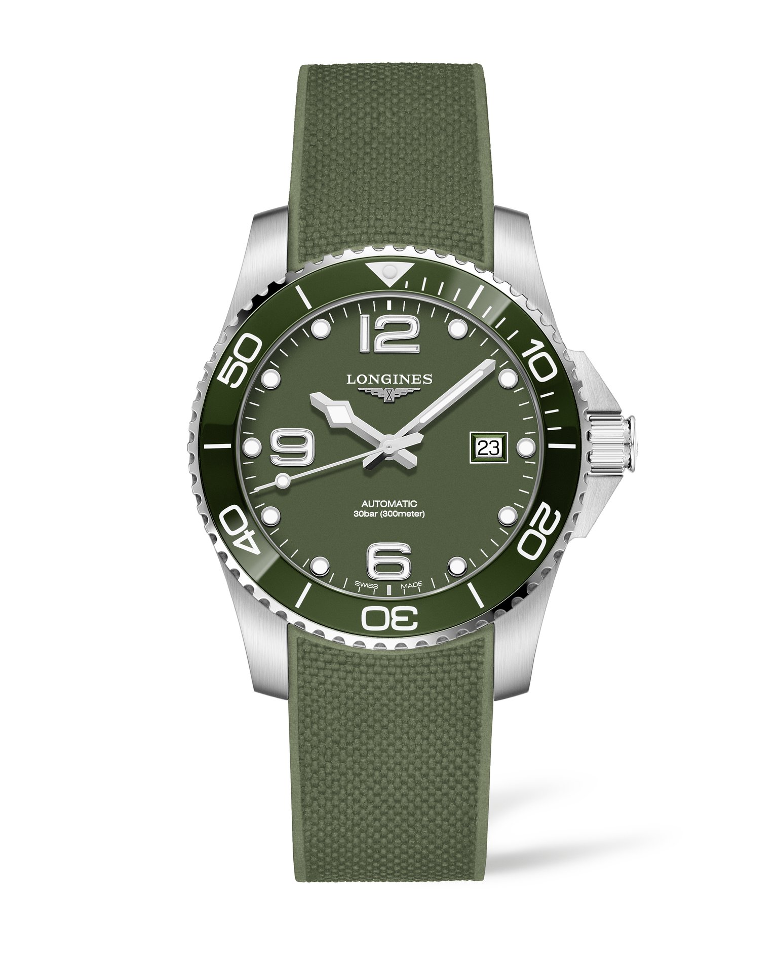 The green model is the perfect addition to the HydroConquest collection’s blue, grey and black timepieces. HydroConquest L3.781.4.06.9 The khaki model features a ceramic bezel insert that matches the colour of the dial and ties together the fully modernized design and sporty silhouette. Mounted on a stainless steel or green rubber strap, the watch, which is available in two sizes (41 or 43 mm in diameter), is powered by a self-winding mechanical movement (L888.3 calibre). Longines’ iconic HydroConquest collection meets the expectations of those who are drawn to the open sea.