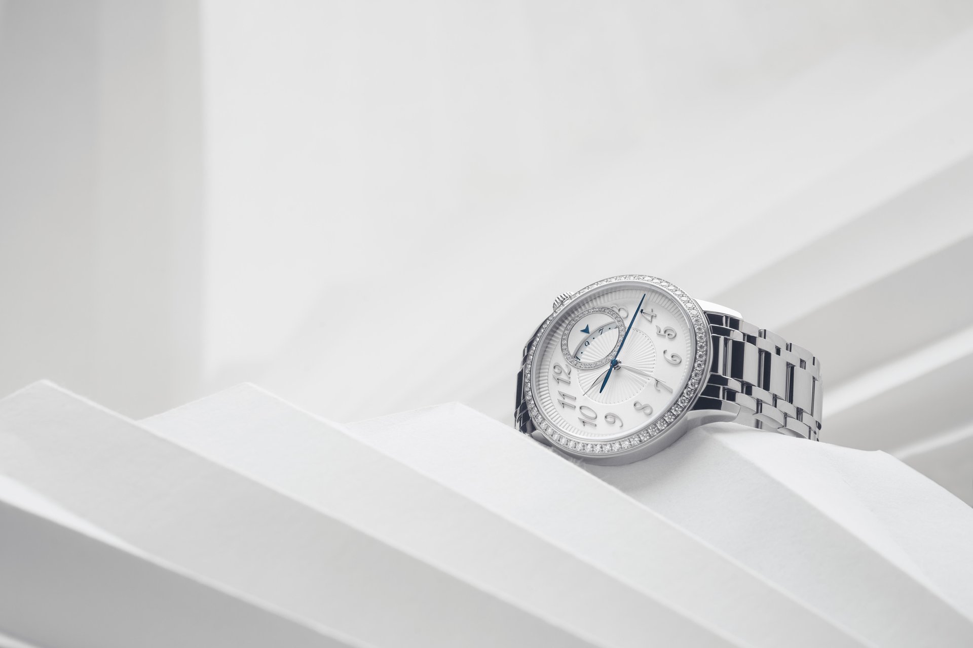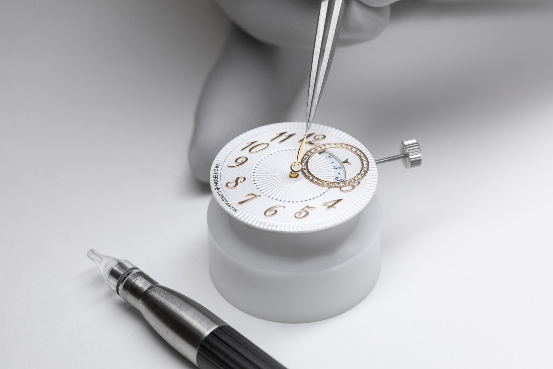 The 35 mm pebble-shaped case is crowned with a slender bezel overstitched with 58 diamonds. Extended by integrated lugs, it is punctuated between 1 and 2 o’clock by a crown adorned with a cabochon-cut moonstone, of which the soft shade melds flawlessly into the overall aesthetic. The dial sets the stage for a delicate opaline silver work of art inspired by the world of Haute Couture: composed of concentric circles, its centre and periphery are graced with a pleated pattern. Developed after several months of testing, this decoration was created in the Manufacture’s guillochage workshop using the historical “tapestry” technique. By dint of lengthy long and extremely subtle operations, the artisan adjusts the gears of a 1904 pantograph-type machine in order to reproduce a large format motif in a miniature version on the dial. The expertly wielded tip of the burin, regularly sharpened by the artisan, gives rise to the draped-effect motif of the Égérie dial. Specially designed for the collection, the calligraphic numerals evoke fine embroidery, while the leaf-type hours and minutes hands recall the fine needles used by the nimble fingers at work in Haute Couture ateliers. In a signature touch, the date appearing in a circle rimmed with diamonds draws on the tradition of Vacheron Constantin‘s off-centre displays.