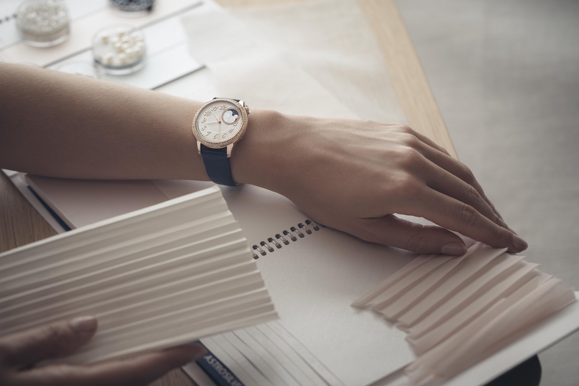 The Égérie moon phase model is available in steel set with 58 diamonds, while the crown is graced with a cabochon-cut moonstone, a symbol of calm and serenity, contributing to a particularly modern and dynamic version fitted with a metal bracelet. Both light and slim, it nestles on the wrist like a second skin, to the point where one could easily forget it is even there. For a more chic, sophisticated look, the case of the Égérie moon phase also comes in an 18K 5N pink gold version, likewise fringed with 58 diamonds and featuring a cabochon moonstone on the crown. Its versatile elegance is paired with three interchangeable leather straps, enabling the wearer to adopt a variety of looks as the fancy takes her.