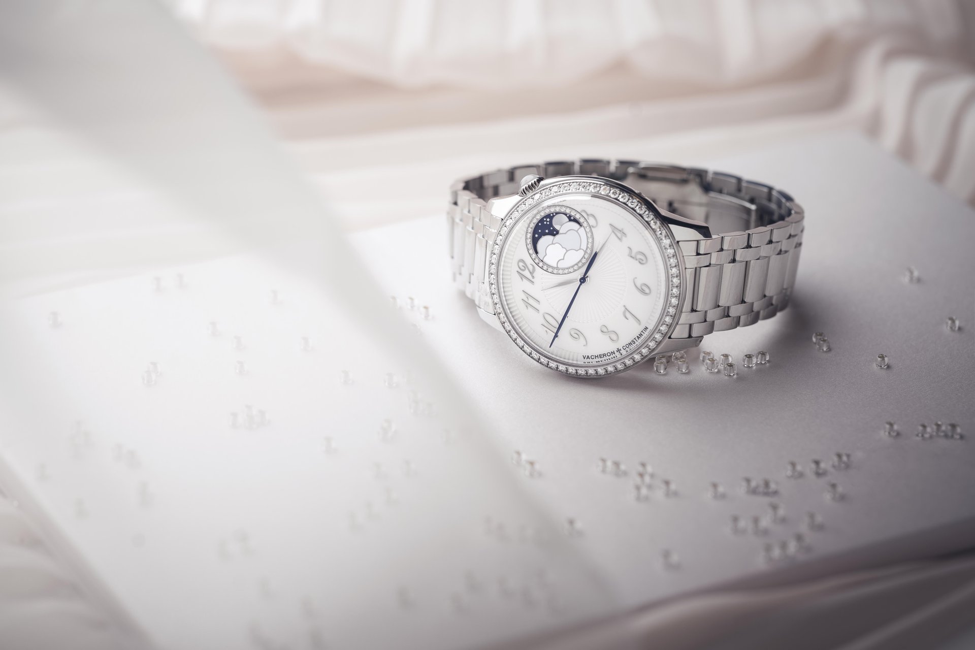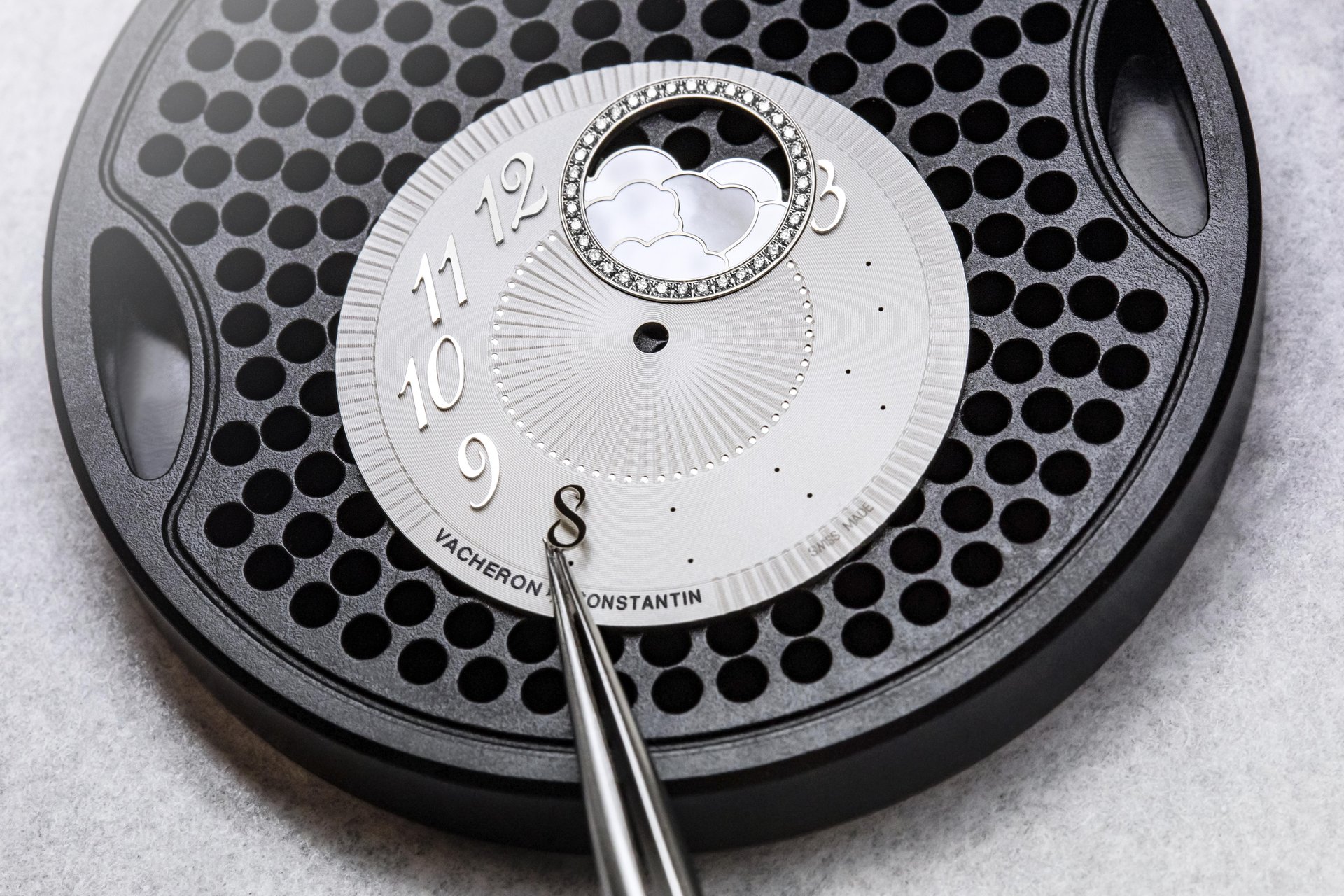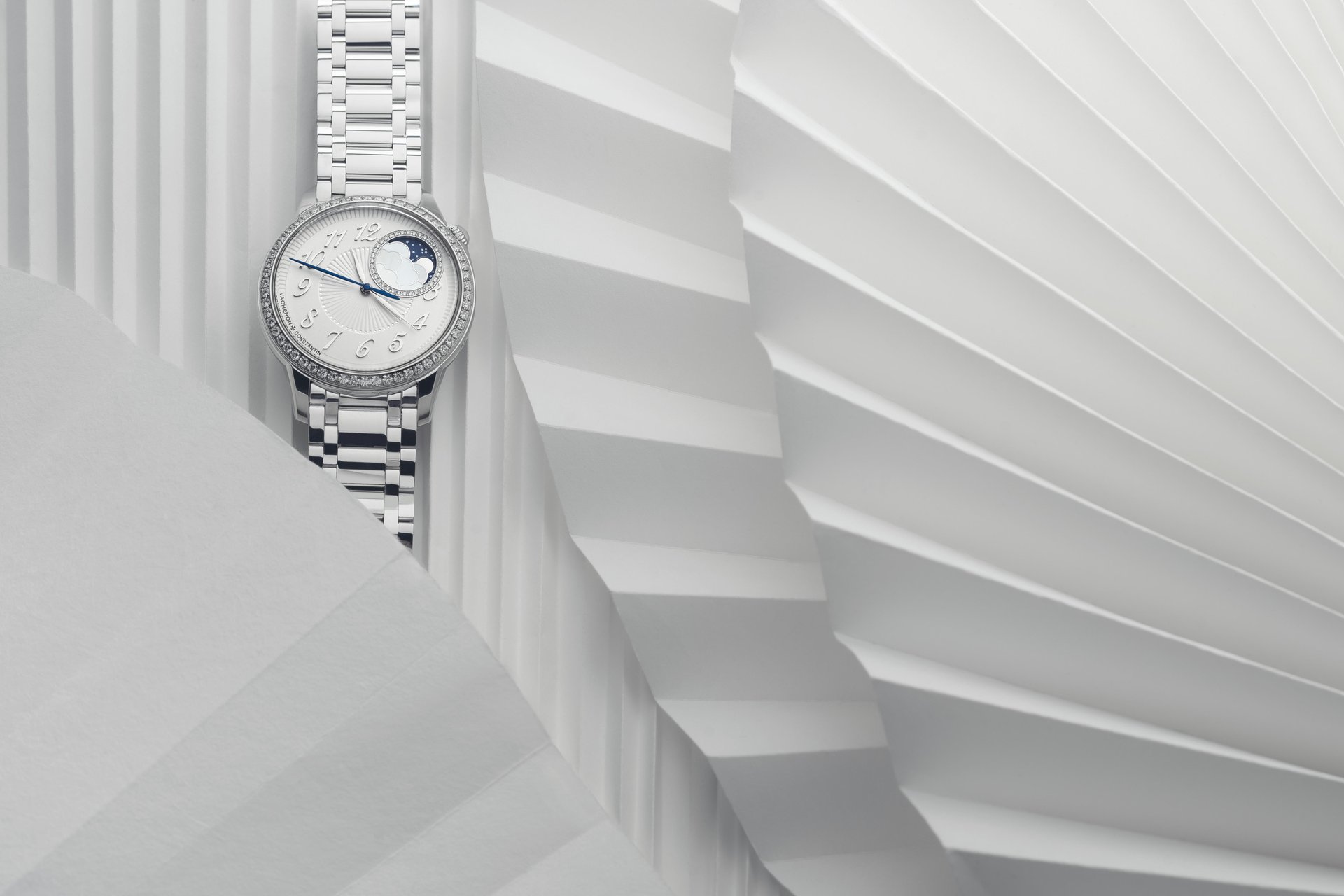 An offset circle glittering with 36 diamonds displays a dreamlike vision of time, with the 18K gold moon appearing in a starry sky revealed behind clouds formed by a delicate mother-of-pearl assembly. The enchanting charm of this model is further enhanced by its opaline silver dial and pleated pattern, developed after several months of testing and achieved using the ancient ‘tapestry’ technique. This delicate process, performed using a machine dating from 1904 and operating on the principle of the pantograph, serves to reproduce a miniaturised engraving based on a large-sized motif. This complex and meticulous operation calls for the greatest dexterity on the part of the Vacheron Constantin guilloché artisan.