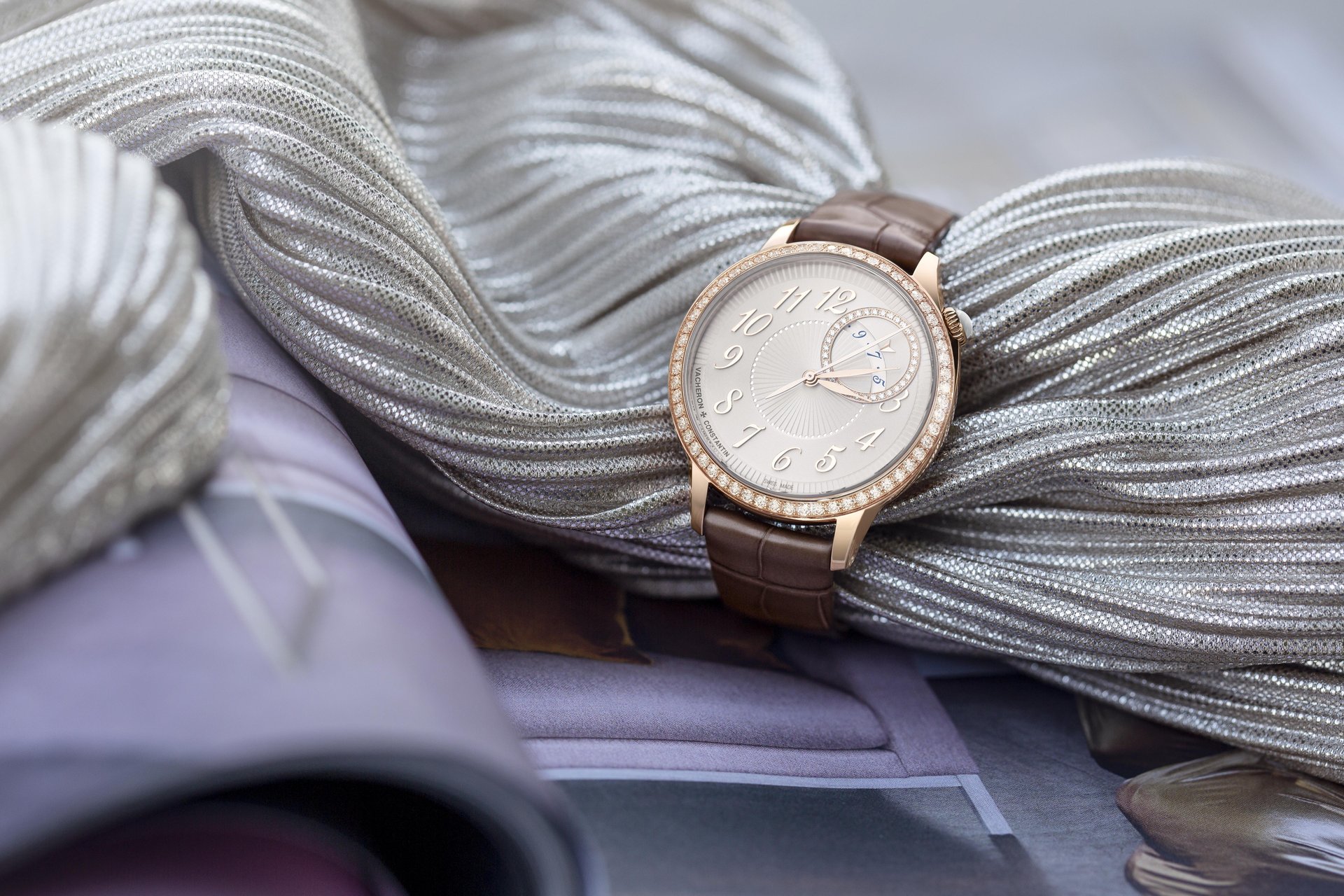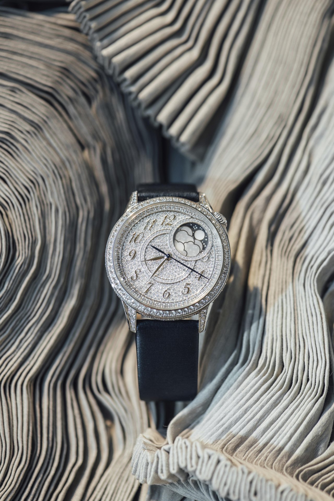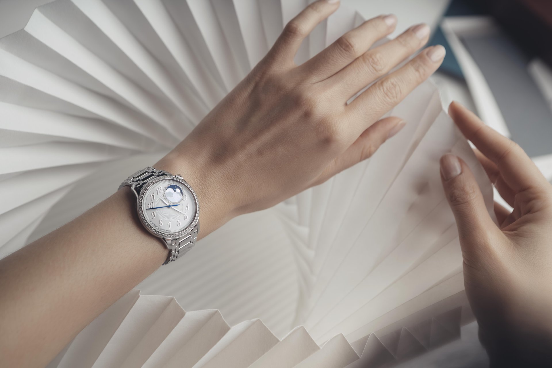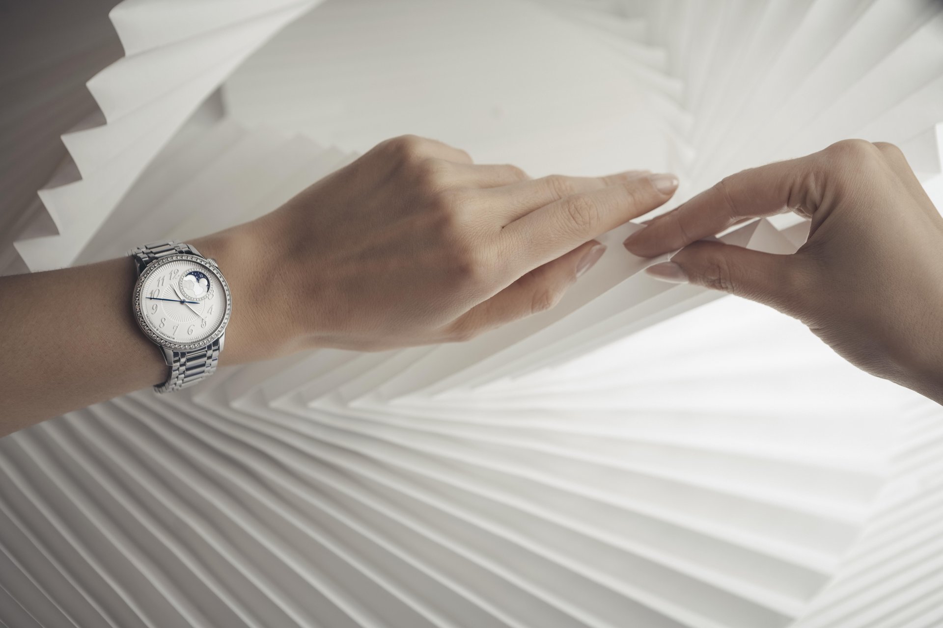 An offset circle glittering with 36 diamonds displays a dreamlike vision of time, with the 18K gold moon appearing in a starry sky revealed behind clouds formed by a delicate mother-of-pearl assembly. The enchanting charm of this model is further enhanced by its opaline silver dial and pleated pattern, developed after several months of testing and achieved using the ancient ‘tapestry’ technique. This delicate process, performed using a machine dating from 1904 and operating on the principle of the pantograph, serves to reproduce a miniaturised engraving based on a large-sized motif. This complex and meticulous operation calls for the greatest dexterity on the part of the Vacheron Constantin guilloché artisan.