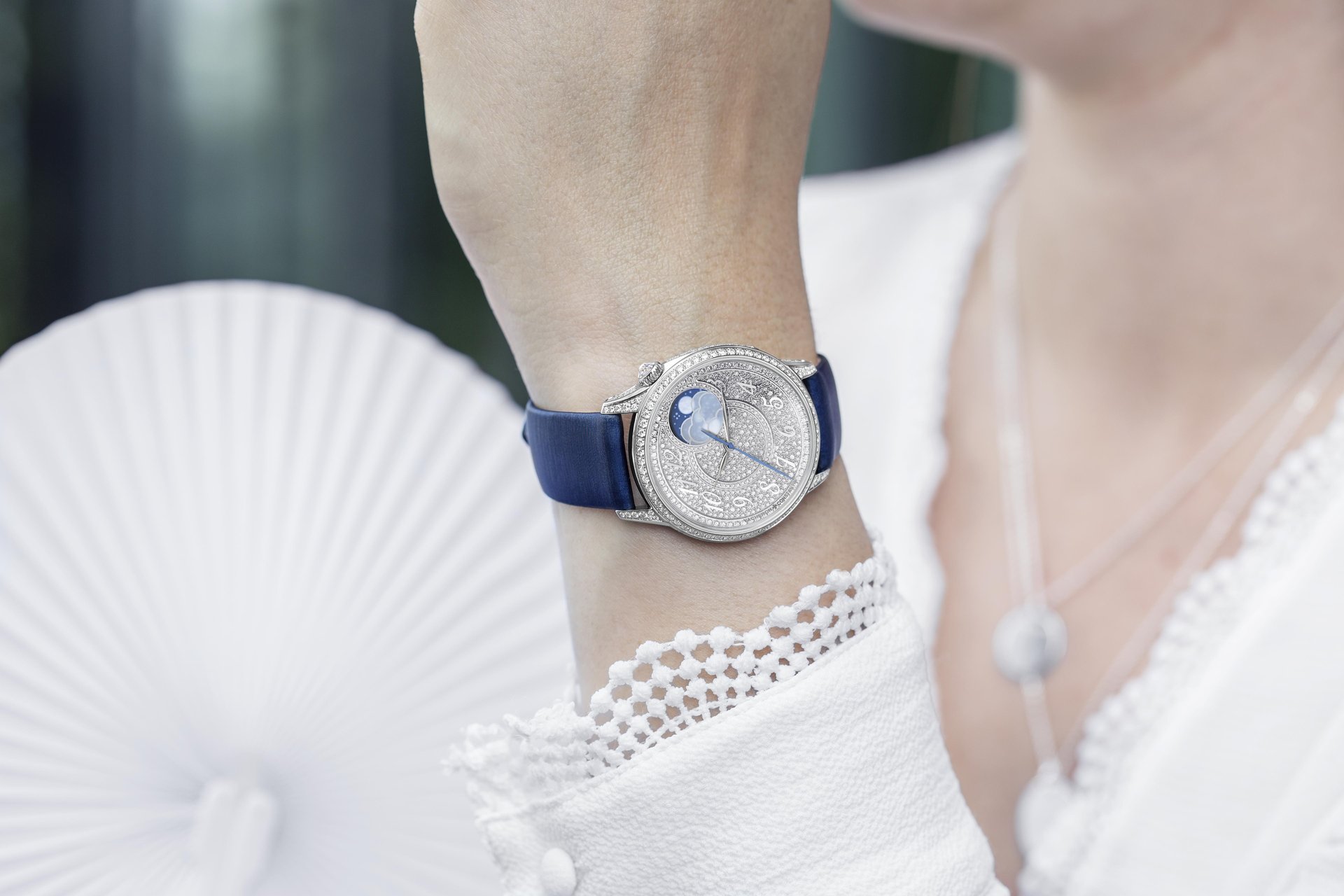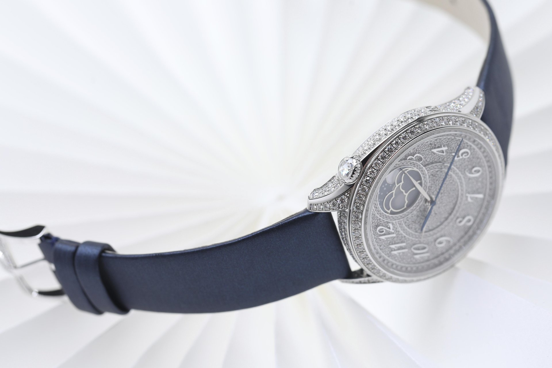 Framed by diamonds, the arresting sight of the mother of pearl star pursuing its majestic path beneath a translucent sapphire crystal naturally draws the gaze, while the winding crown is adorned with a rose-cut diamond. These flamboyant interpretations embrace the wrist with two easily interchangeable night blue straps, one in leather and the other in satin, each secured by a gemset pin buckle.