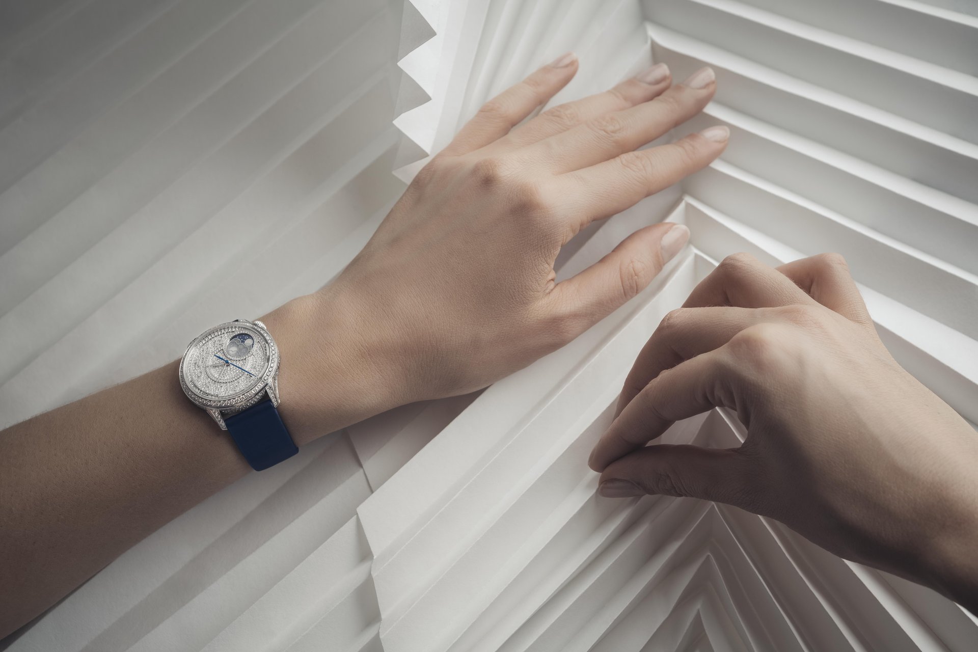 When night falls, the Égérie moon phase diamond-pavé model leads the dance in a stunning evening gown. Its case in 37 mm 18K white gold sparkles with 292 diamonds, while the dial deploys its concentric circles amid a shower of 510 diamonds resembling a precious embroidery. An Haute Couture look that brilliantly showcases the masterful touch of the Manufacture’s finest gem setters.
