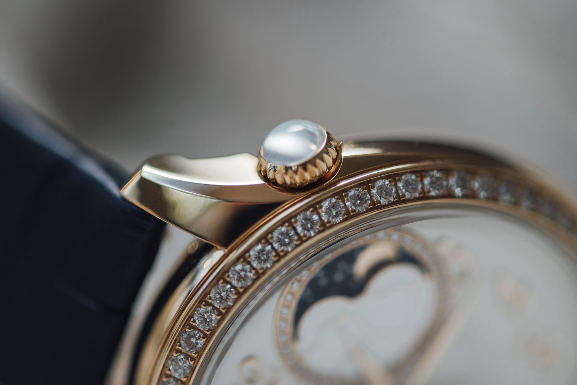 Égérie is also the modern interpretation of aesthetic codes cherished by Vacheron Constantin, which has been offering off-centre displays since the early 19th century, notably by playing on two intertwined circles. Égérie has made this its signature touch. The date or moon-phase integration is thus part of a subtle diagonal line formed by the Vacheron Constantin logo and the crown daringly taking its place between 1 and 2 o’clock. Depending on the model, the latter is adorned with a cabochon-cut moonstone or a rose-cut diamond. This creative freedom is driven by a bold spirit that makes all the difference.