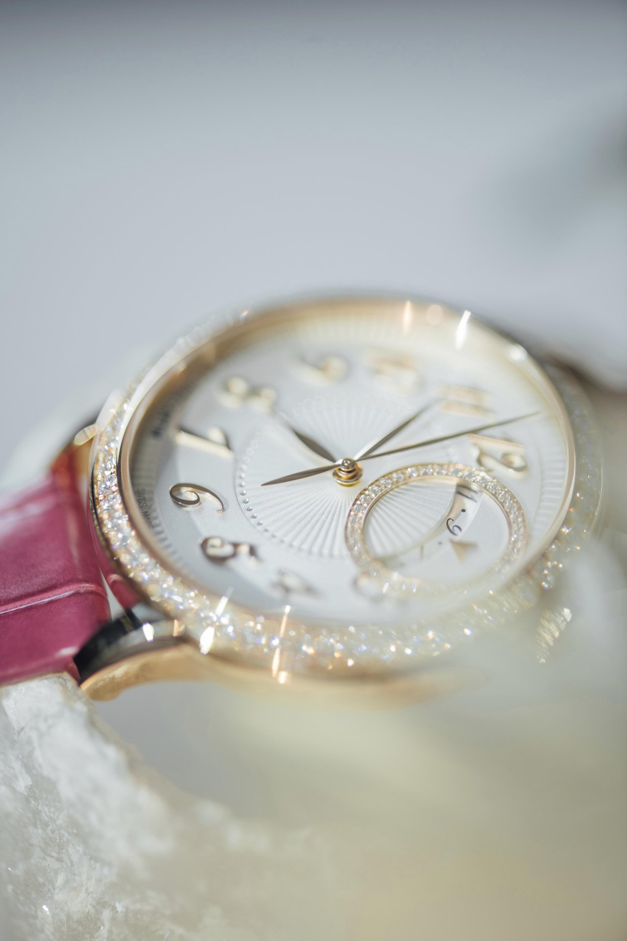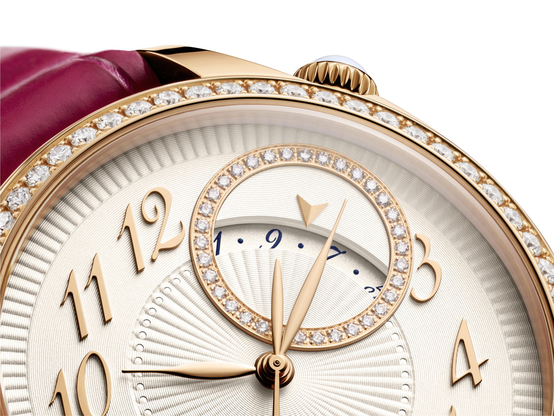 - Cases in pink gold, white gold or steel, set with diamonds, available in 35 mm and 37 mm diameters.