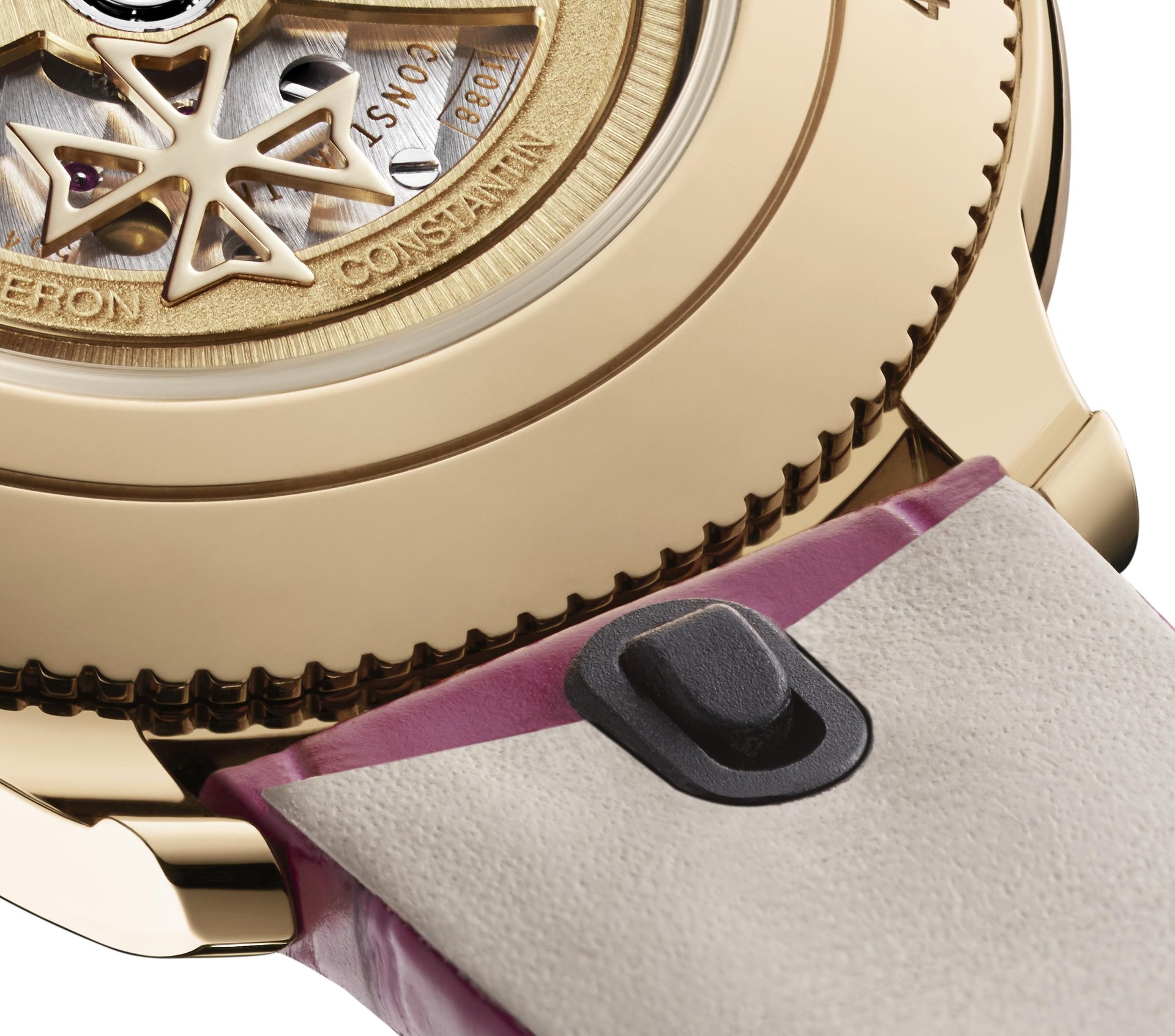 - 4605F/000R-B496: delivered with three self-interchangeable Mississippiensis alligator leather straps (semi-mat raspberry pink, night blue and candied chestnut with satin effect), each strap equipped with an 18K 5N pink gold ardillon buckle
