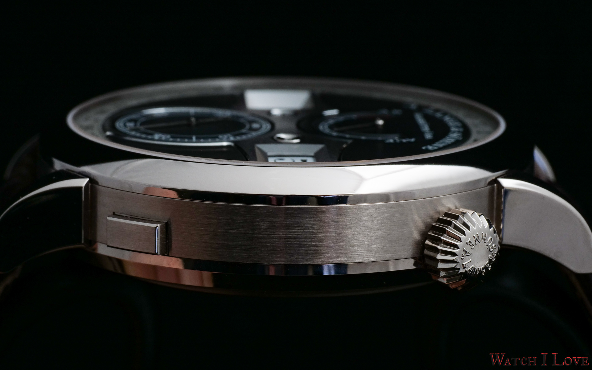 The A. Lange & Söhne Zeitwerk Date comes in a 44.2 mm white gold case. The height of 12.3 mm creates the feeling of a much-balanced proportion than the 41.9mm diameter, 12.6 mm height of the classic Zeitwerk.