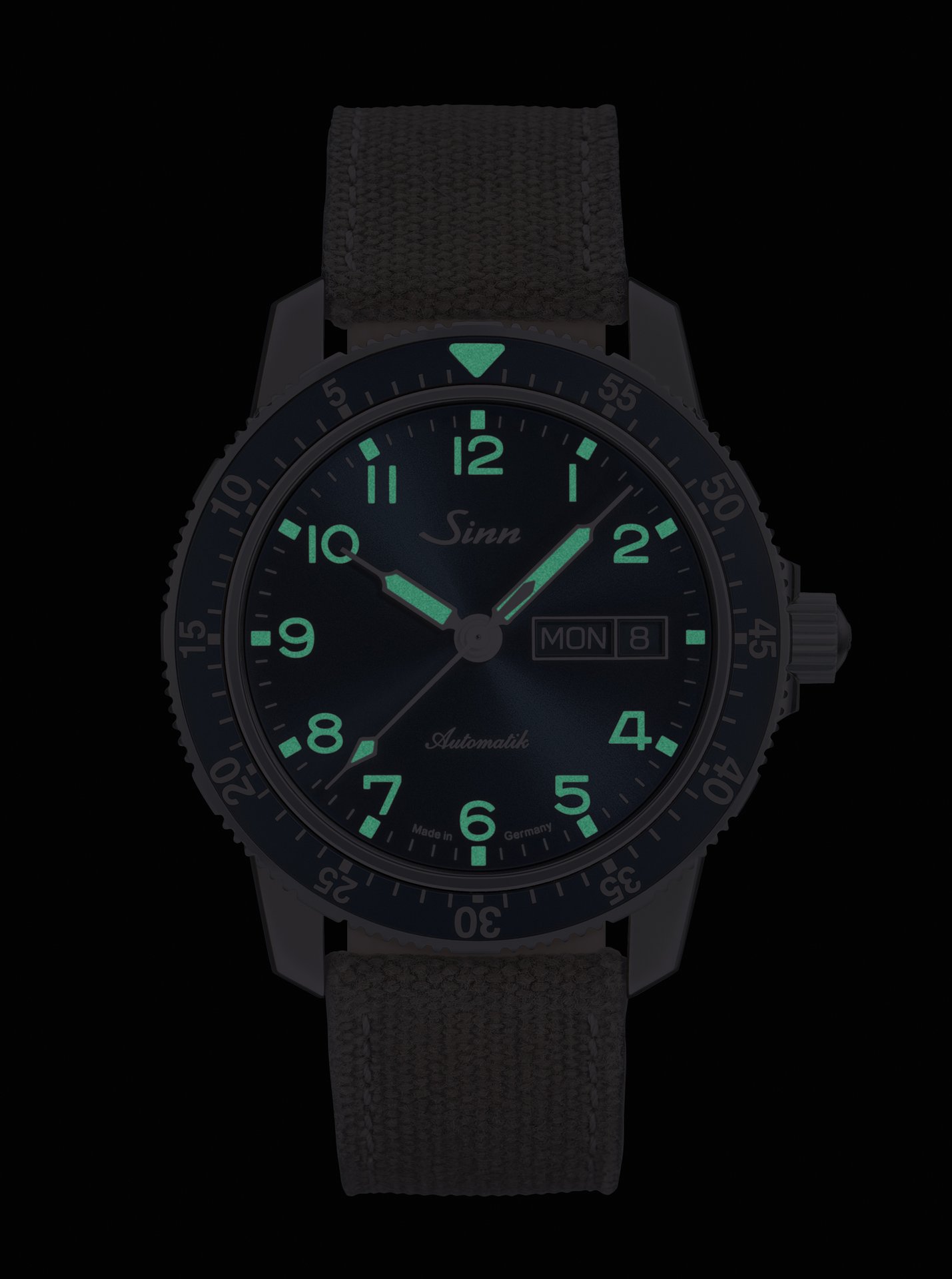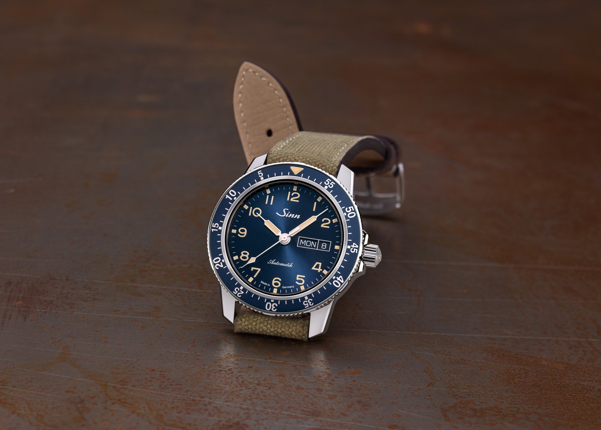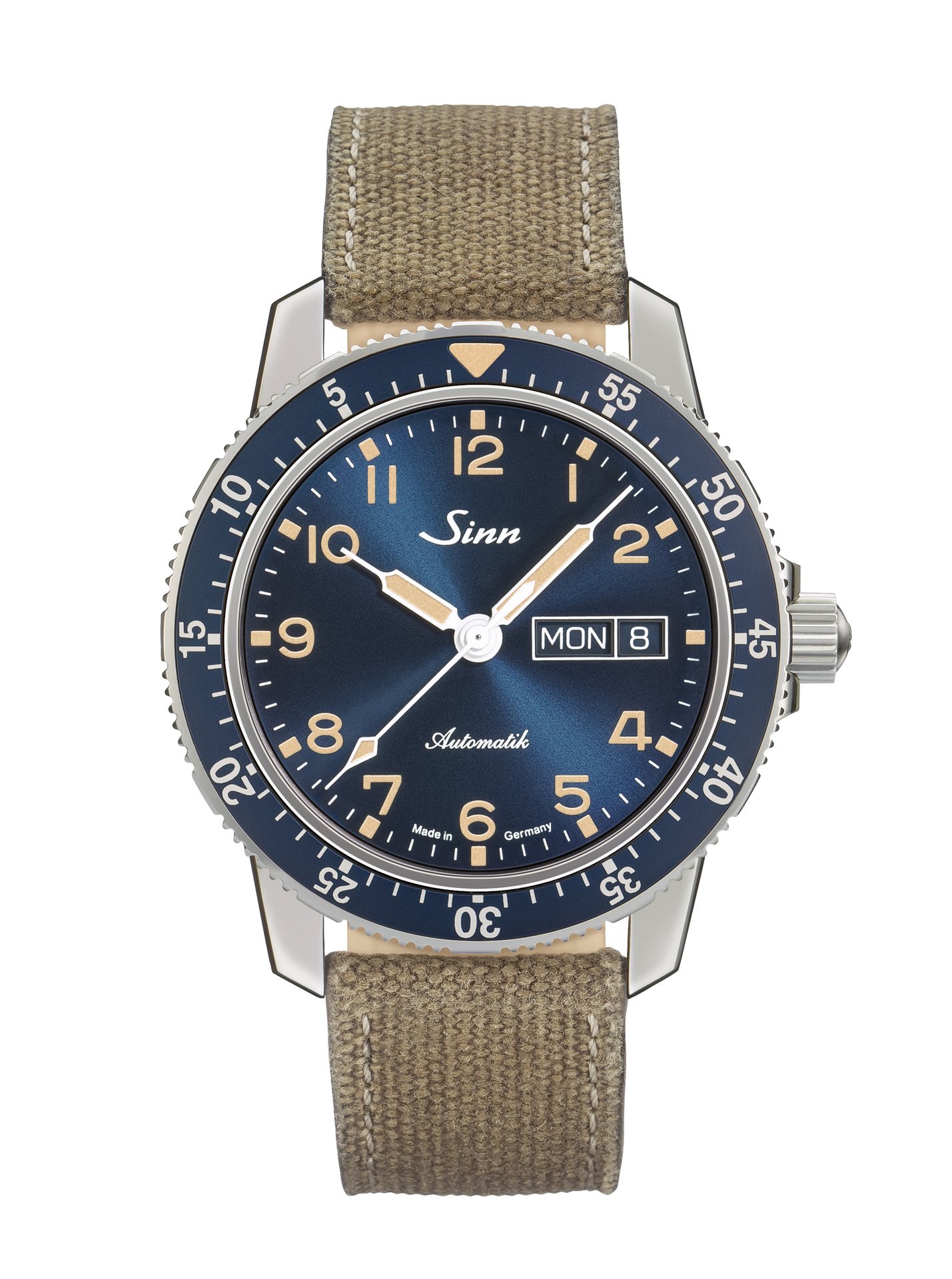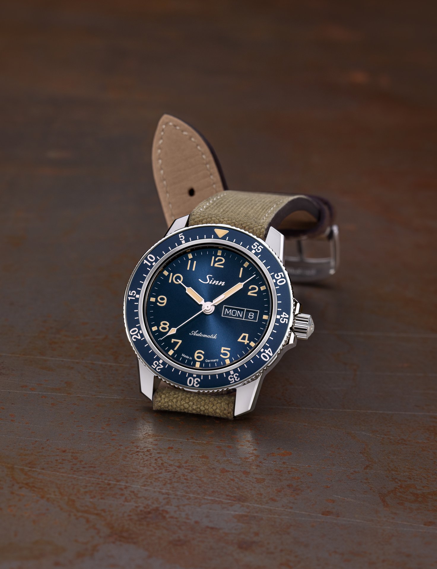 The Sinn 104 St Sa A B E model is distinguished by its dark-blue dial with sunburst decoration. This elegant colour complements the anodised aluminium pilot’s bezel. It imparts a special charm to this limited-edition timepiece (limited to 1,000 units) from the range of classic pilot watches. We have attached the pilot’s bezel securely to the polished stainless-steel case. As a harmonious contrast to the blue colouring of the dial and pilot’s bezel, the indices, hands and numerals have an ivory coating – a colour accent that immediately invokes memories of historic pilot watches.