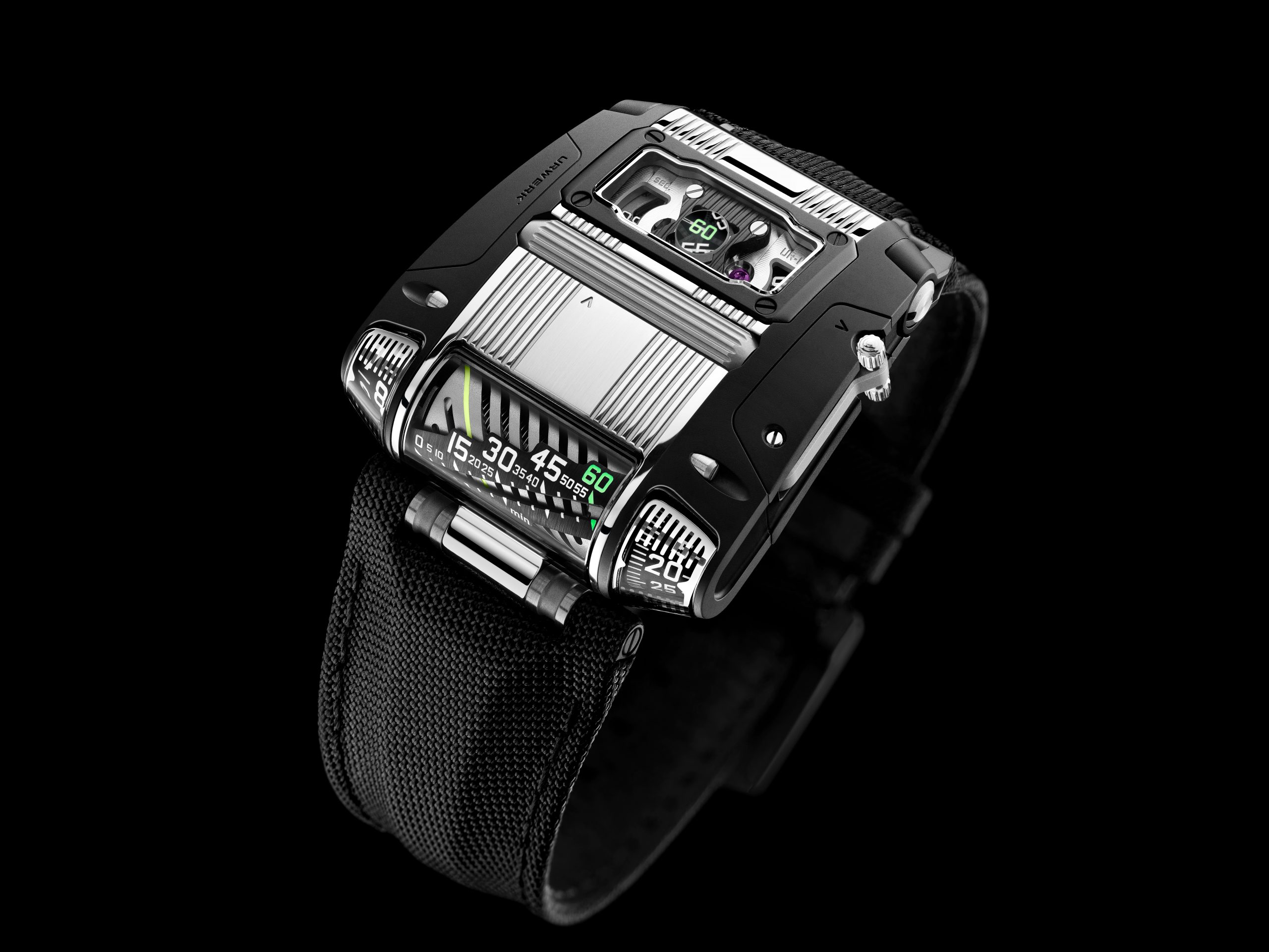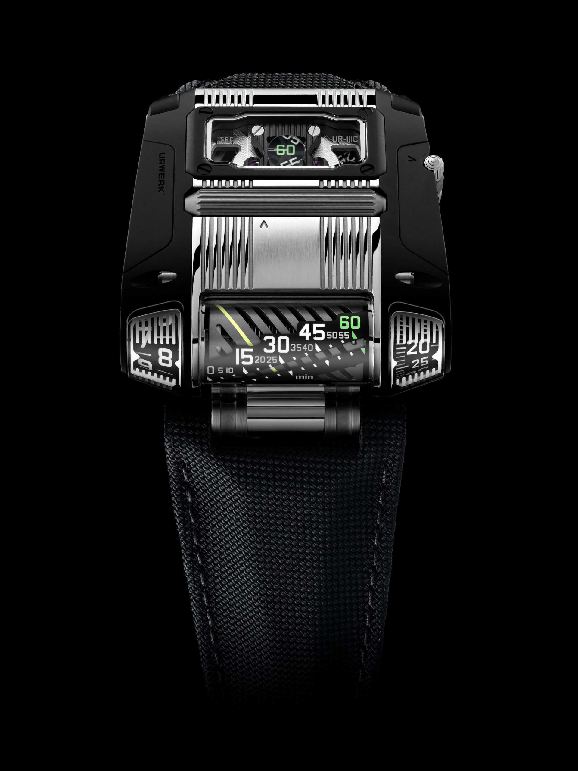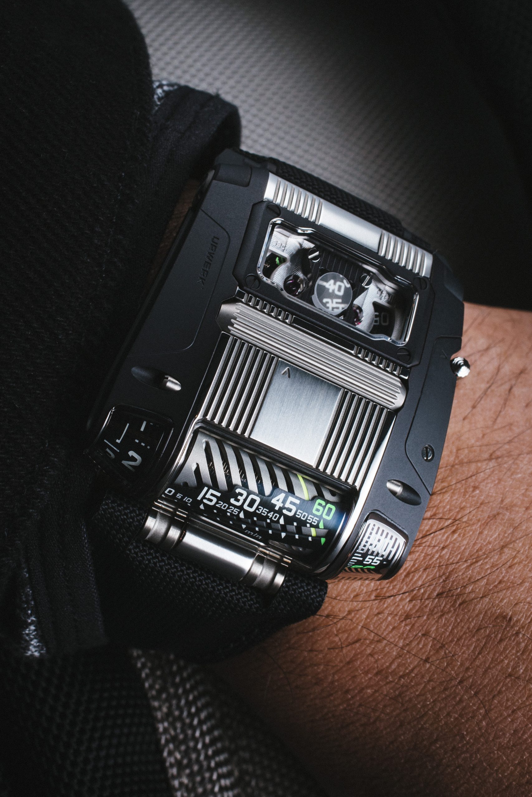 Of course, arranging all these micro-mechanics to create the end form of the UR-111C watch has been no easy task. The transmission had to be reimagined to allow a horizontal movement to provide a vertical time read-out within the crystal glass-covered truncated cones to both sides of the linear display. Connecting a roller crown to the winding stem likewise took feats of engineering, minuscule in scale but no less striking in effect.