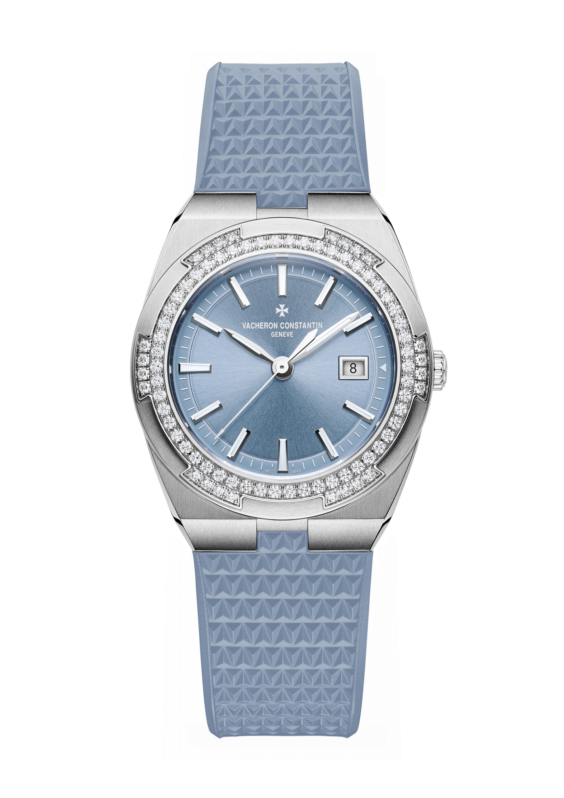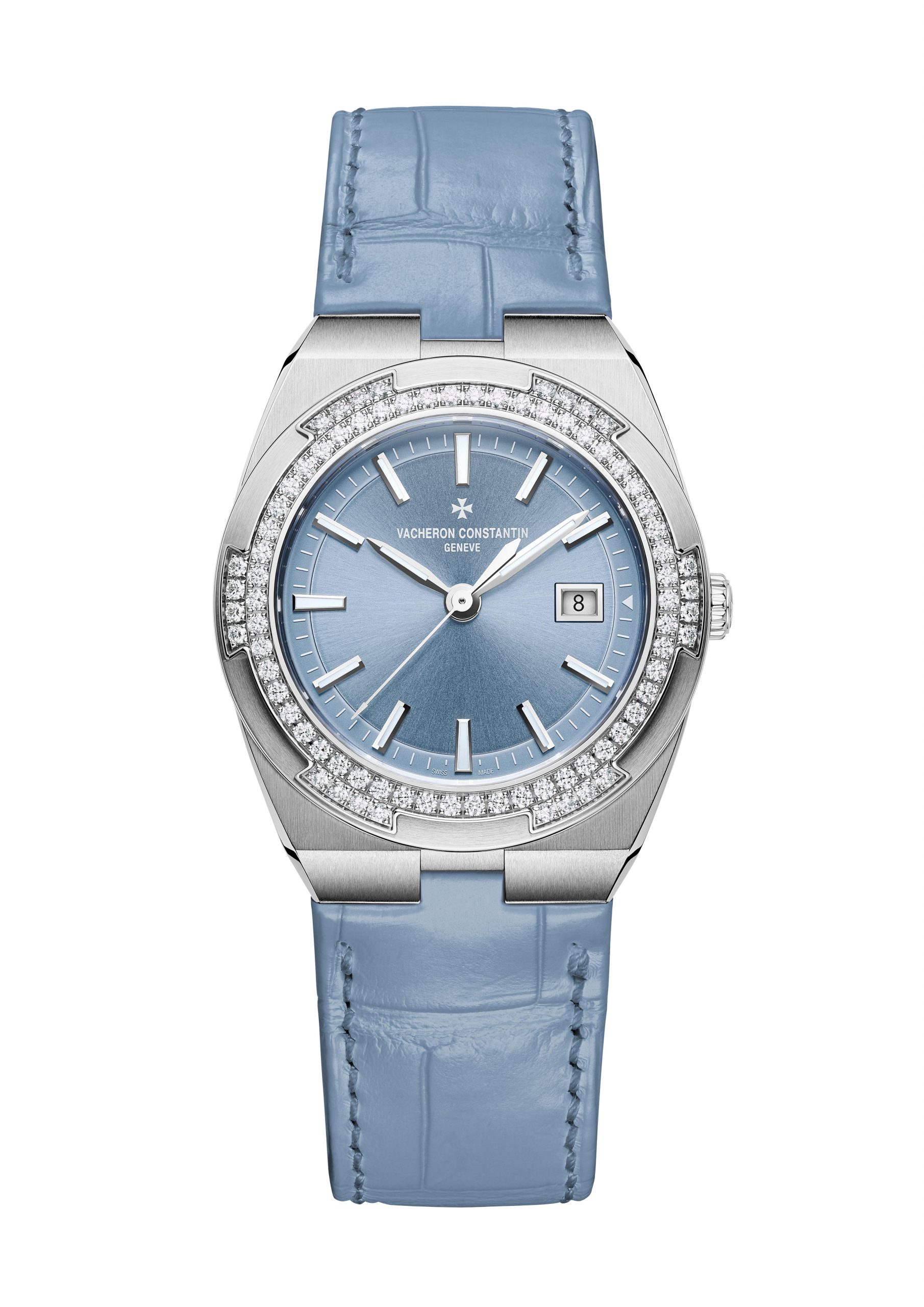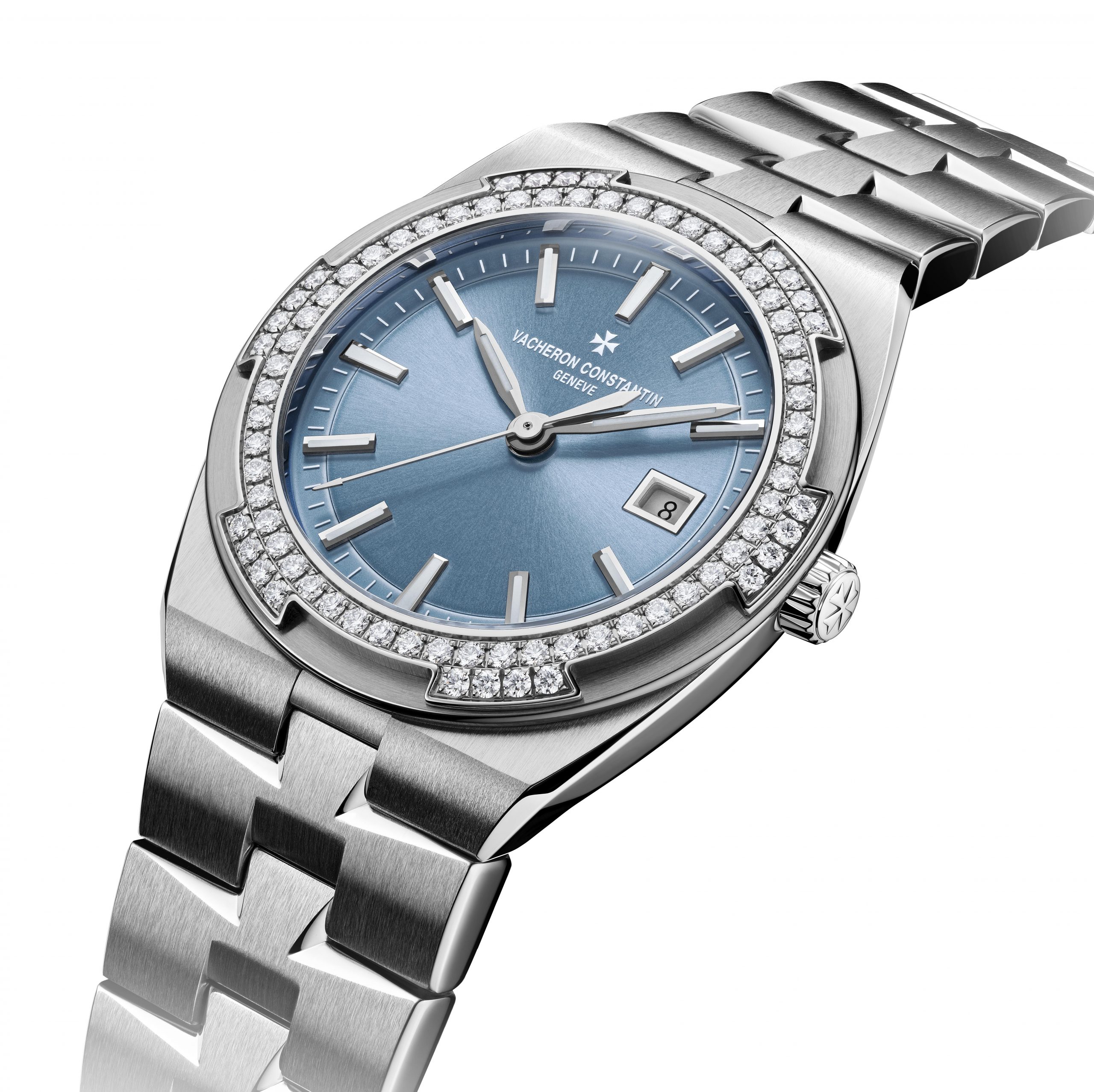 The Vacheron Constantin Overseas collection embraces its feminine side. Two new timepieces welcome time on a silver-toned lacquered dial for the version in 18K 5N pink gold and an original denim blue lacquered dial for the steel variation. The six-sided bezels adorned with “brilliant”-cut diamonds light up the path of the hands and the date appearing at 3 o’clock.