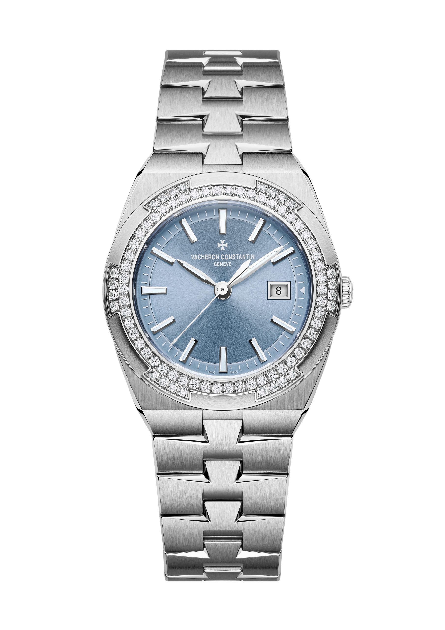 The new Overseas 33 mm models offer a delightful blend of femininity, dainty charm and sportiness. The six-sided bezel of these two models, shaped in a manner reminiscent of Vacheron Constantin’s emblematic Maltese cross, is adorned with 78 “brilliant”-cut diamonds. The sunburst satin-brushed lacquered dials make a pleasing contrast with the facetted luminescent hands and hour-markers. The silver-toned version is particularly suited to gold, while the steel interpretation adopts the new denim blue lacquered shade specially developed for this model.