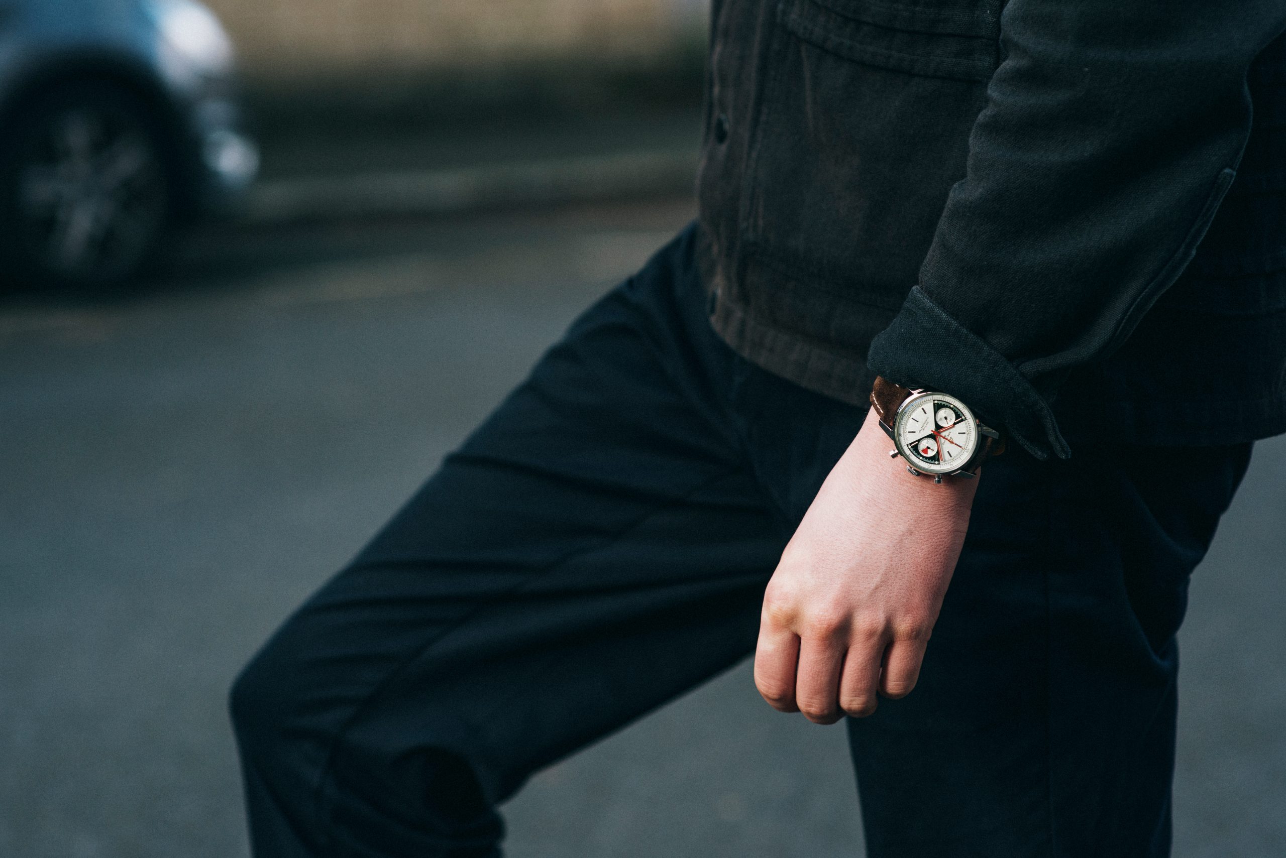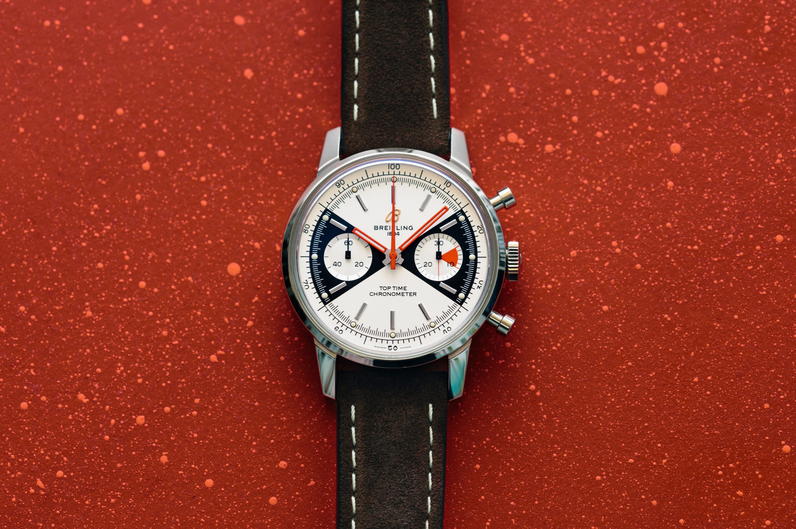 Inside the Top Time’s 41-millimeter stainless-steel case is a Breitling Caliber 23 chronograph movement with a power reserve of approximately 48 hours. Its accuracy is confirmed by its status as a COSC-certified chronometer. The red hour and minute hands as well as the dot markers for each hour are coated with Super-LumiNova®, a luminescent material that ensures legibility in all lighting conditions. Along with the central hour, minute, and chronograph second hands, the dial also features a decimal scale and two subdials – a small second counter at the 9 o’clock position and a 30-minute counter with unique red accents at 3 o’clock. The new Breitling Top Time’s modern retro look is perfectly complemented by its brown nubuck leather strap. This striking watch is limited to 2000 pieces, and its caseback is engraved with “ONE OF 2000.”