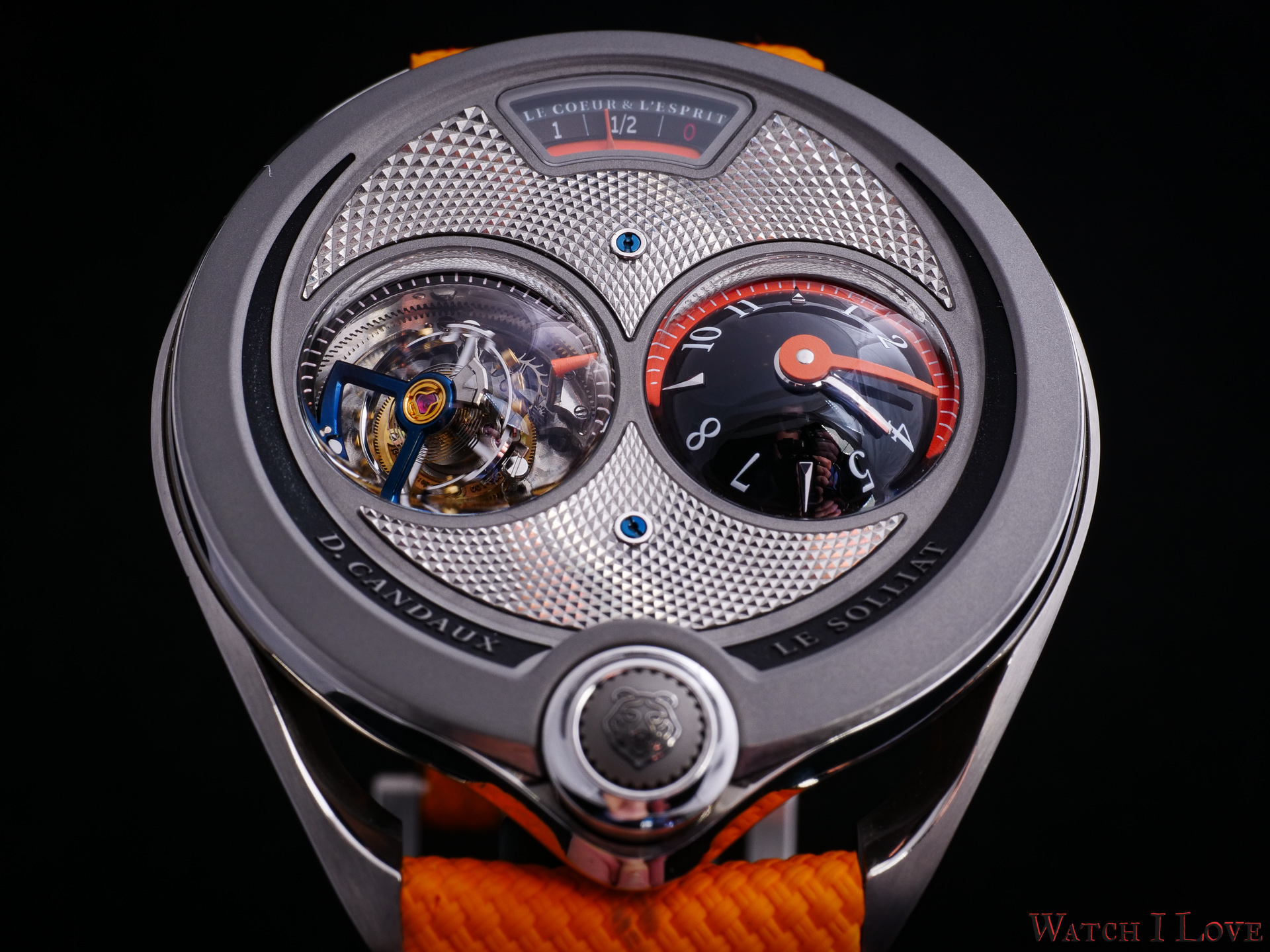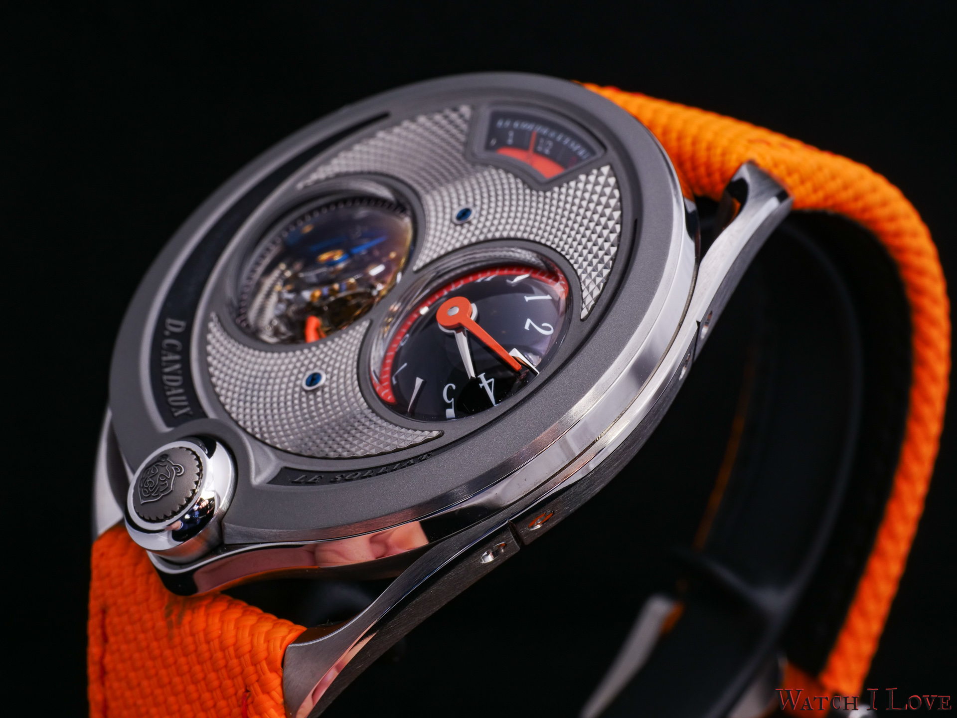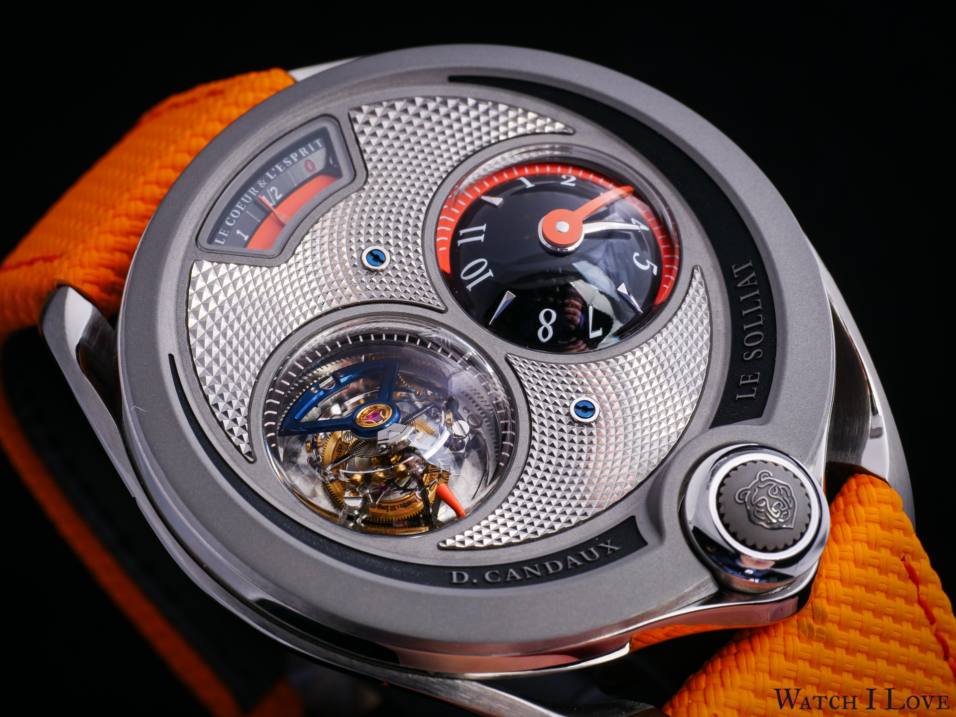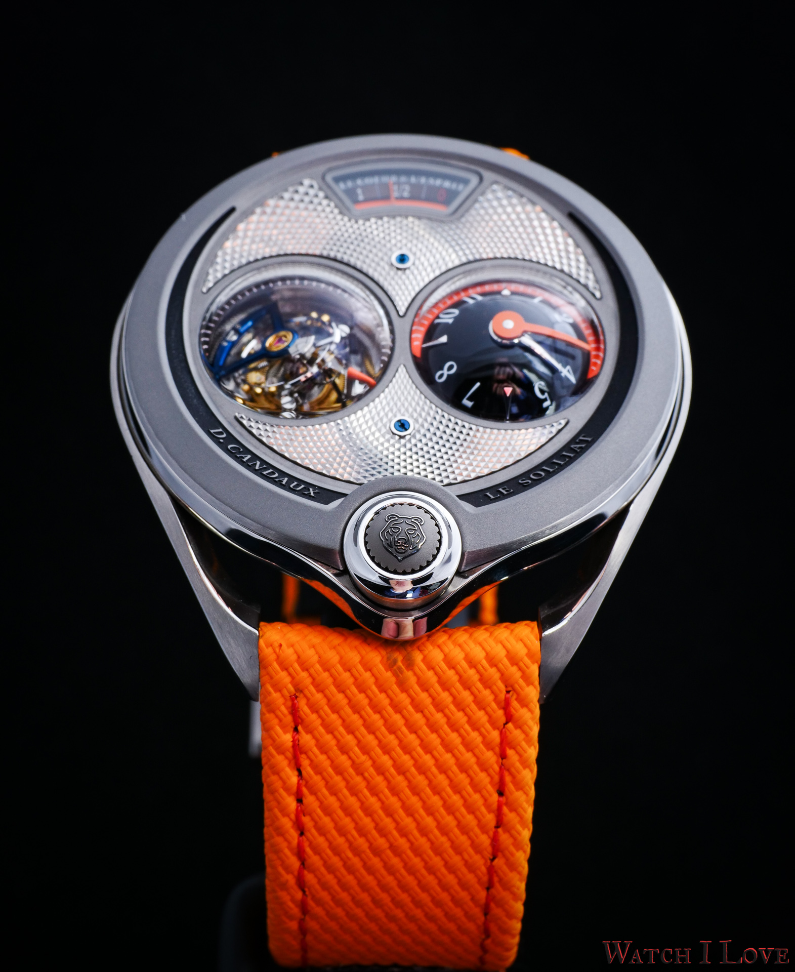 DC6 Half Hunter is an original concept. The unusual watch’s layout displays all the functions on top. I find the “magic crown” a cool gimmick – it looks great and it feels great. The automotive-inspired power reserve reminds me of the fuel gauges of old cars. The view of the tourbillon makes a nice balance with the domed time display.