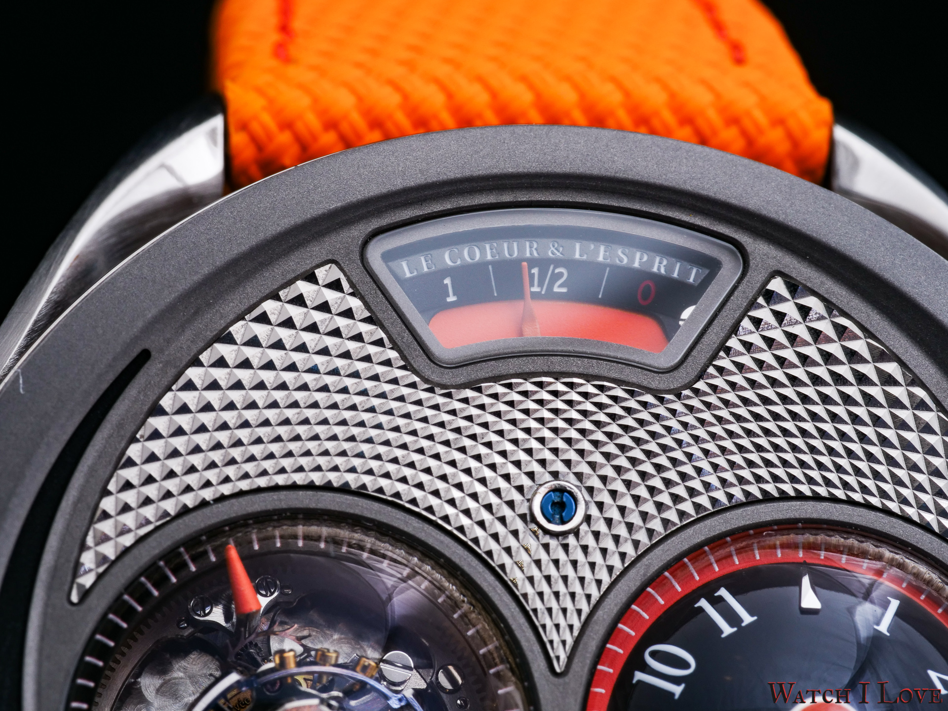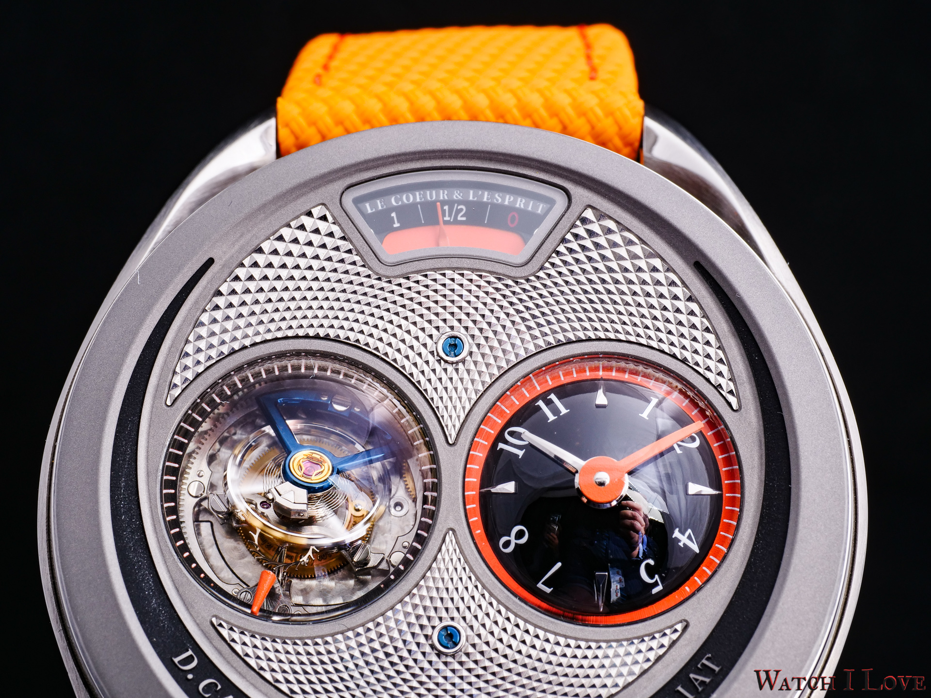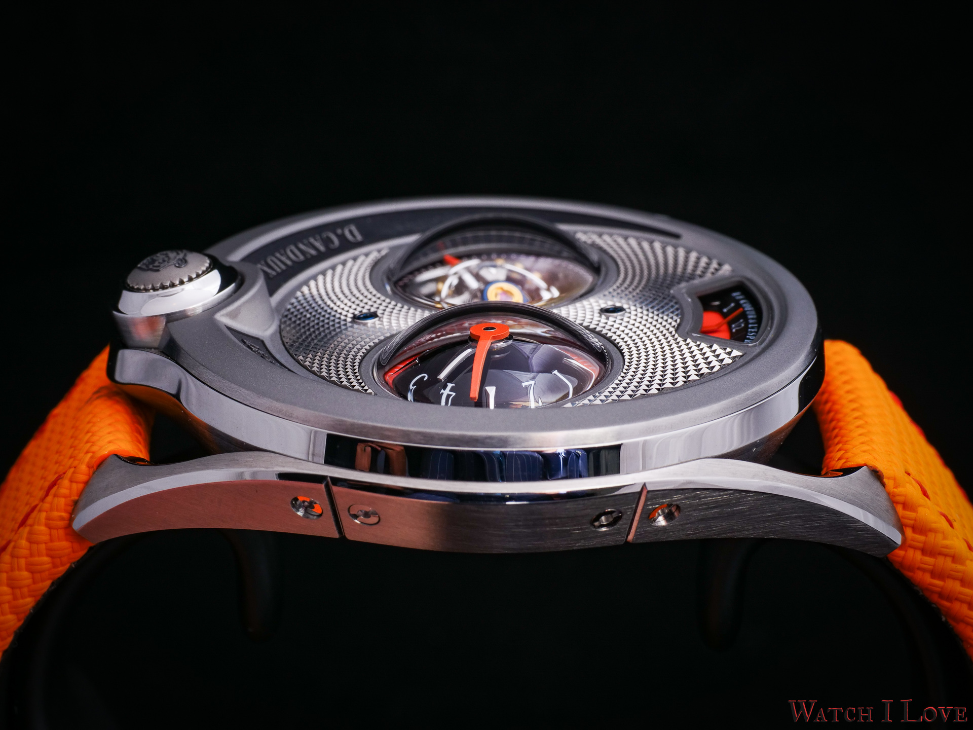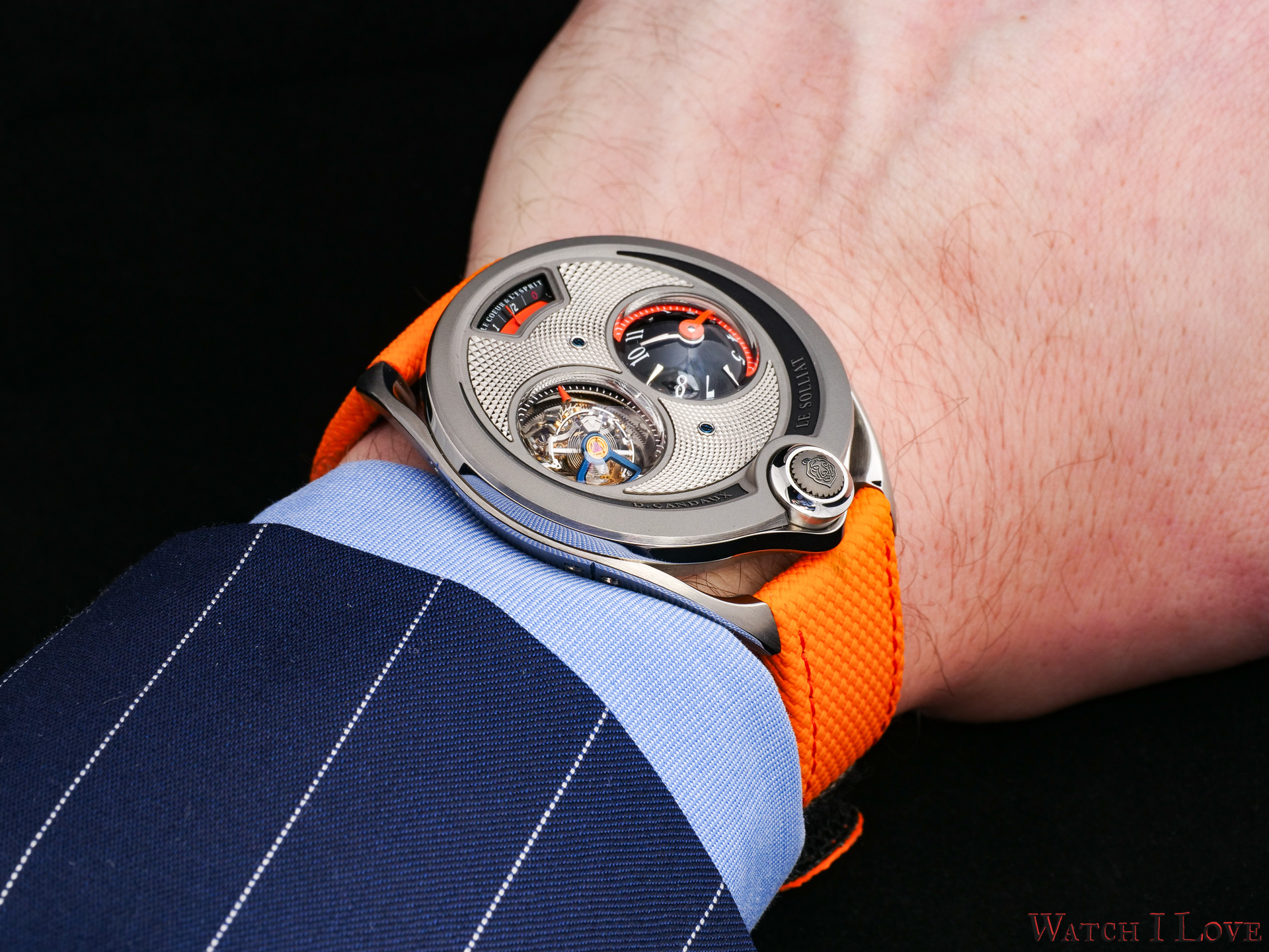 DC6 Half Hunter is an original concept. The unusual watch’s layout displays all the functions on top. I find the “magic crown” a cool gimmick – it looks great and it feels great. The automotive-inspired power reserve reminds me of the fuel gauges of old cars. The view of the tourbillon makes a nice balance with the domed time display.